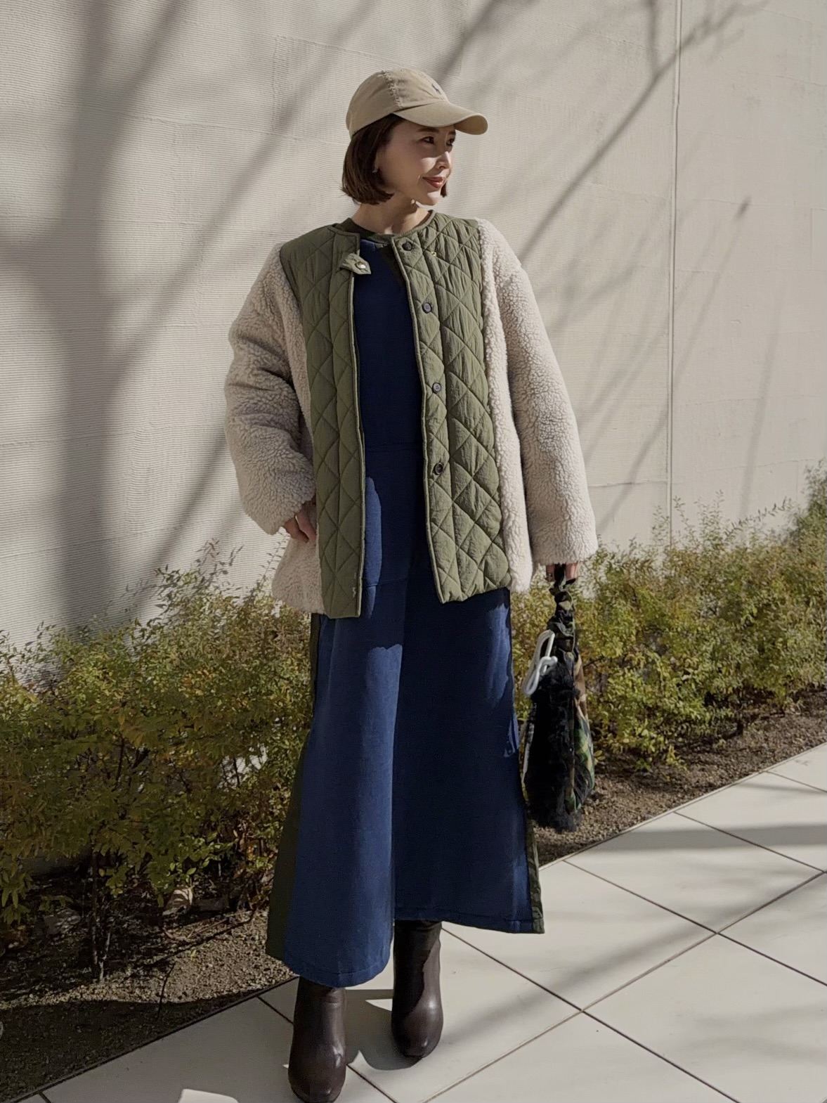 カーキ×ネイビーの配色が秋らしい楽ちんワンピース。