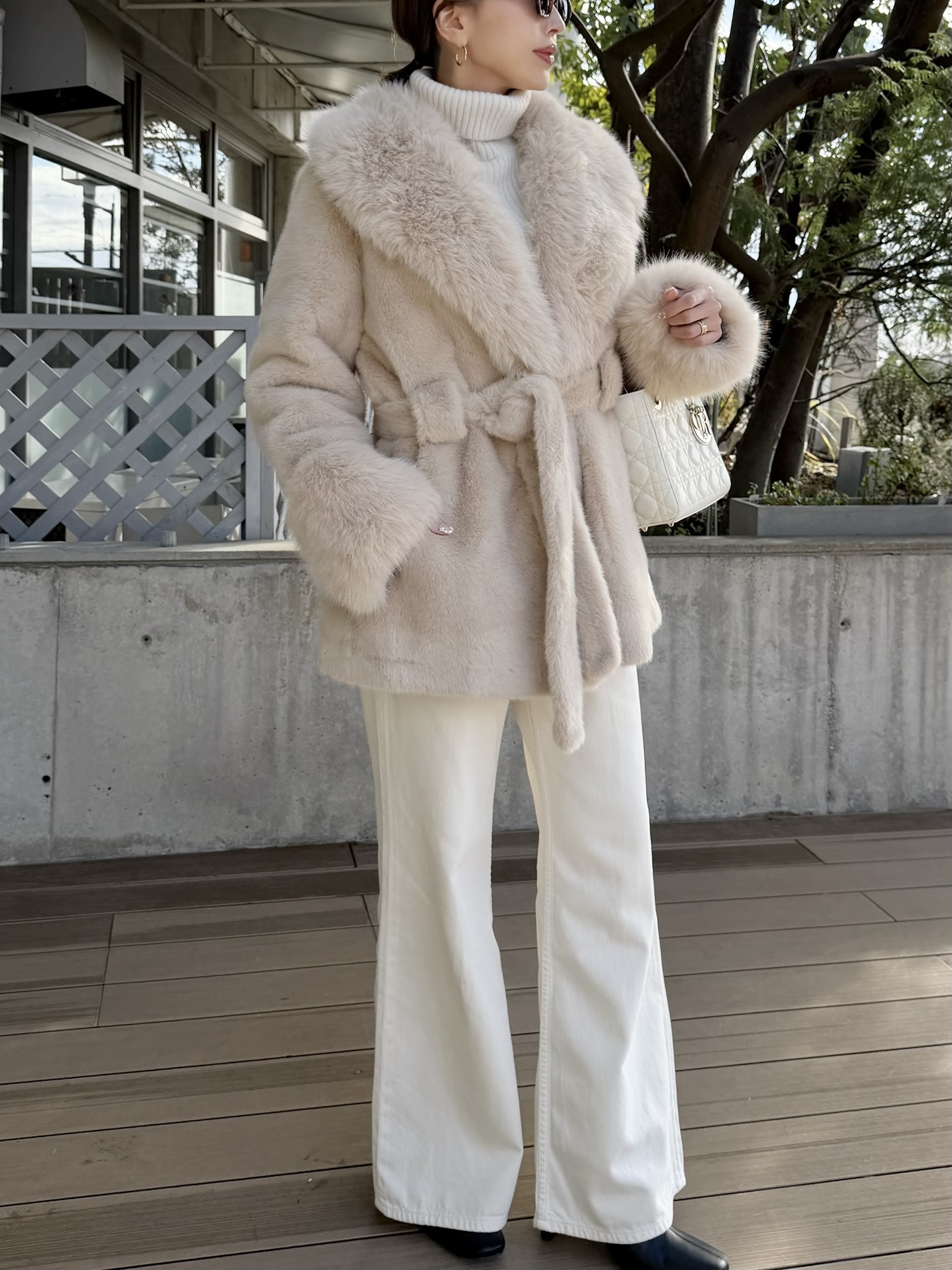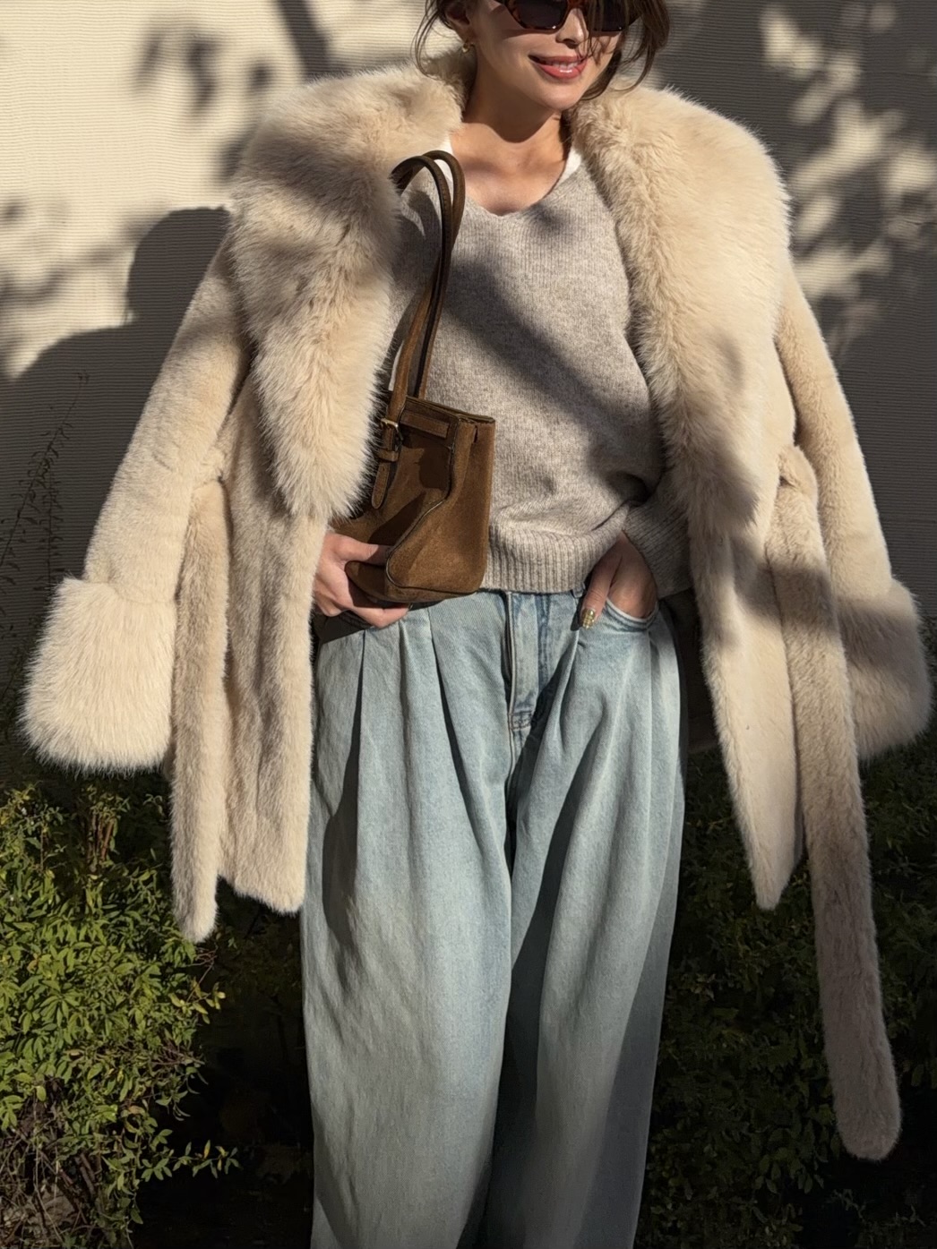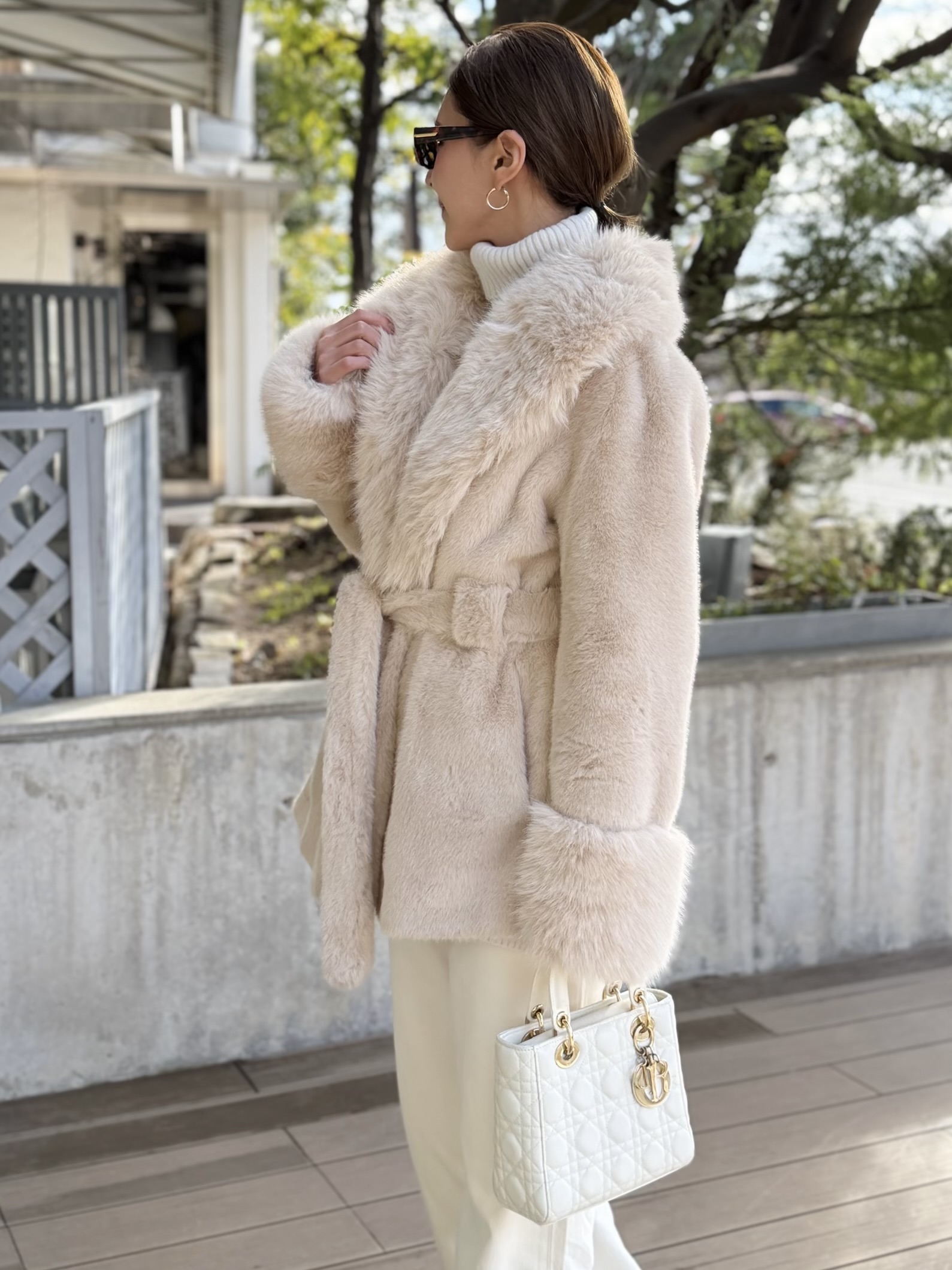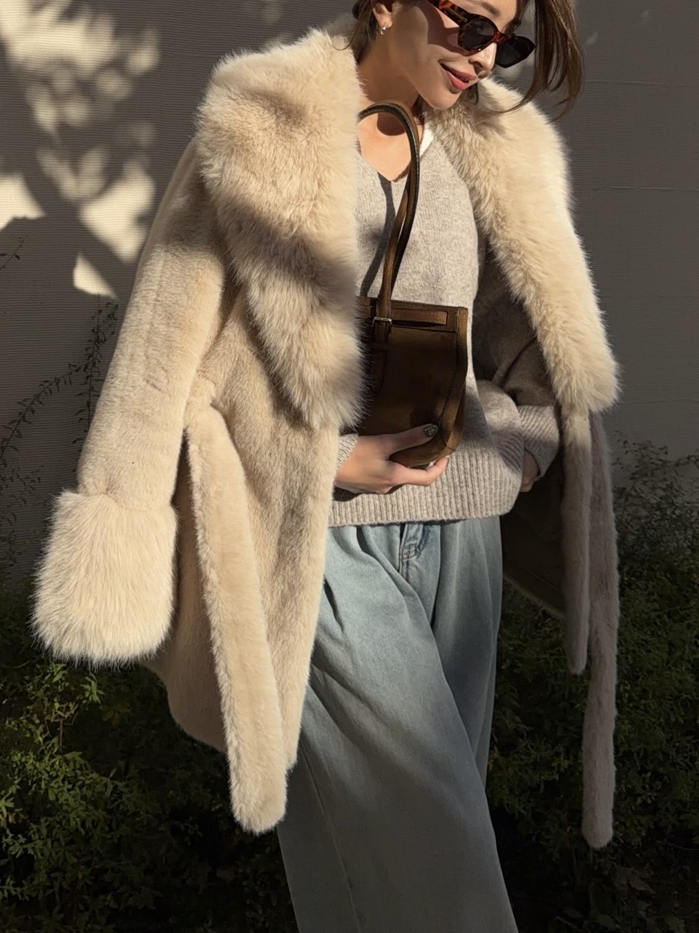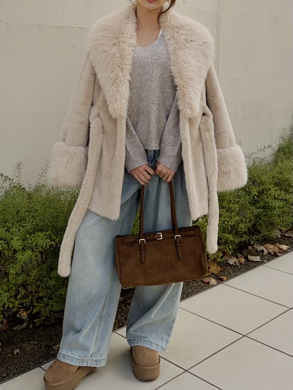 カジュアルにも綺麗目なスタイリングにもマッチするふわふわな肌触りのフェイクファーコート。