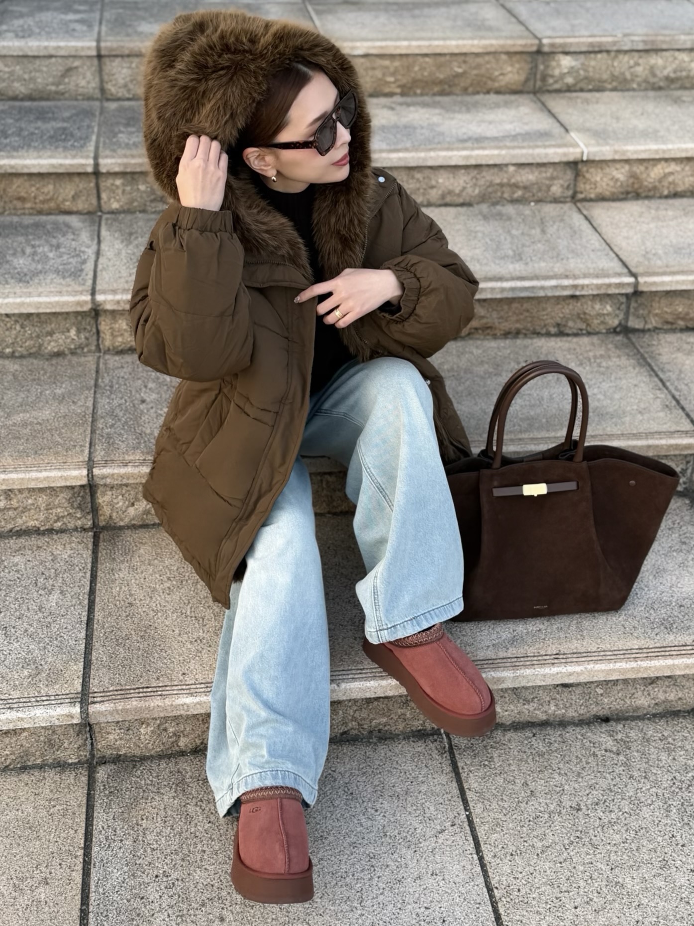 お顔周りのボリューミーなファーで小顔効果も叶えます。