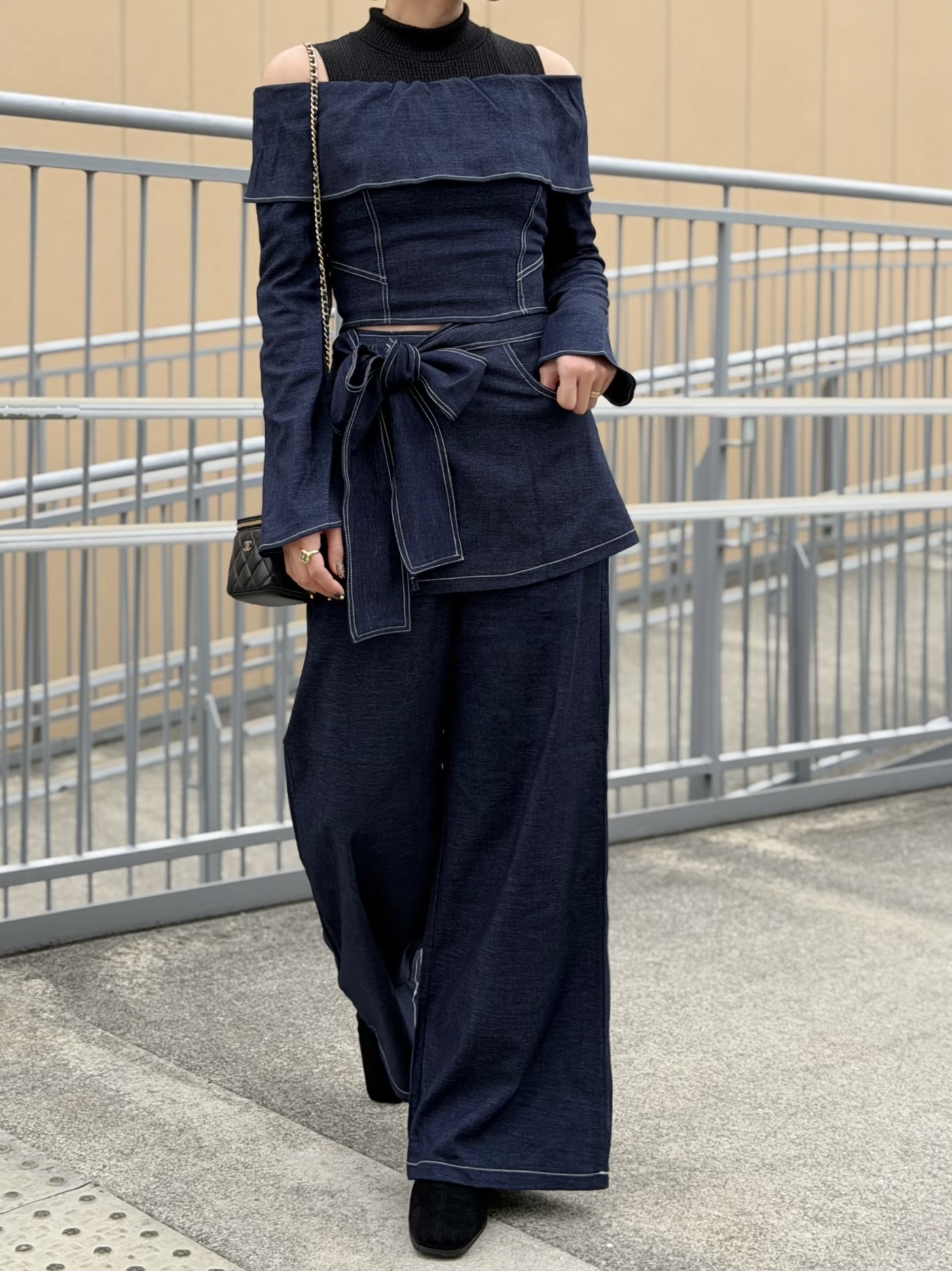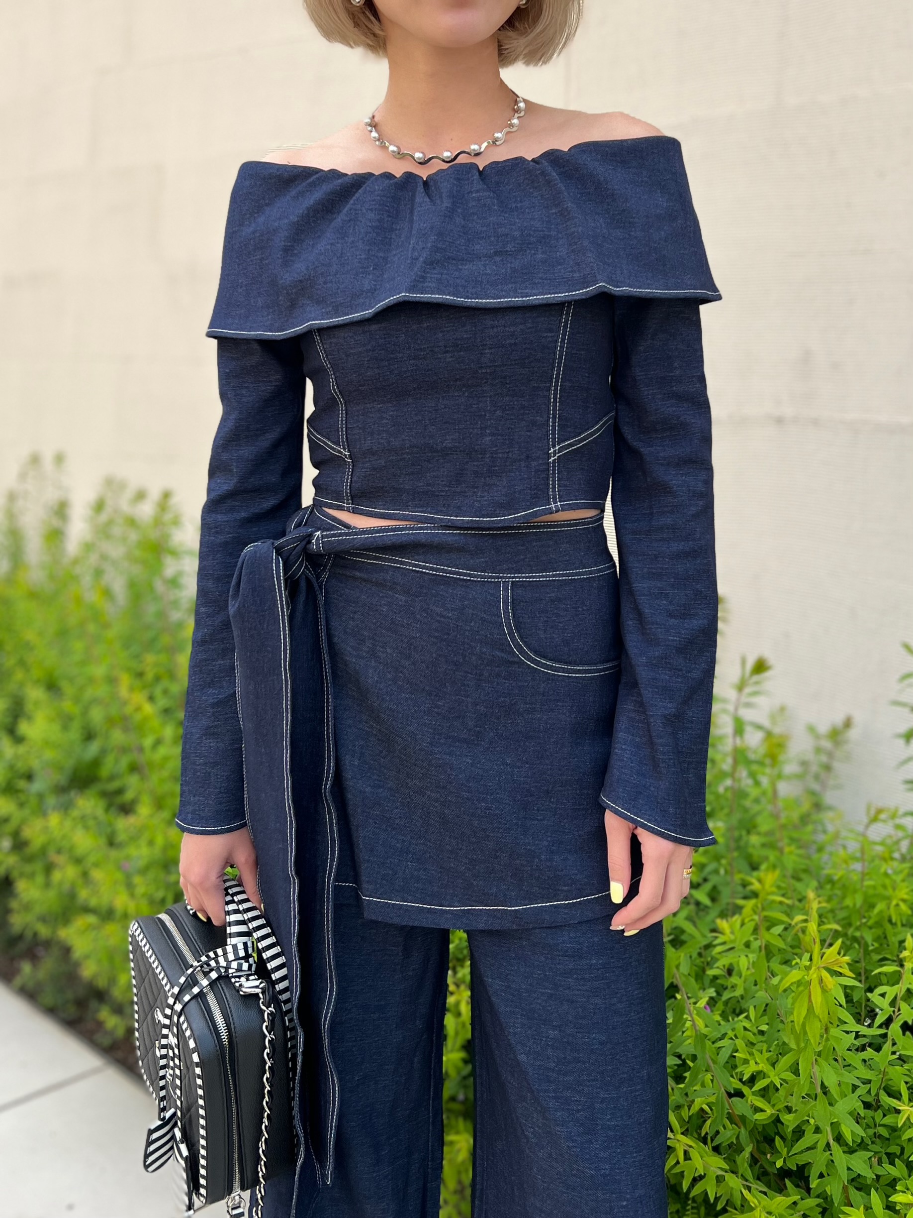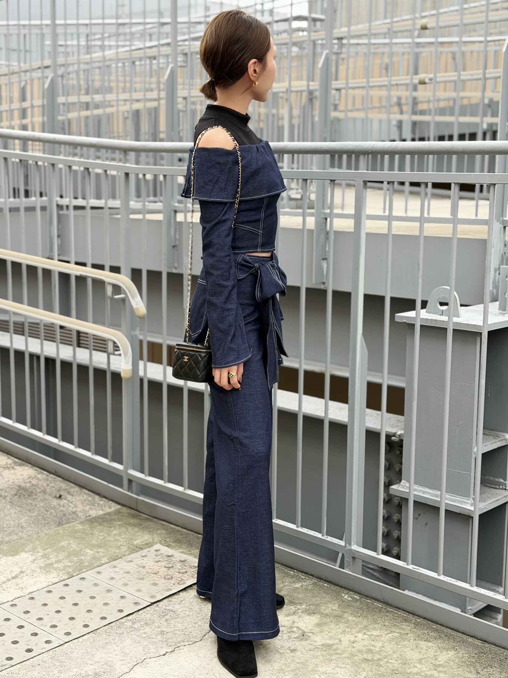 オフショルダーのデニムトップスはフリルデザインがポイント。
