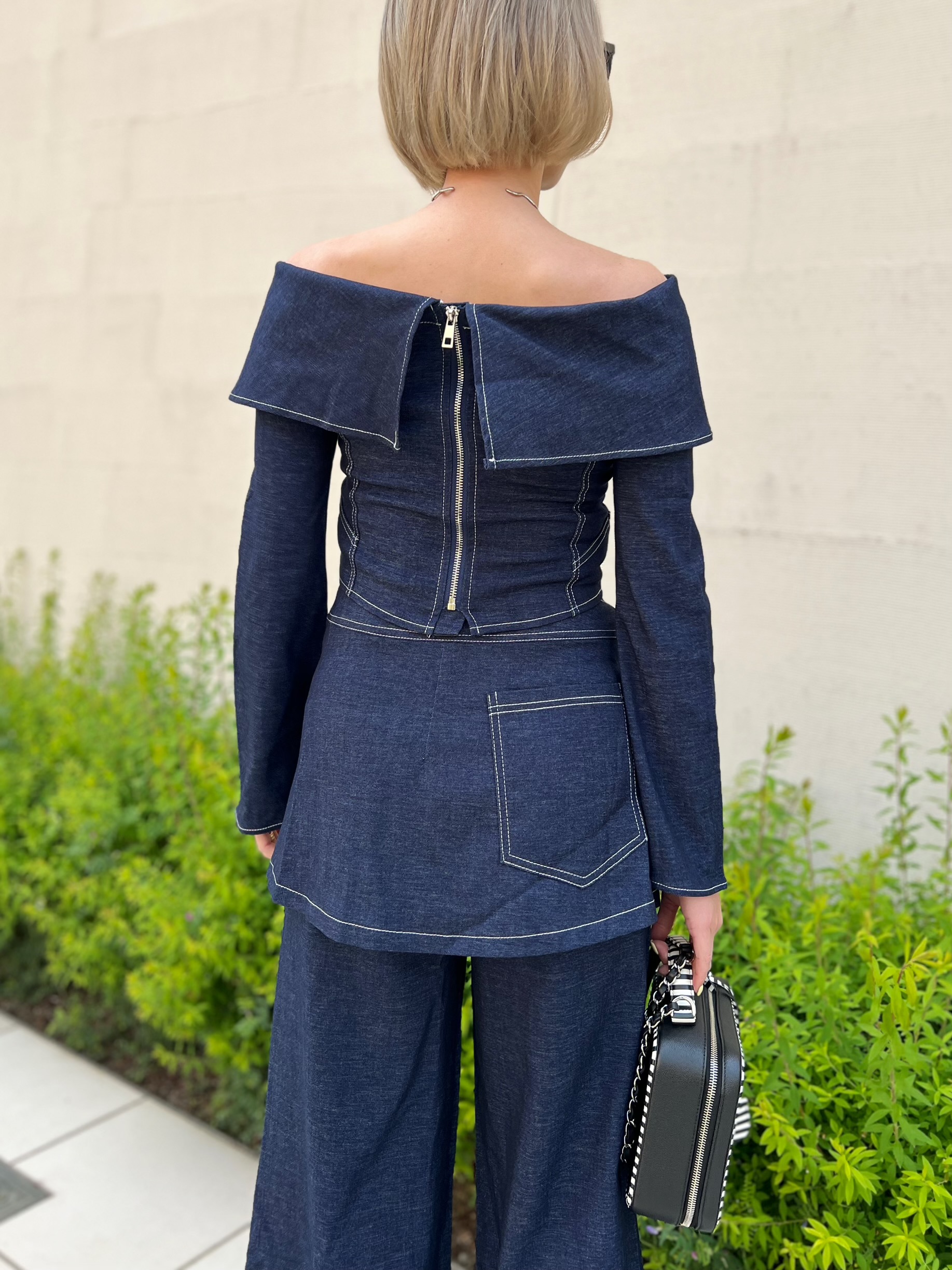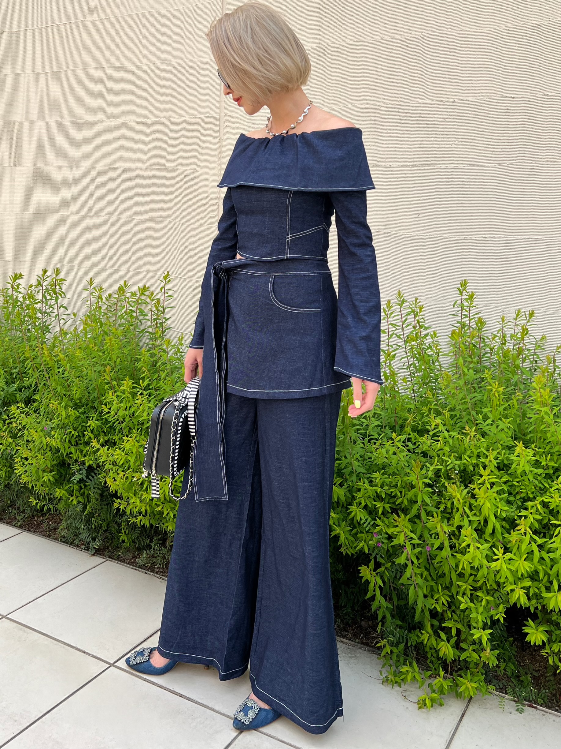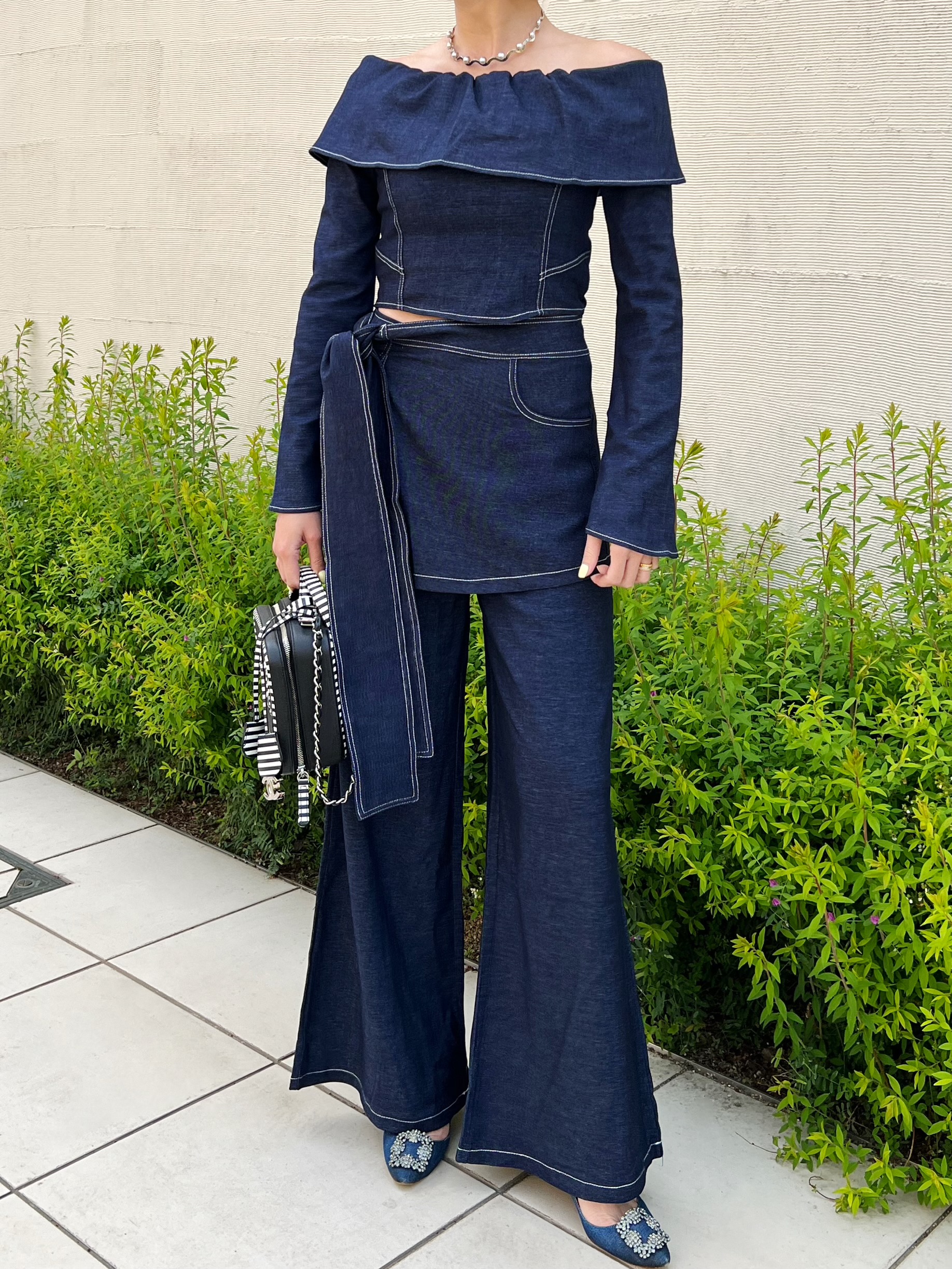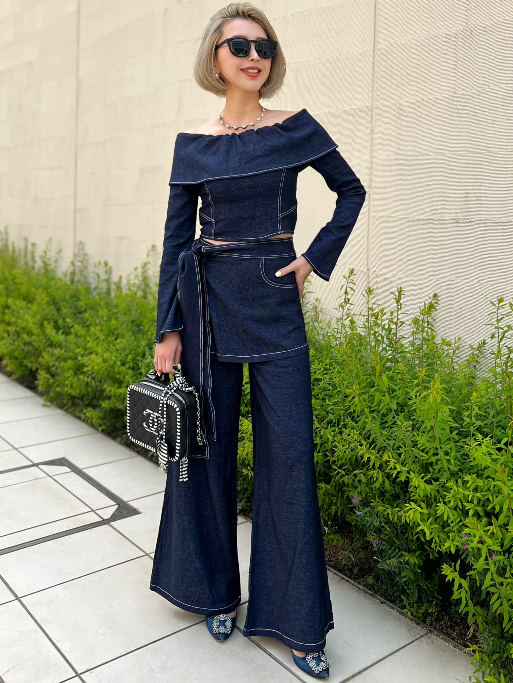 オフショルダーのデニムトップスはフリルデザインがポイント。