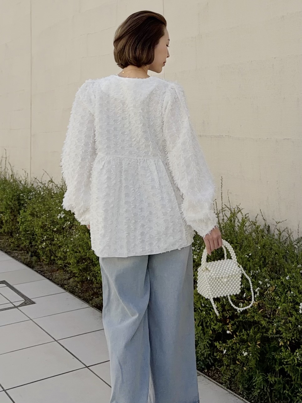 薄いブルーの色味が夏のスタイリングにマッチ。