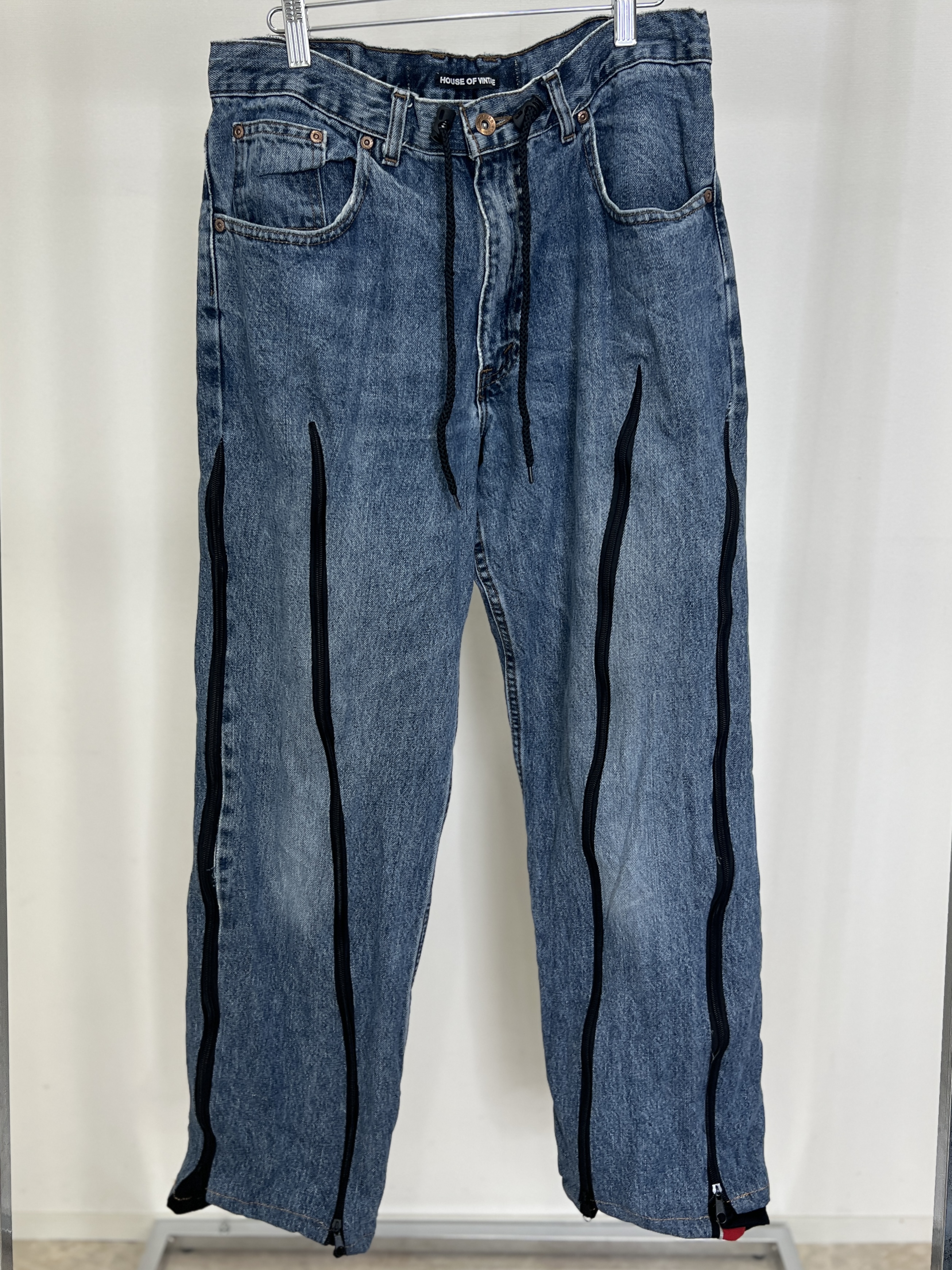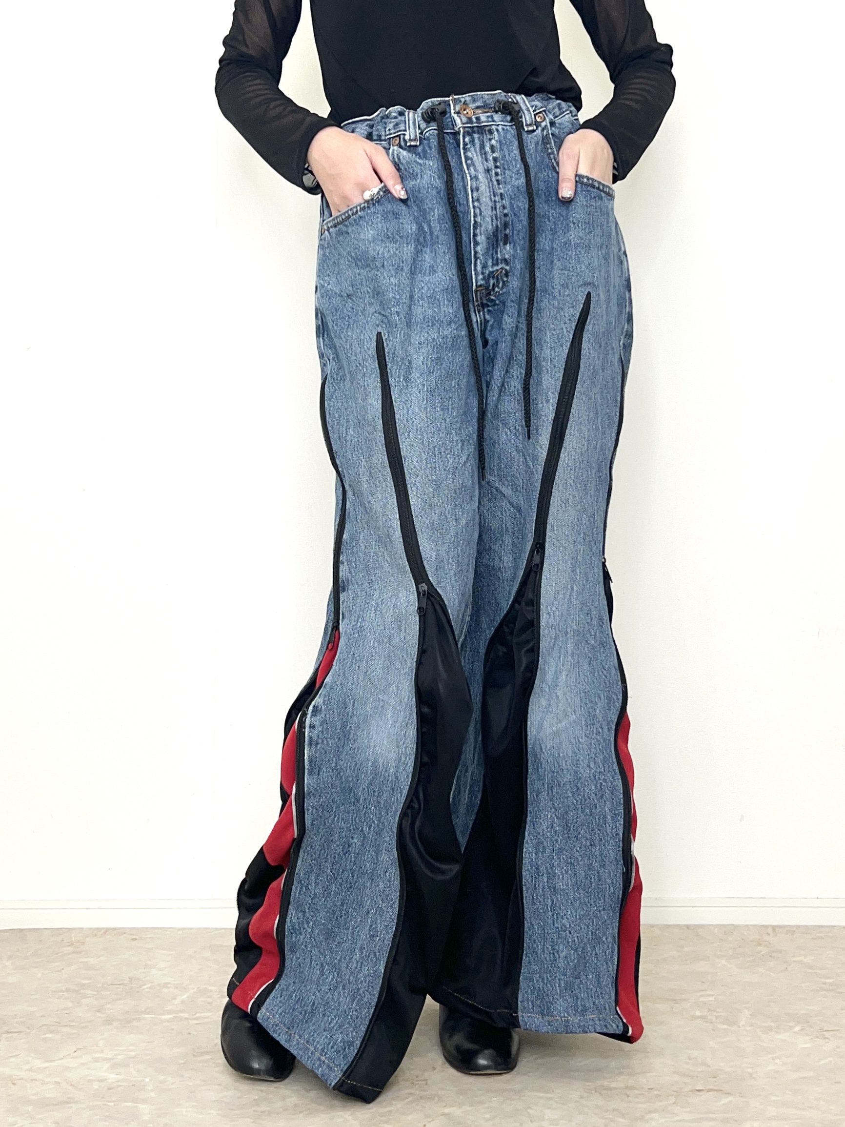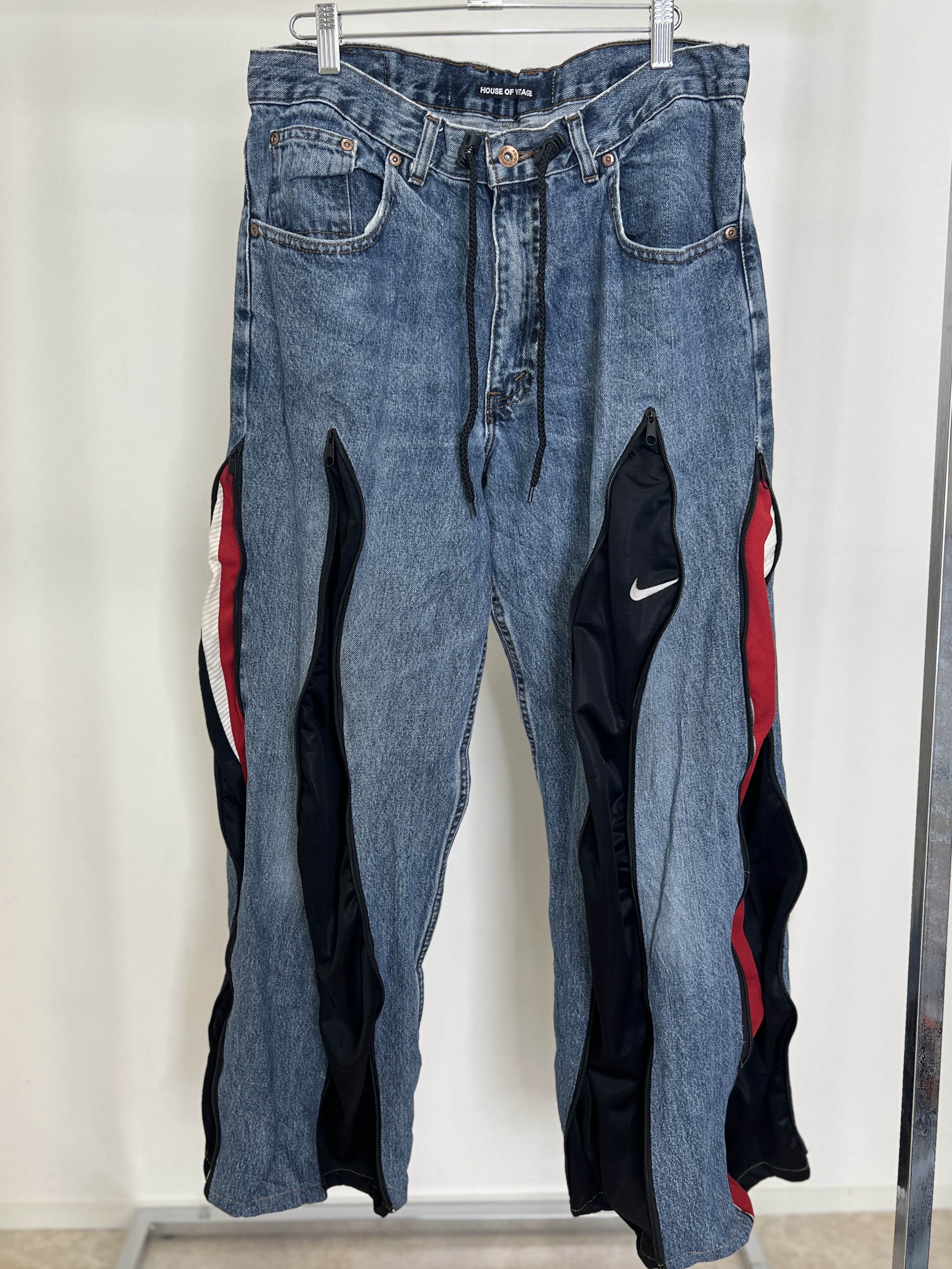 HOUSE OF VINTAGEが新たにスタート。 ヴィンテージデニムなどを用いてリメイクした全て1点物のアイテムを展開。 柄の出方やデニムの色落ちなど、同じものは一つとして無いあなただけの一着をお届けします。 米大手百貨店チェーンJ.C.PennyのプライベートブランドARIZONA JEAN COMPANYのデニムにNIKEのジャージを組合せたリメイクデニム。 ファスナーを全て閉じると綺麗目に、全て開けると裾に向かって広がるフレアシルエットに。 ドローコードでサイズ調節可能。 ファスナーの下げ具合でシルエットを変えて履いて頂けます。