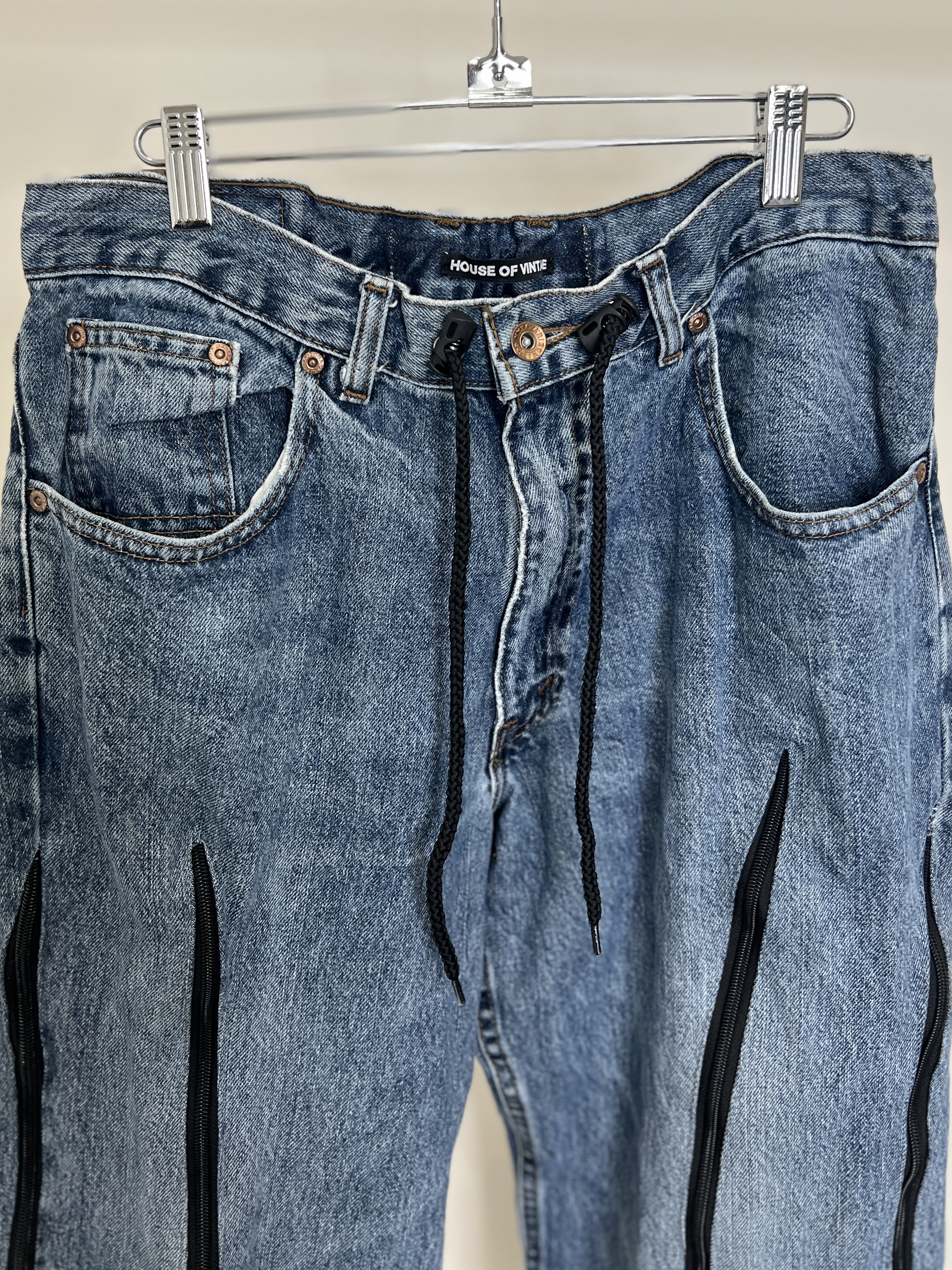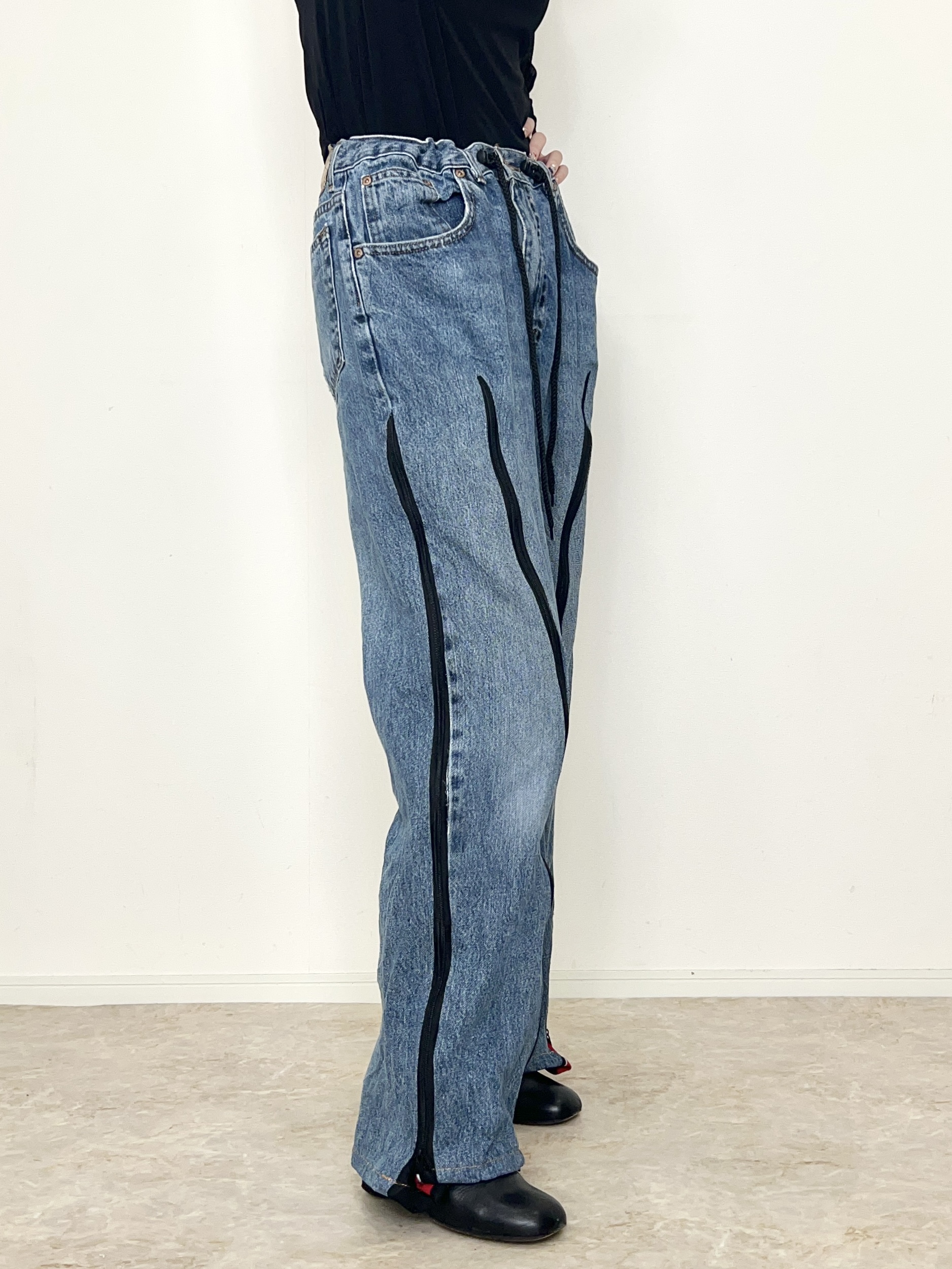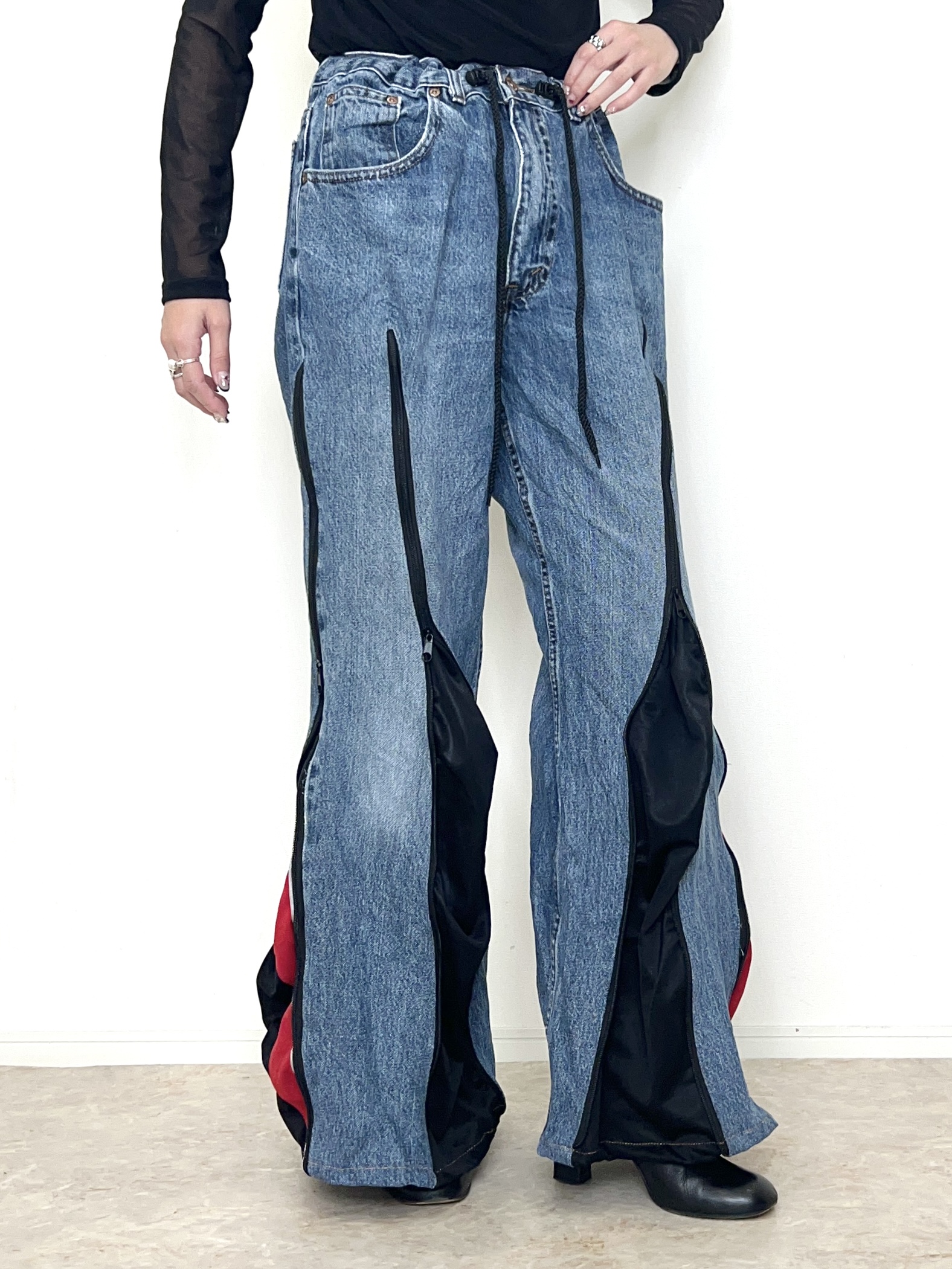 HOUSE OF VINTAGEが新たにスタート。 ヴィンテージデニムなどを用いてリメイクした全て1点物のアイテムを展開。 柄の出方やデニムの色落ちなど、同じものは一つとして無いあなただけの一着をお届けします。 米大手百貨店チェーンJ.C.PennyのプライベートブランドARIZONA JEAN COMPANYのデニムにNIKEのジャージを組合せたリメイクデニム。 ファスナーを全て閉じると綺麗目に、全て開けると裾に向かって広がるフレアシルエットに。 ドローコードでサイズ調節可能。 ファスナーの下げ具合でシルエットを変えて履いて頂けます。
