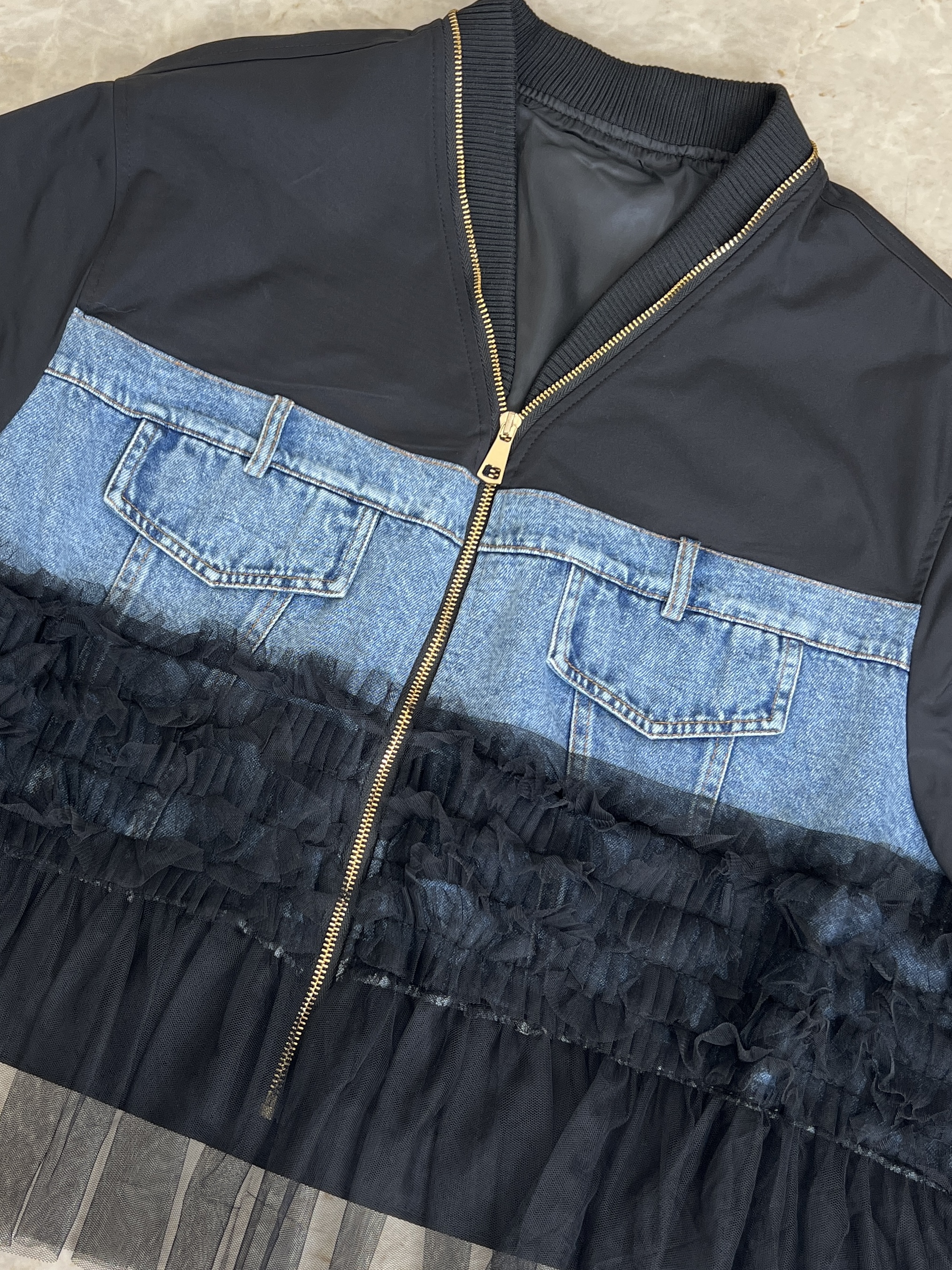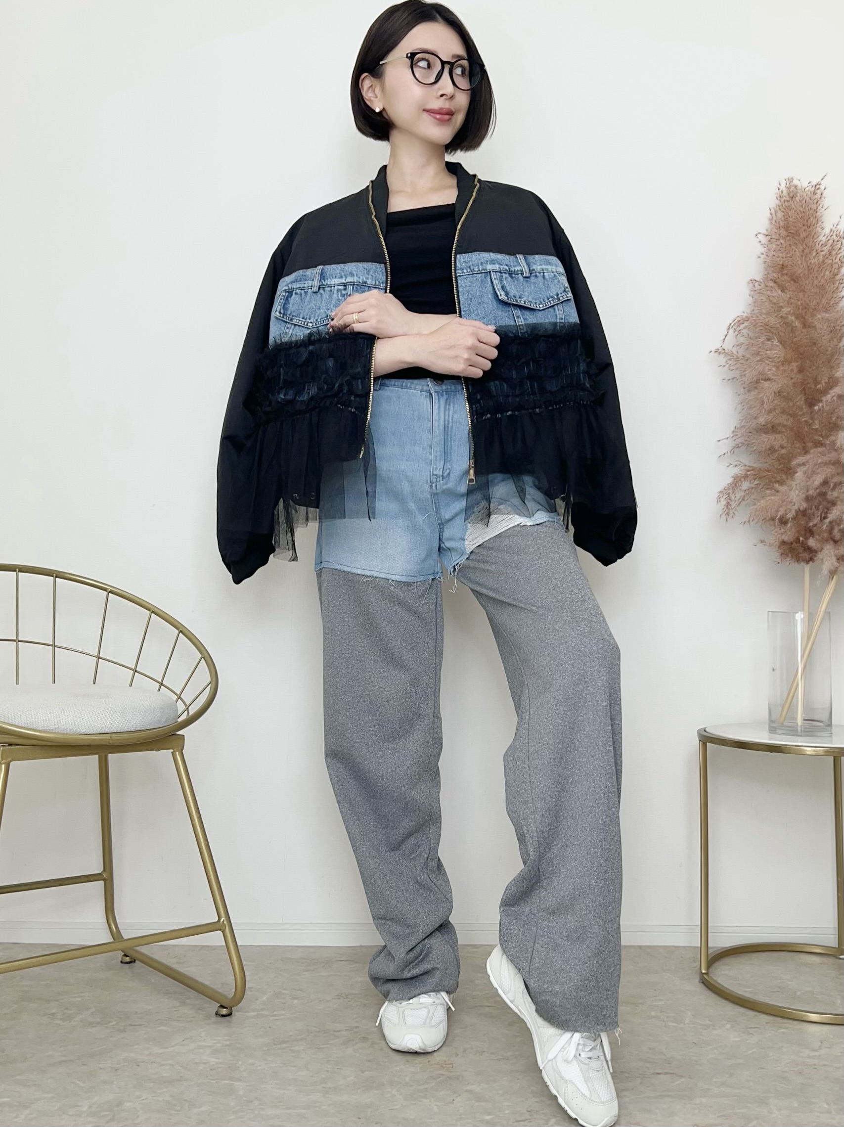 カジュアルなデニム切替のブルゾンに裾のチュールで女性らしさをプラス。