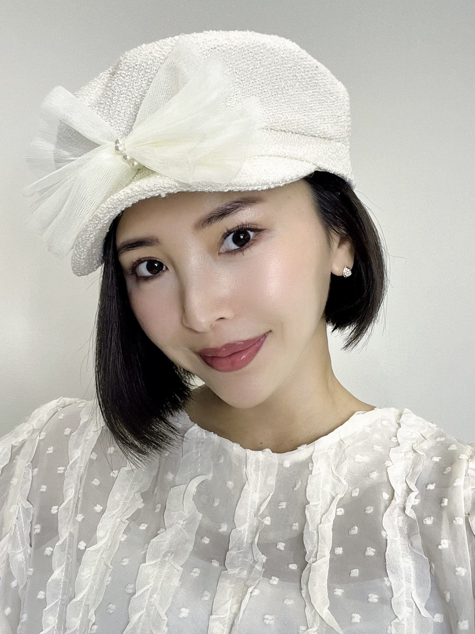 しっかりとしたツイード生地の上品キャスケット。取り外し可能なボリューミーなチュールリボンがポイント。優しいアイボリーのお色でフェミニンな雰囲気。シンプルなコーディネートのワンポイントにピッタリです。BIJOUXのBのプレートがさり気なくあしらわれています。小顔効果も嬉しいポイント◎【SIZE】頭周りサイズ約58cmブリム5cm【素材】本体:ポリエステル70%,ウール30%