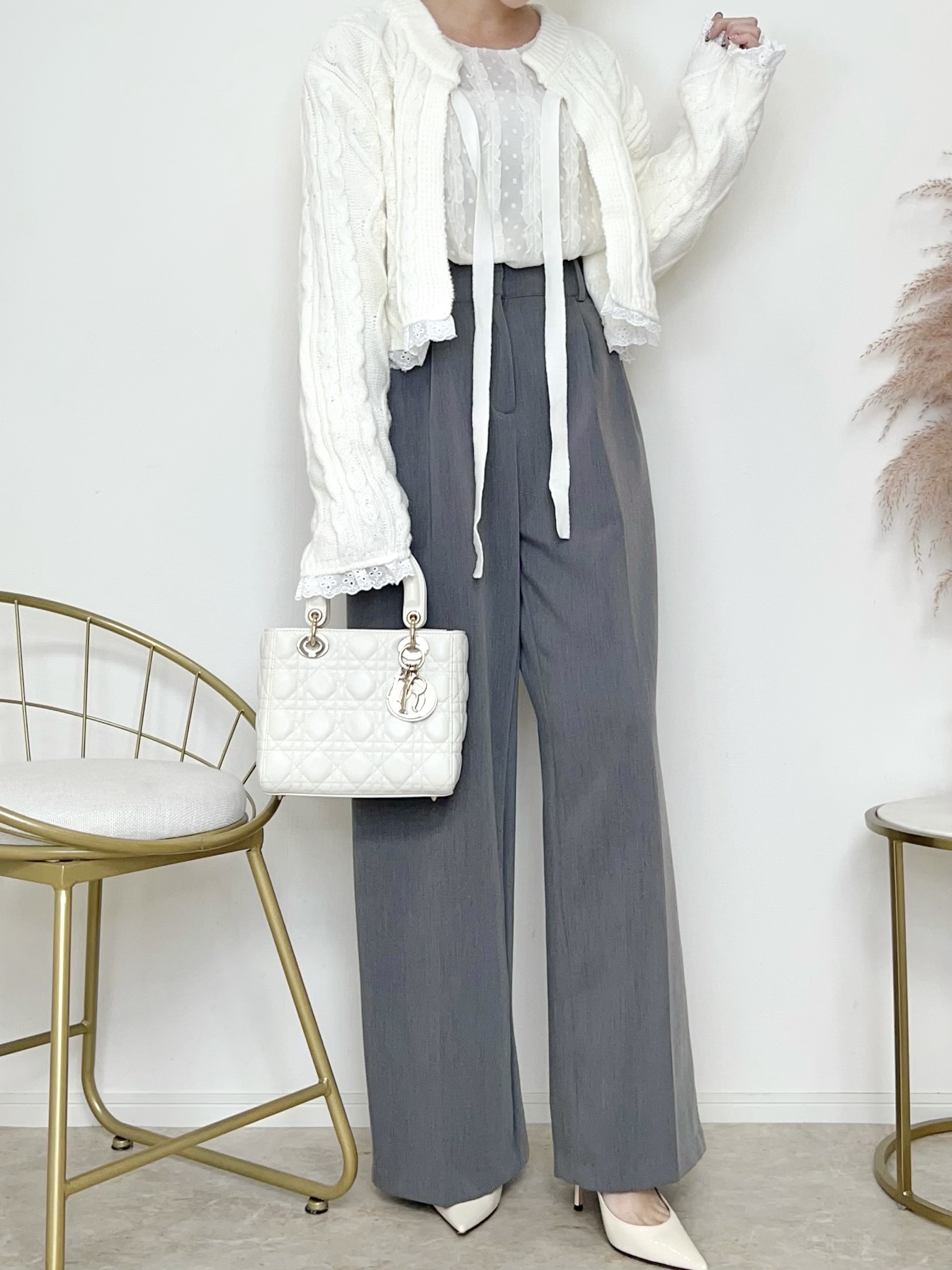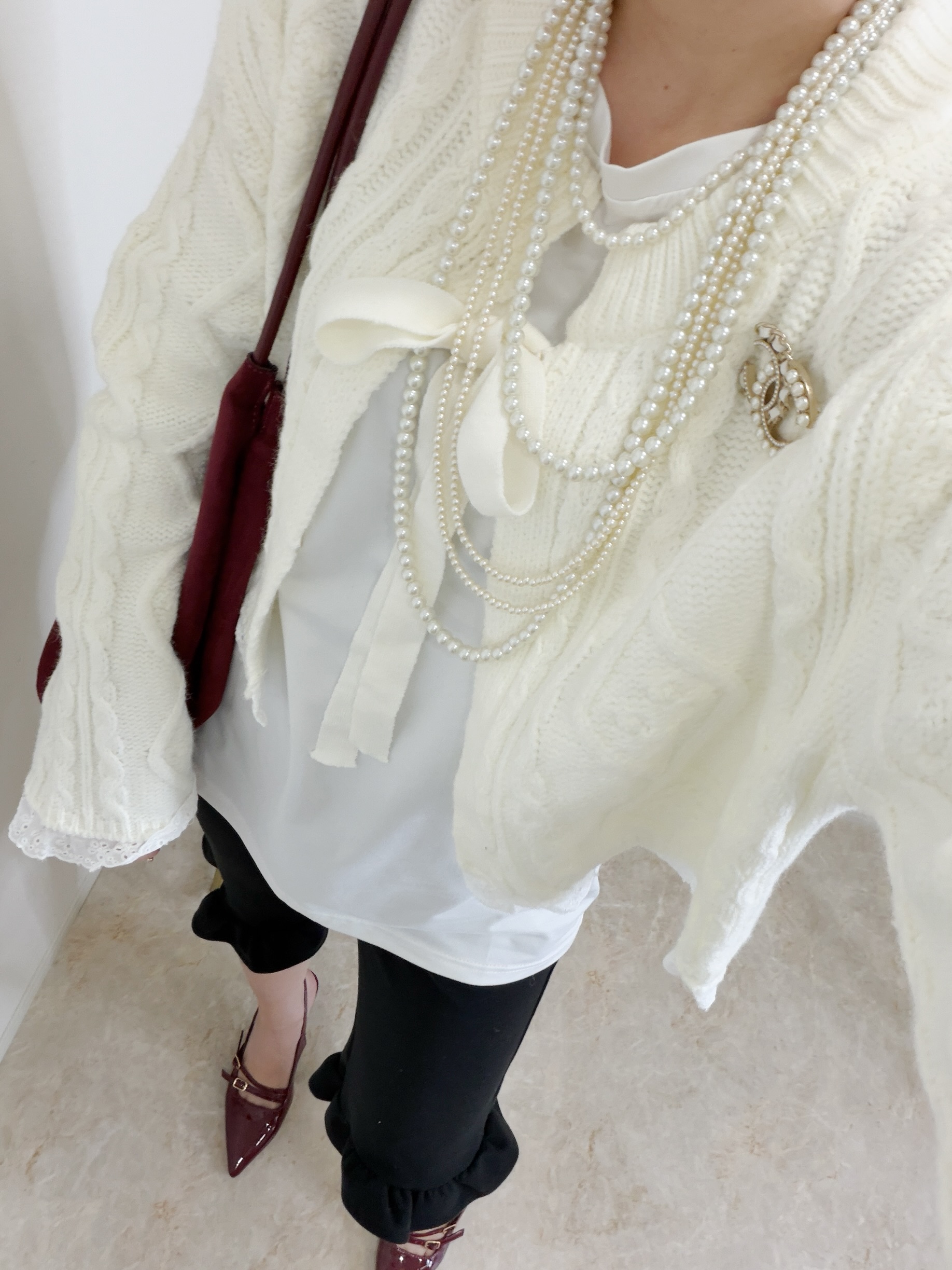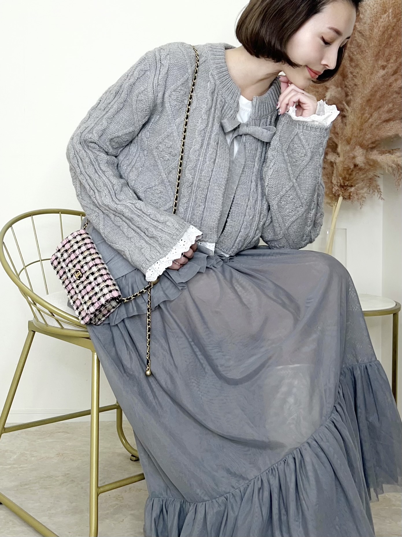 温かみのあるケーブルニットはほんのりレトロでガーリーな雰囲気を演出。