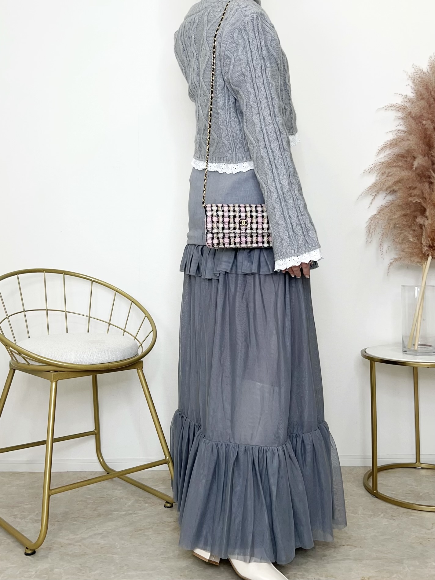 グレーのスタイリングで着用しているチュールスカート【Tulle frill skirt】
