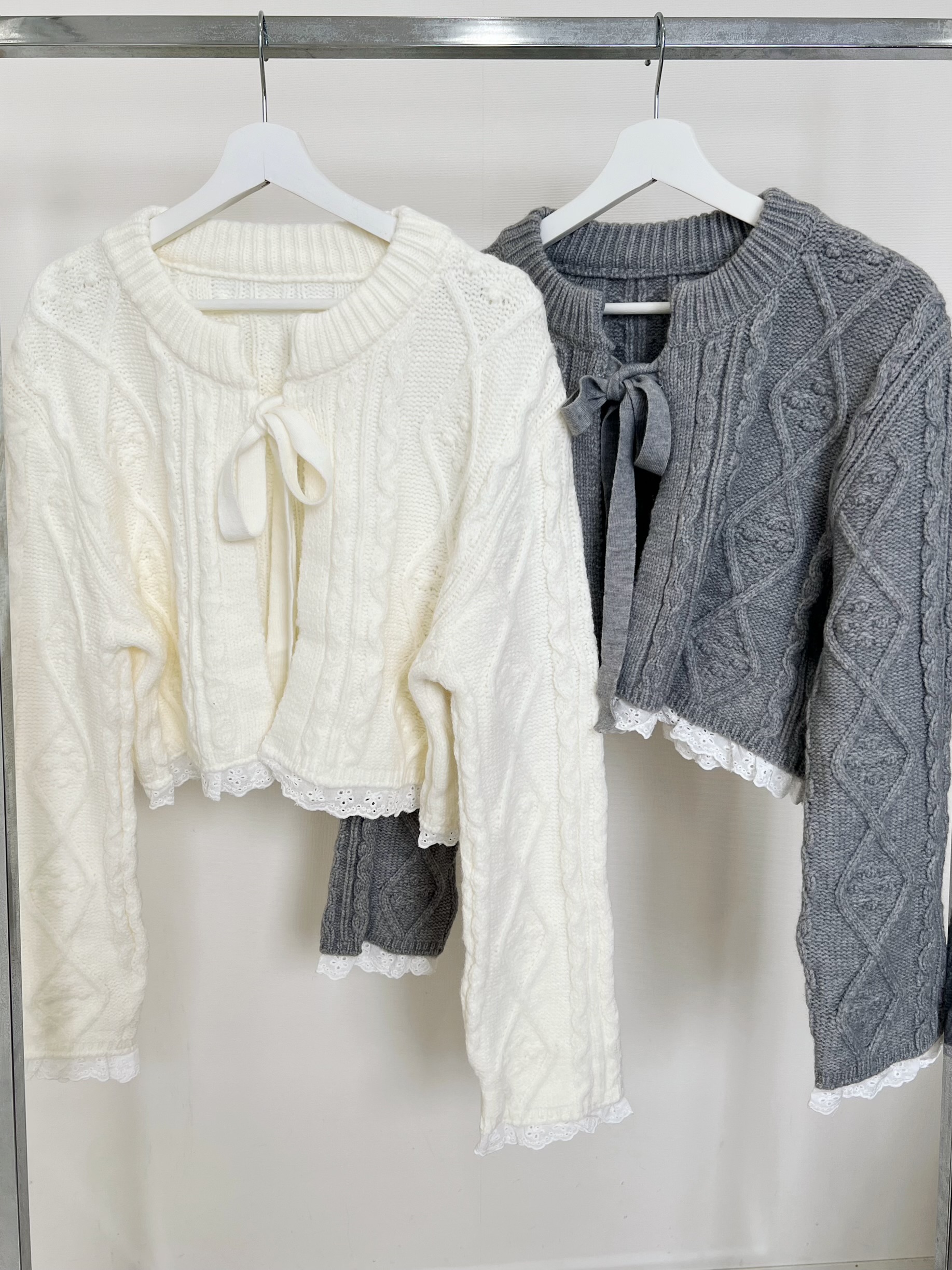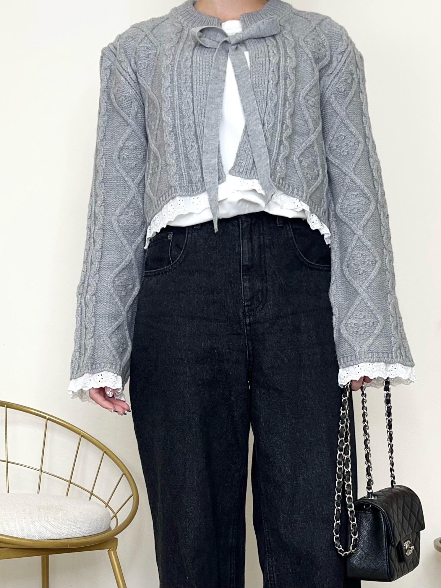 女心くすぐるコットンフリルが裾と袖口にあしらわれたカーディガン。温かみのあるケーブルニットはほんのりレトロでガーリーな雰囲気を演出。フロントのリボンもポイント。アイボリーとグレーの2カラー展開。グレーのスタイリングで着用しているチュールスカート【Tulle frill skirt】アイボリーのスタイリングで着用しているバイカーショーツ【Frill biker shorts】ブラウス【Frill blouse】ワンピース【50%OFF/Bib collar onepiece】も発売中です。アイボリーはワンサイズ大きめとなっております。サイズ感をご確認ください。STAFF:158cm【サイズ】(平置き採寸/約)【グレー】着丈42cm 肩幅46cm 身幅51cm 袖丈58cm【アイボリー】着丈45cm 肩幅48cm 身幅54cm 袖丈62cm【素材】ナイロン20%,ポリエステル25%,ビスコース55% ■クロネコ代金後払いをご利用のお客様■商品到着後に請求書(払込用紙)が到着します。14日以内にお支払いをお願いします。全国の主要なコンビニで、請求書をレジに持っていくだけでお支払いが可能です。全国の郵便局でも同じ請求書でお支払いできます。※ご請求書が圧着ハガキタイプの場合、郵便局でのお支払いはできません。※弊社の銀行口座宛にお振込頂くものでは御座いません。ご注意下さい。