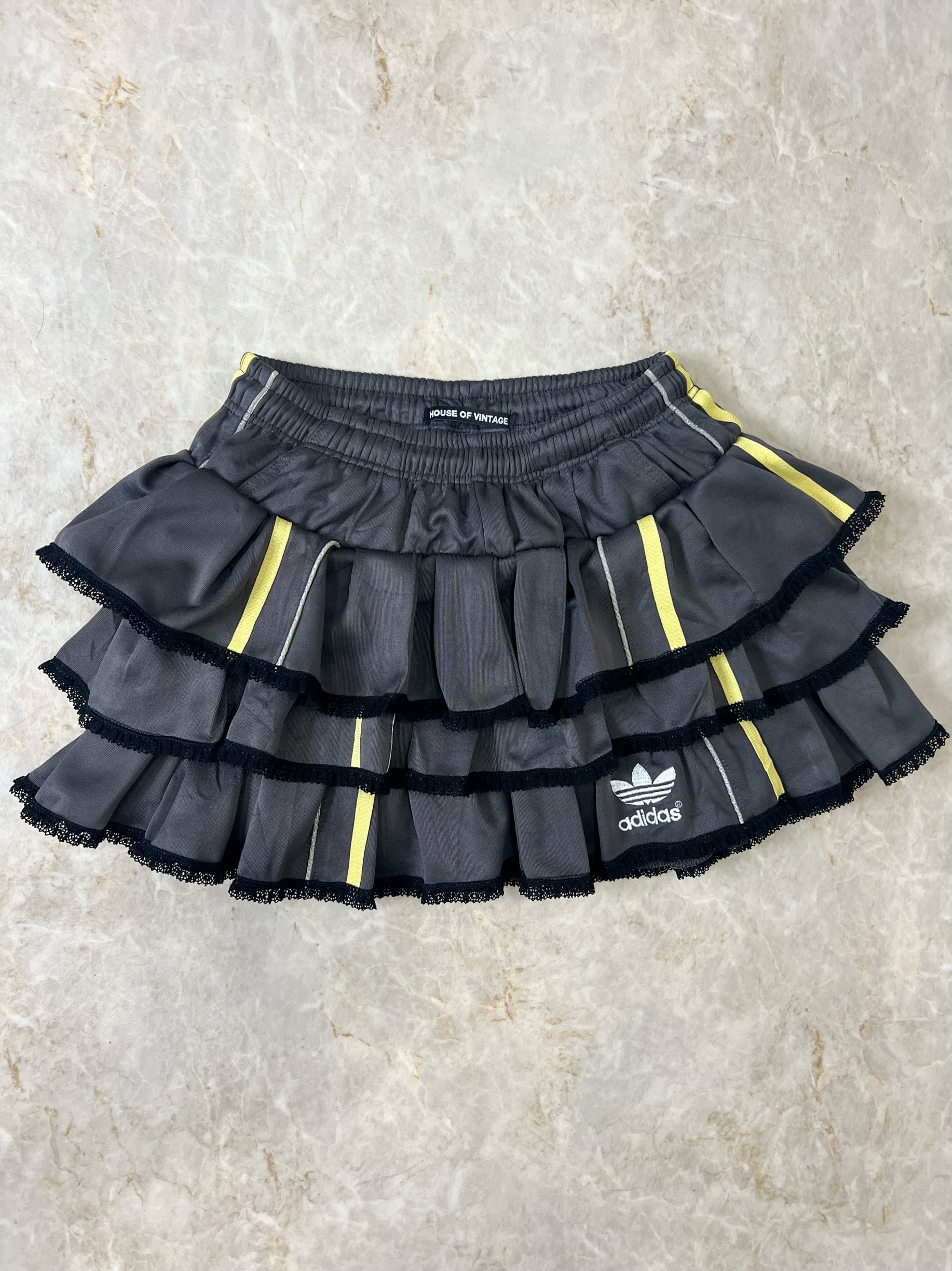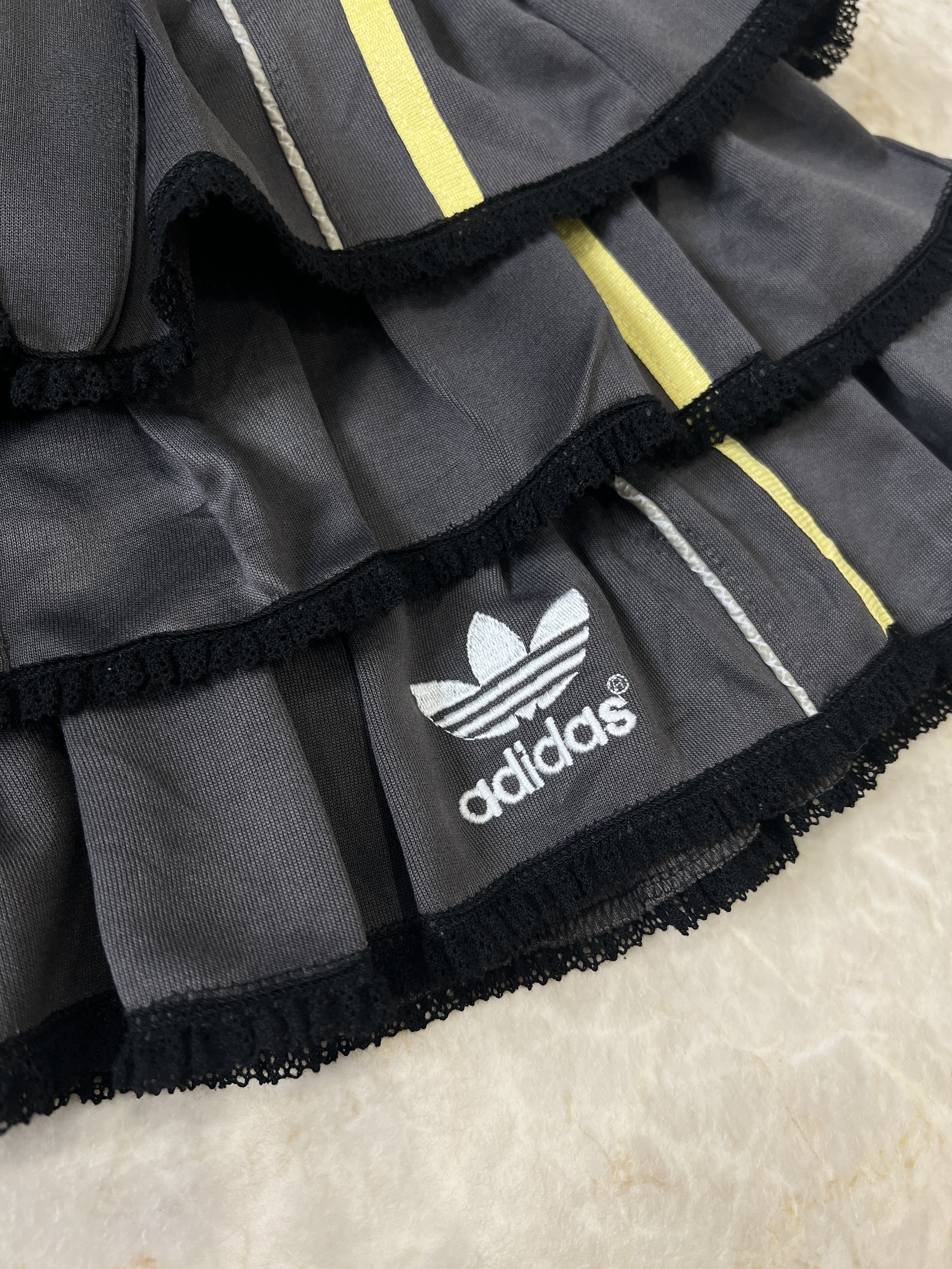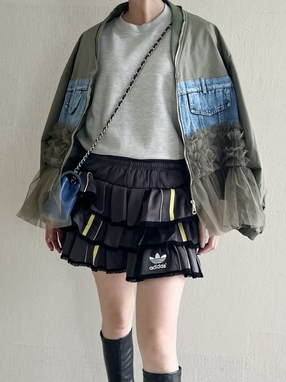 ダークグレーとブラウンの中間色のような秋冬にぴったりなadidasのジャージを裁断し、スカートにリメイクしました。フリルにコットンフリルを載せて少し甘さをプラス。ふわっと広がるシルエットが可愛いスカートです。ウエスト部分はゴムなので腰履きしても。1枚はもちろん、デニムやバイカーパンツの上にレイヤードさせたスタイリングもお勧めです。こちらは1点物のアイテムとなります。同じものは一つとして無いあなただけの一着をお届けします。※こちらの商品はUSEDの生地を使用しております。多少の汚れやほつれ等ダメージがある場合が御座います。商品特有の風合いをご理解、ご了承頂いた上でのご注文をお願い致します。返品交換は対応致しかねます。神経質な方や商品の特性をご理解、ご了承頂けない方は手に取ってご購入頂けるショップでのご購入をお願い致します。STAFF:158cm【サイズ】(平置き採寸)スカート丈34.5cm ウエスト32cm(ゴムの為伸縮) ヒップ43cm【素材】本体:ポリエステル87%,コットン13%■クロネコ代金後払いをご利用のお客様■商品到着後に請求書(払込用紙)が到着します。14日以内にお支払いをお願いします。全国の主要なコンビニで、請求書をレジに持っていくだけでお支払いが可能です。全国の郵便局でも同じ請求書でお支払いできます。※ご請求書が圧着ハガキタイプの場合、郵便局でのお支払いはできません。※弊社の銀行口座宛にお振込頂くものでは御座いません。ご注意下さい。
