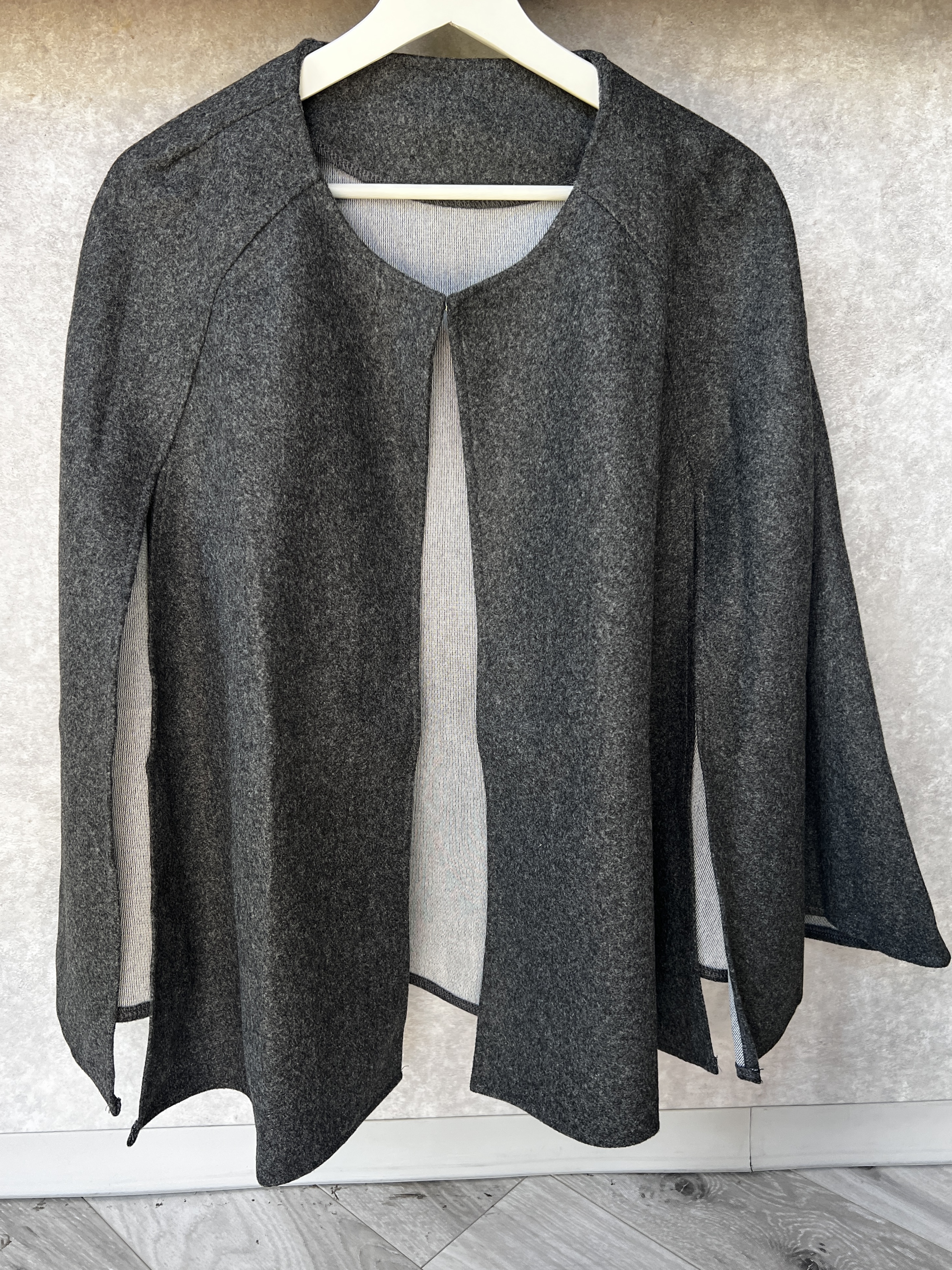 上品でエレガントな雰囲気漂うケープジャケット。Aラインシルエットで体型カバーも叶えてくれる一着です。タートルニットや、ノーカラーのレザージャケットにレイヤードさせても。厚手ニットの上にもさらっと羽織れます。カラーはシックでこなれ感を演出するダークグレー。フロントホック付き。着回しの効く一枚あると便利な万能アウターです。 STAFF:158cm【サイズ】(平置き採寸)着丈71cm 身幅70cm 【素材】ポリエステル100%■クロネコ代金後払いをご利用のお客様■商品到着後に請求書(払込用紙)が到着します。14日以内にお支払いをお願いします。全国の主要なコンビニで、請求書をレジに持っていくだけでお支払いが可能です。全国の郵便局でも同じ請求書でお支払いできます。※ご請求書が圧着ハガキタイプの場合、郵便局でのお支払いはできません。※弊社の銀行口座宛にお振込頂くものでは御座いません。ご注意下さい。