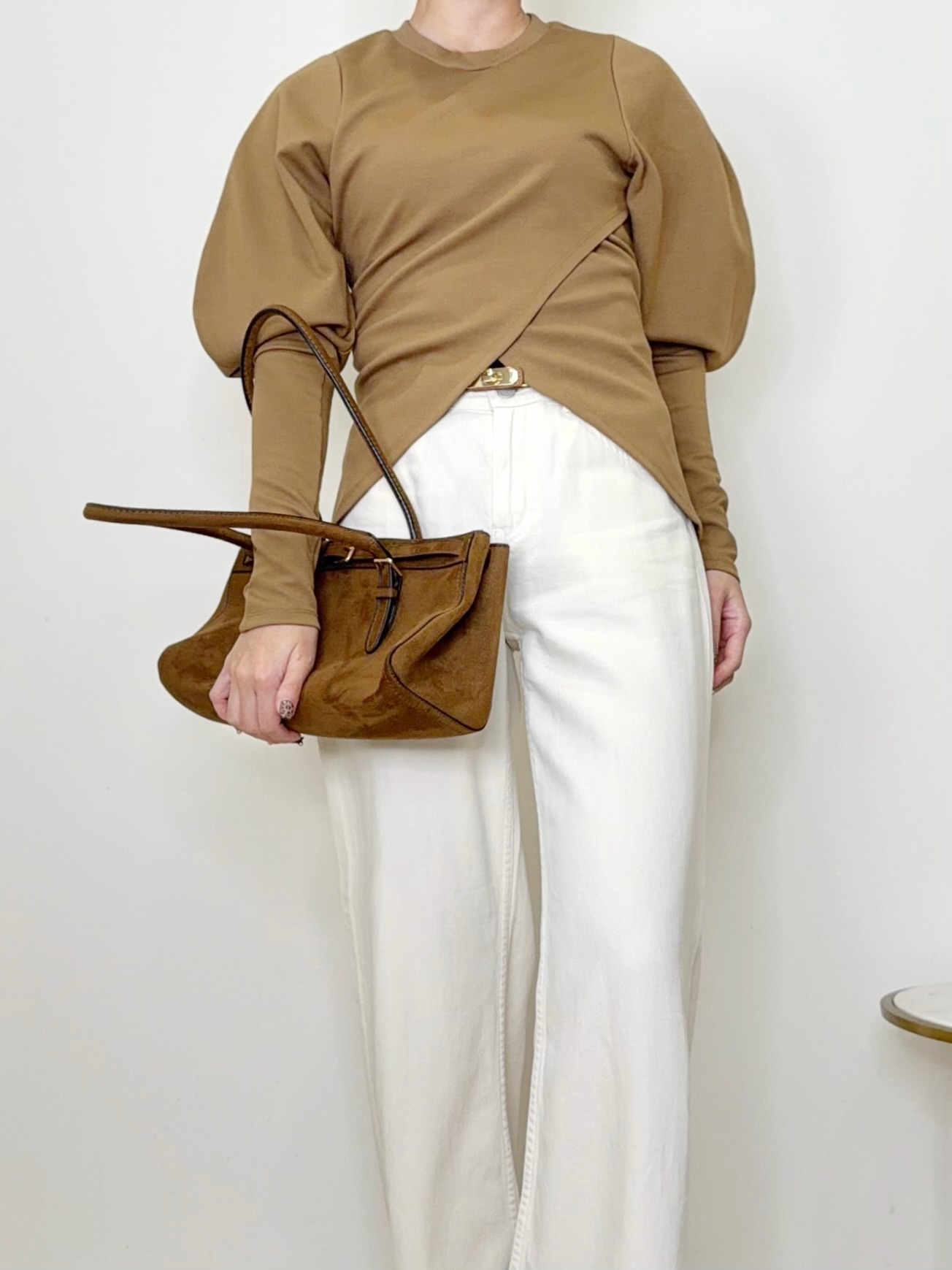 フロントのクロスデザインがポイント。ハイウエストのボトムスと好相性。