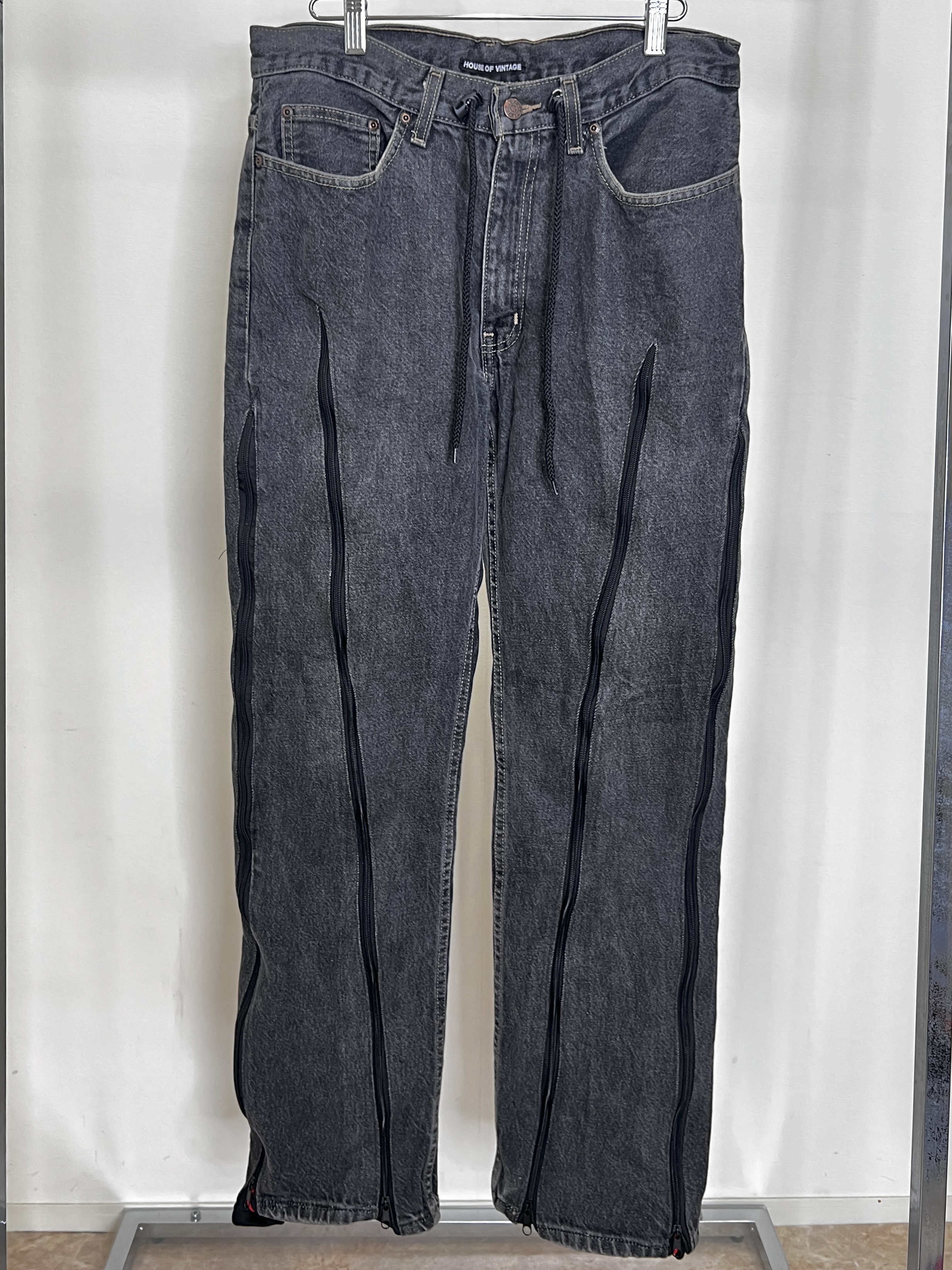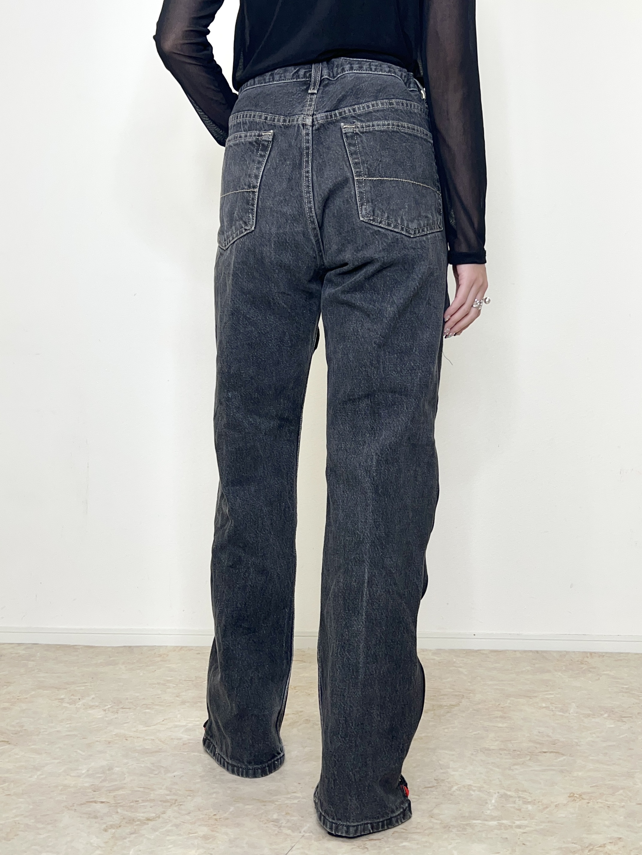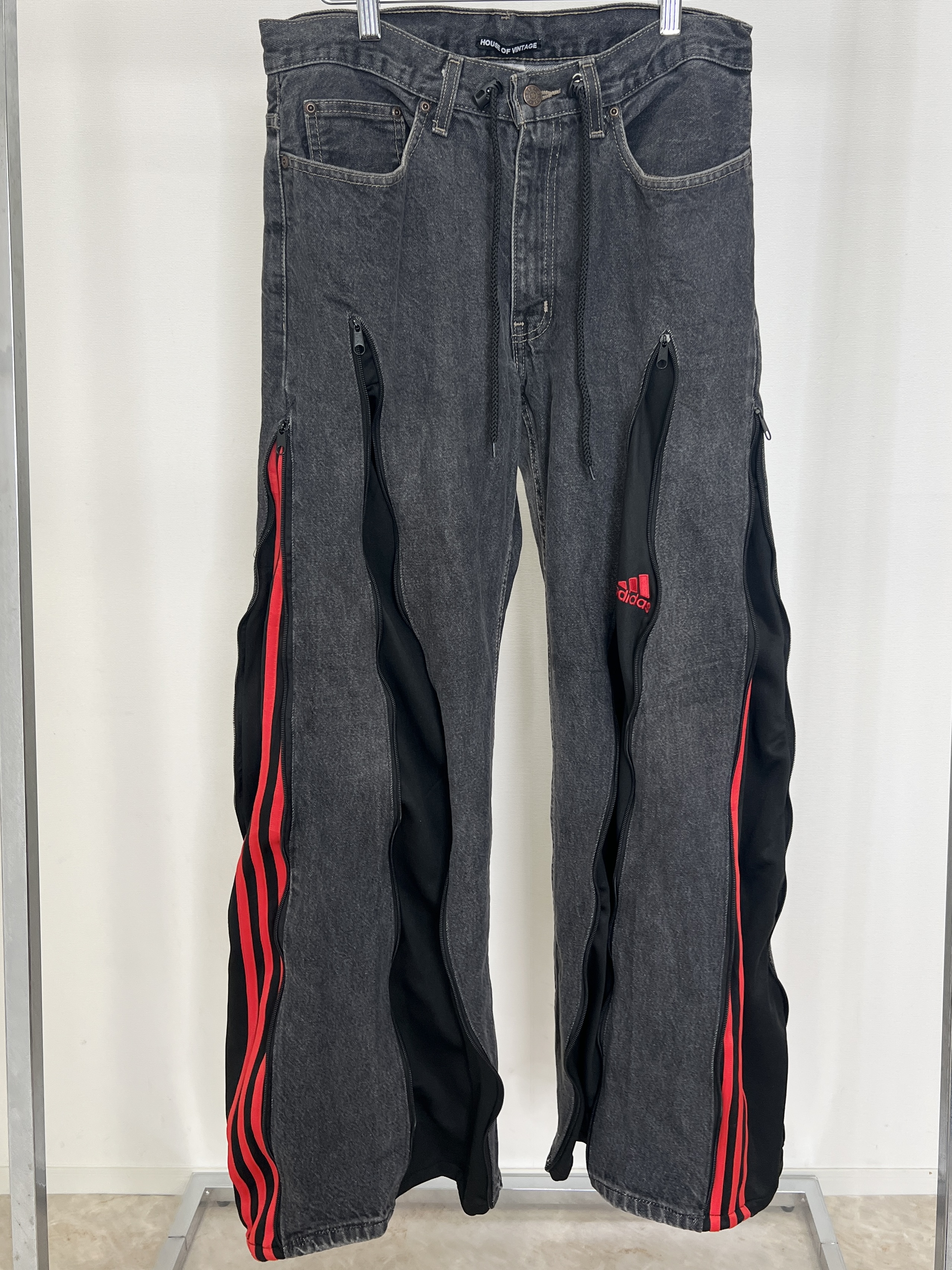 HOUSE OF VINTAGEが新たにスタート。ヴィンテージデニムなどを用いてリメイクした全て1点物のアイテムを展開。柄の出方やデニムの色落ちなど、同じものは一つとして無いあなただけの一着をお届けします。 こちらのパンツはズボン丈が長めの為、高身長の方や高いヒールを履かれる方にお勧めです。ユニセックスで着用可能です。※着用画像では158cm,6cmのヒールを履いております。 ブラックデニムにadidasのジャージを組合せたリメイクデニム。ファスナーを全て閉じると綺麗目に、全て開けると裾に向かって広がるフレアシルエットに。ドローコードでサイズ調節可能。ファスナーの下げ具合でシルエットを変えて履いて頂けます。※こちらは大き目のサイズ感となっております。男性の方も着用可能です。※こちらの商品はヴィンテージのデニムや生地を使用しております。多少の汚れやほつれ等ダメージがある場合が御座います。ヴィンテージ特有の風合いをご理解、ご了承頂いた上でのご注文をお願い致します。ヴィンテージ商品の返品交換は対応致しかねます。神経質な方や商品の特性をご理解、ご了承頂けない方は手に取ってご購入頂けるショップでのご購入をお願い致します。STAFF:158cm【サイズ】(平置き採寸/ファスナーを閉じた状態で採寸)総丈105cm ウエスト40cm(ドローコードでサイズを小さくできます) ヒップ51cm 股下80cm 股上28cm ワタリ30cm 裾幅 22cm【素材】本体:コットン、ジャージ:ポリエステル■クロネコ代金後払いをご利用のお客様■商品到着後に請求書(払込用紙)が到着します。14日以内にお支払いをお願いします。全国の主要なコンビニで、請求書をレジに持っていくだけでお支払いが可能です。全国の郵便局でも同じ請求書でお支払いできます。※ご請求書が圧着ハガキタイプの場合、郵便局でのお支払いはできません。※弊社の銀行口座宛にお振込頂くものでは御座いません。ご注意下さい。