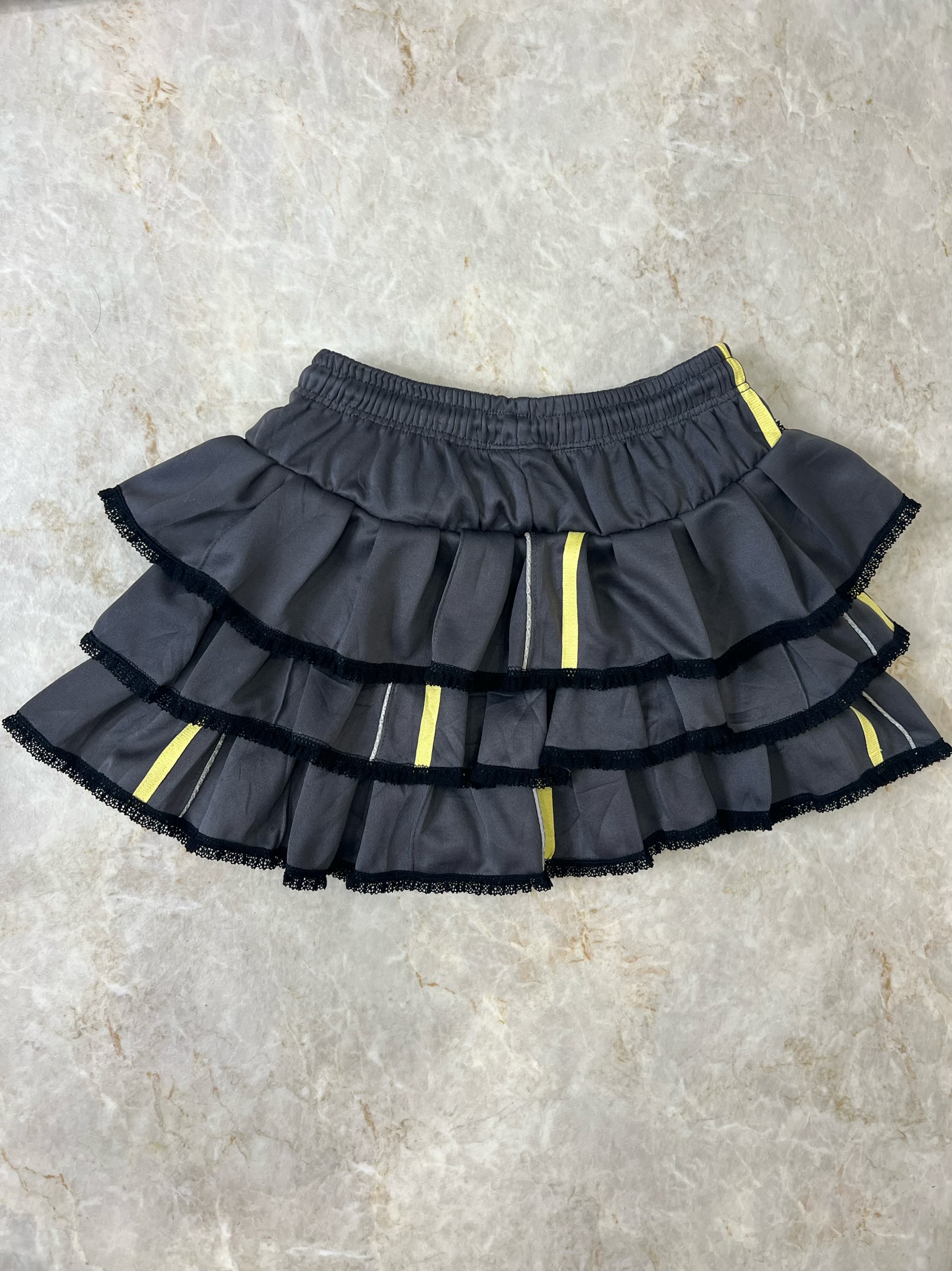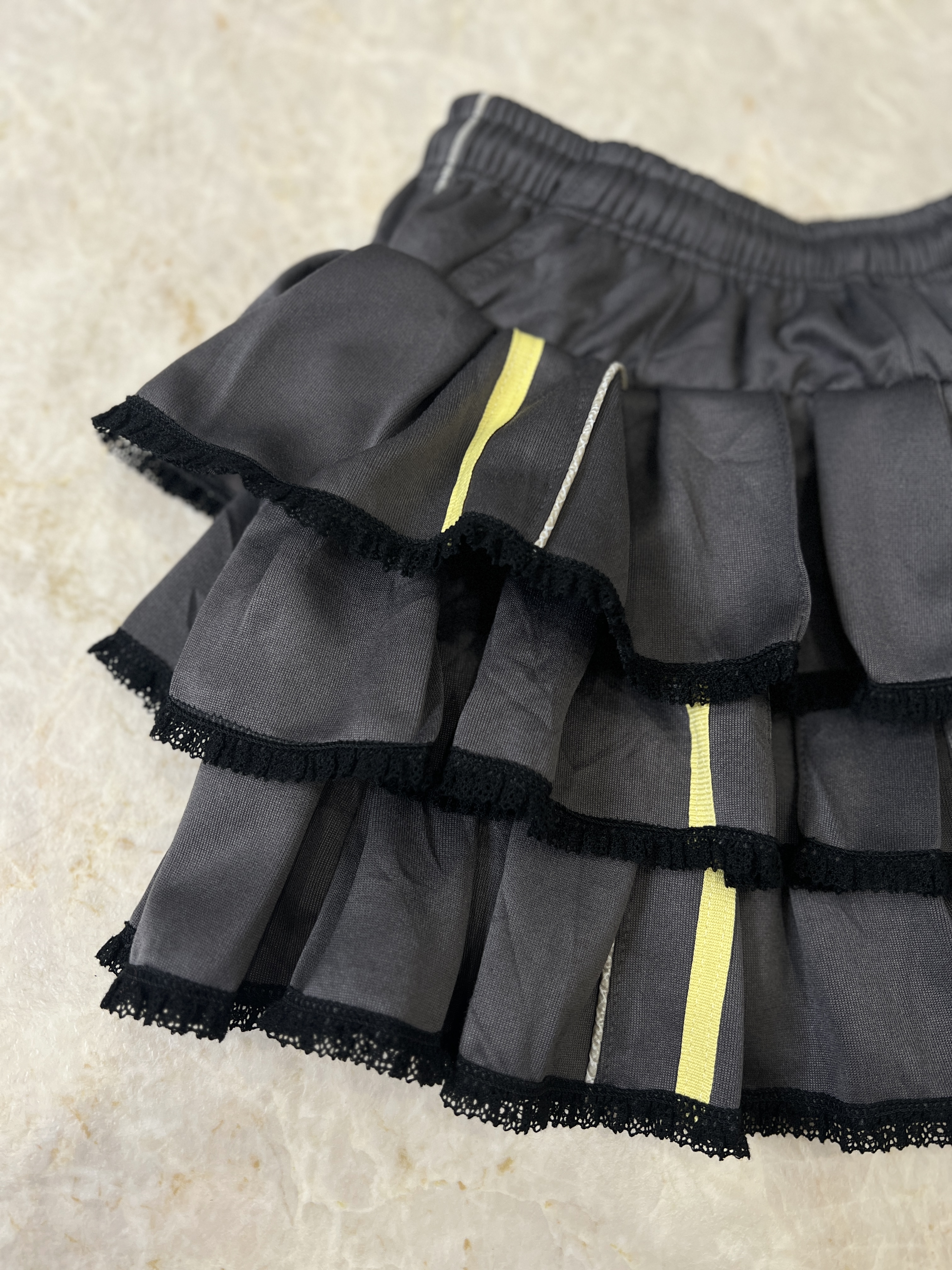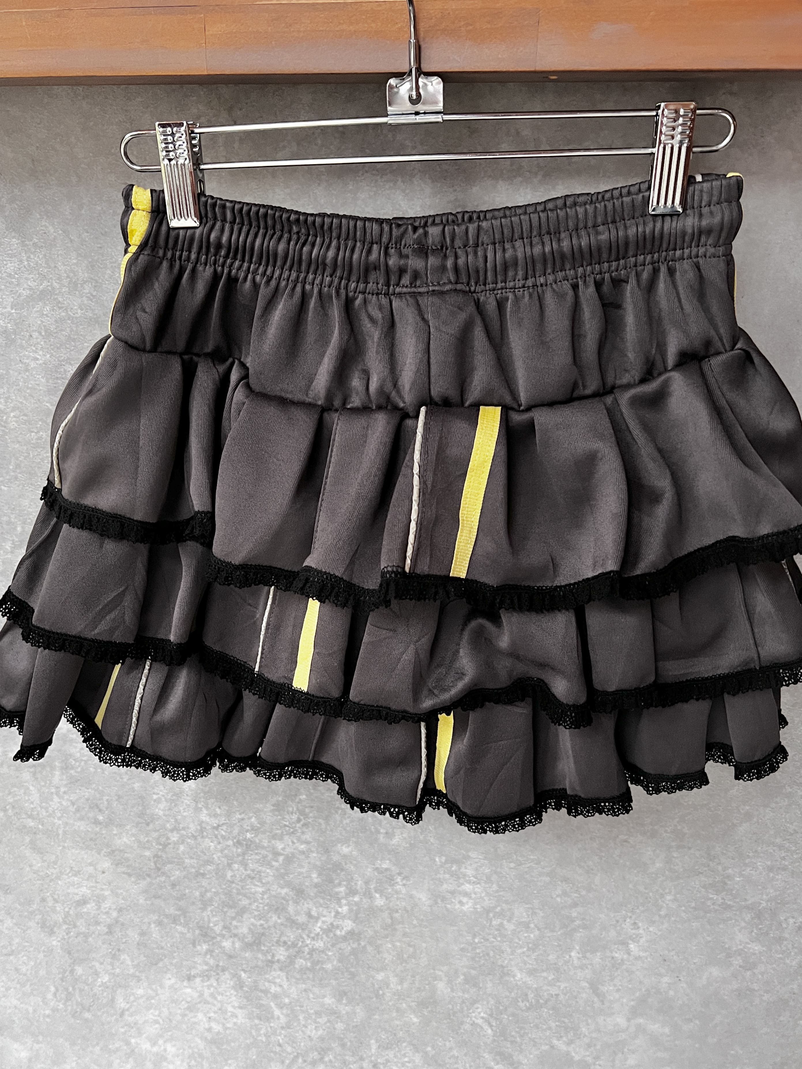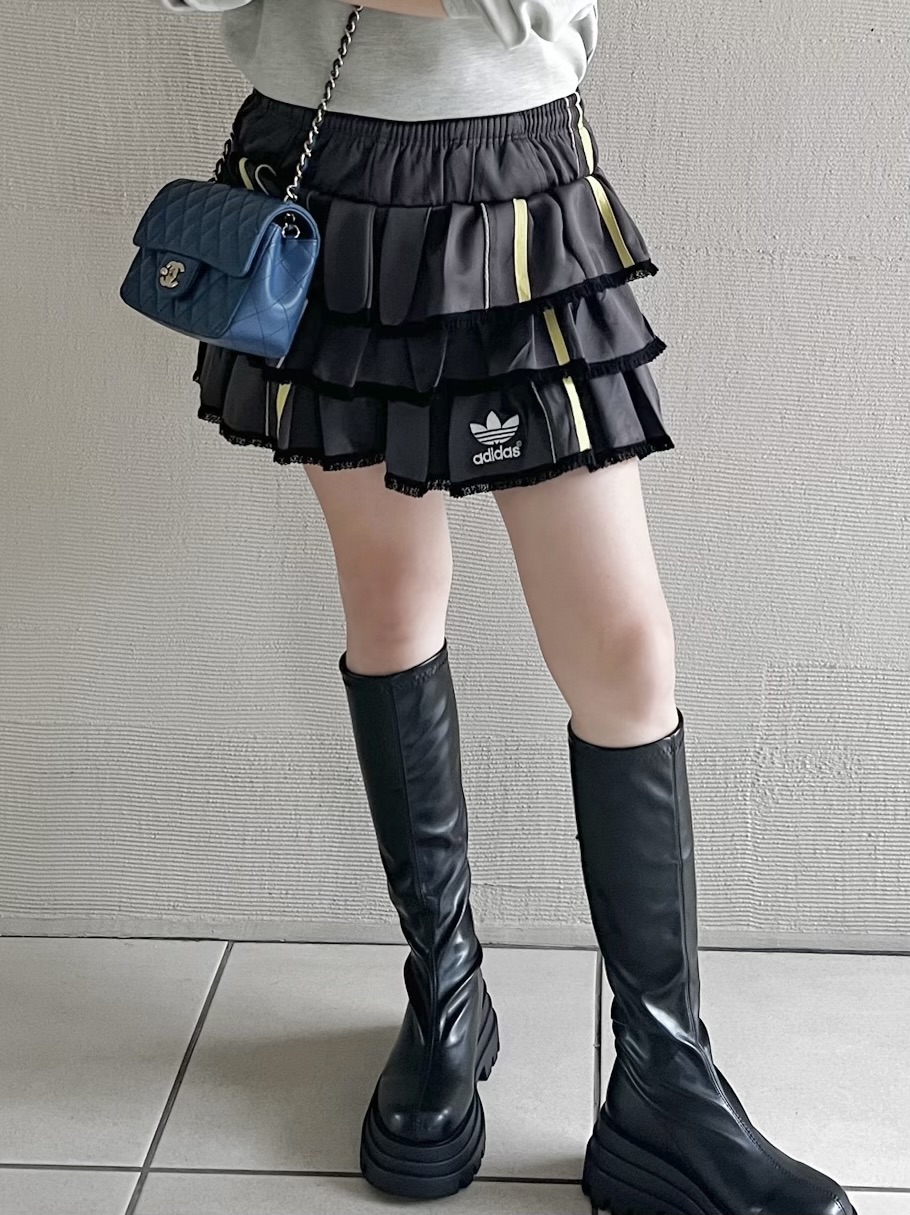 ダークグレーとブラウンの中間色のような秋冬にぴったりなadidasのジャージを裁断し、スカートにリメイクしました。フリルにコットンフリルを載せて少し甘さをプラス。ふわっと広がるシルエットが可愛いスカートです。ウエスト部分はゴムなので腰履きしても。1枚はもちろん、デニムやバイカーパンツの上にレイヤードさせたスタイリングもお勧めです。こちらは1点物のアイテムとなります。同じものは一つとして無いあなただけの一着をお届けします。※こちらの商品はUSEDの生地を使用しております。多少の汚れやほつれ等ダメージがある場合が御座います。商品特有の風合いをご理解、ご了承頂いた上でのご注文をお願い致します。返品交換は対応致しかねます。神経質な方や商品の特性をご理解、ご了承頂けない方は手に取ってご購入頂けるショップでのご購入をお願い致します。STAFF:158cm【サイズ】(平置き採寸)スカート丈34.5cm ウエスト32cm(ゴムの為伸縮) ヒップ43cm【素材】本体:ポリエステル87%,コットン13%■クロネコ代金後払いをご利用のお客様■商品到着後に請求書(払込用紙)が到着します。14日以内にお支払いをお願いします。全国の主要なコンビニで、請求書をレジに持っていくだけでお支払いが可能です。全国の郵便局でも同じ請求書でお支払いできます。※ご請求書が圧着ハガキタイプの場合、郵便局でのお支払いはできません。※弊社の銀行口座宛にお振込頂くものでは御座いません。ご注意下さい。