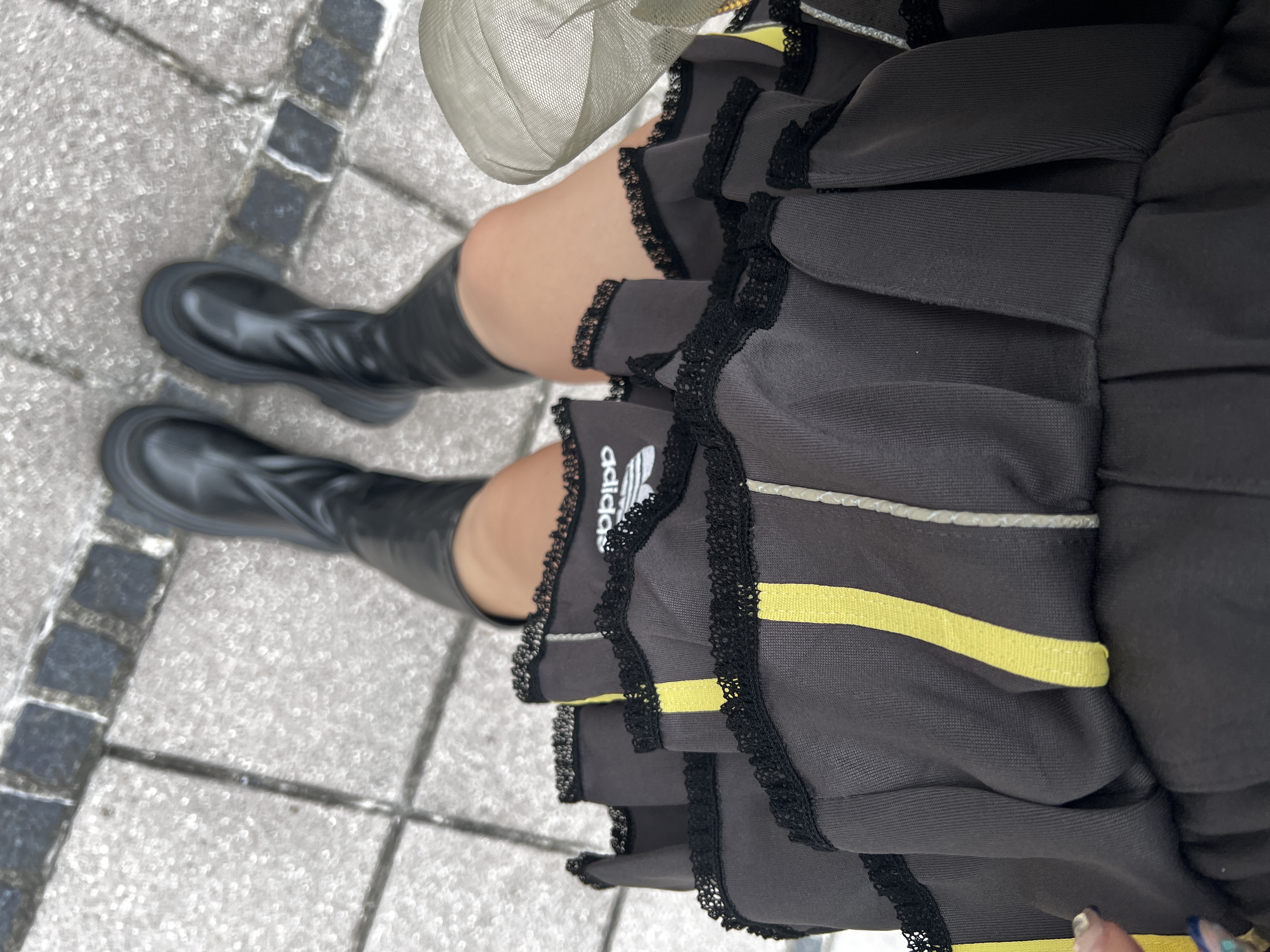 ダークグレーとブラウンの中間色のような秋冬にぴったりなadidasのジャージを裁断し、スカートにリメイクしました。