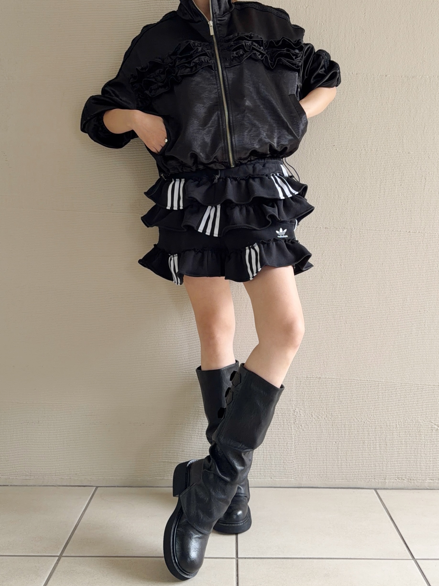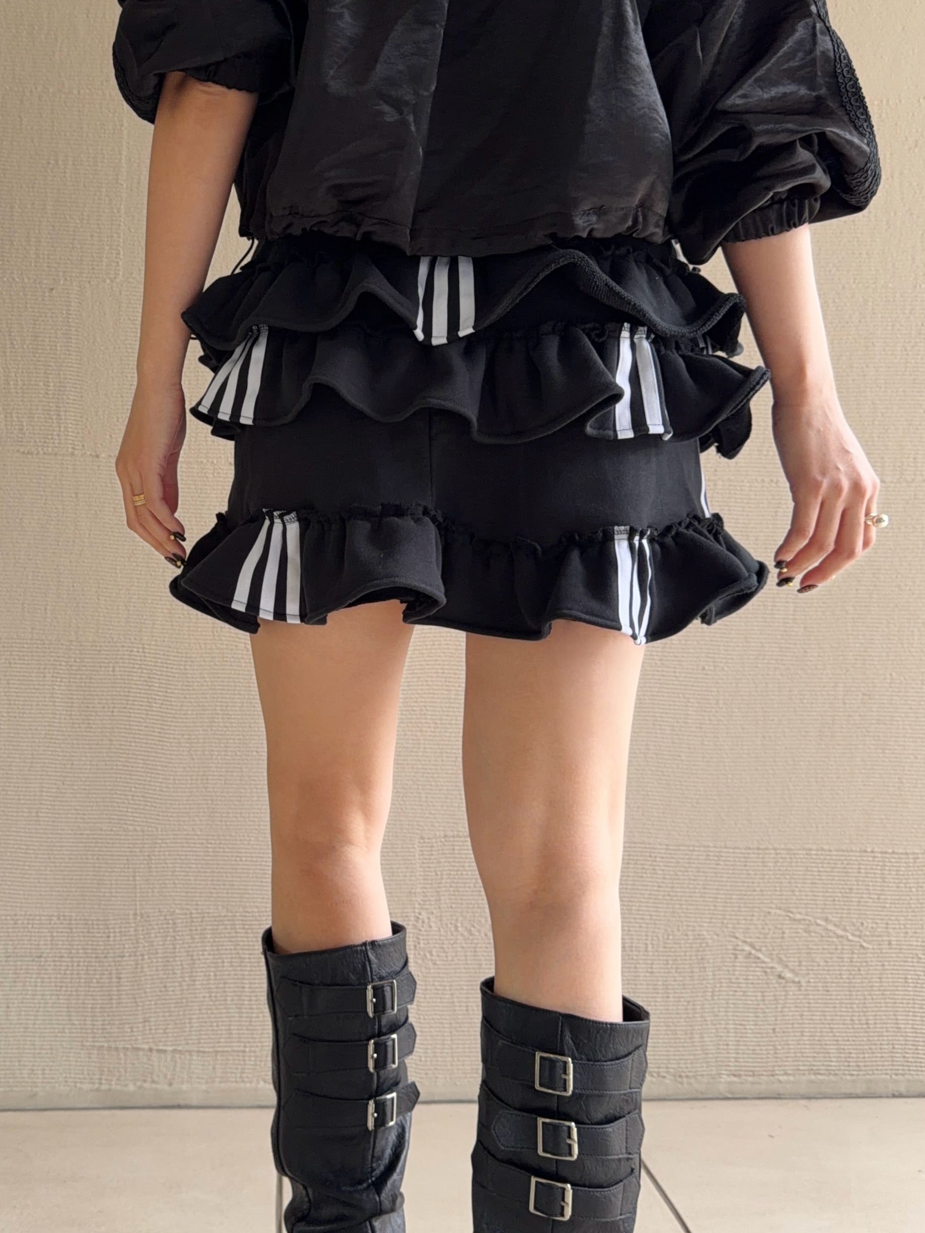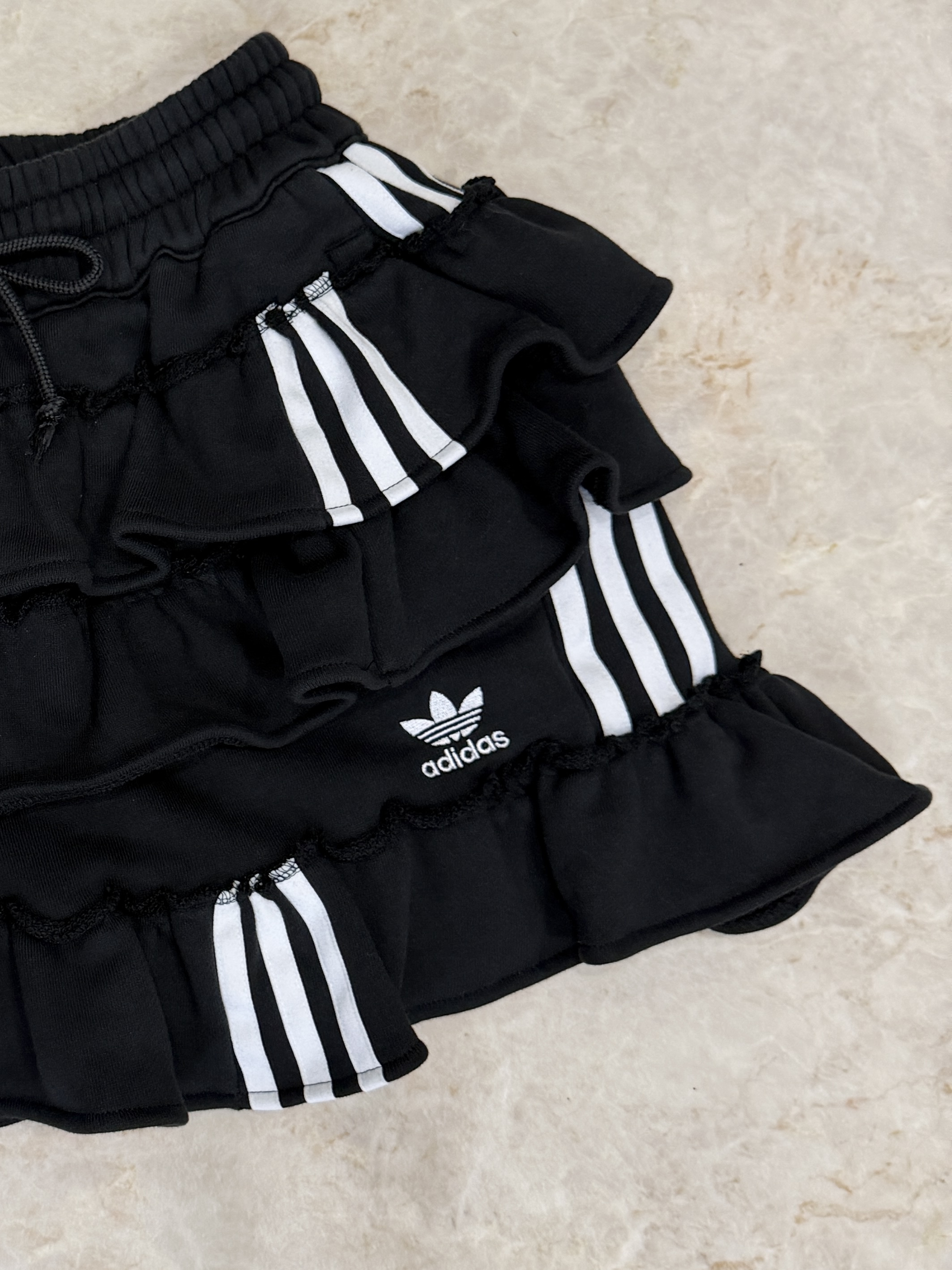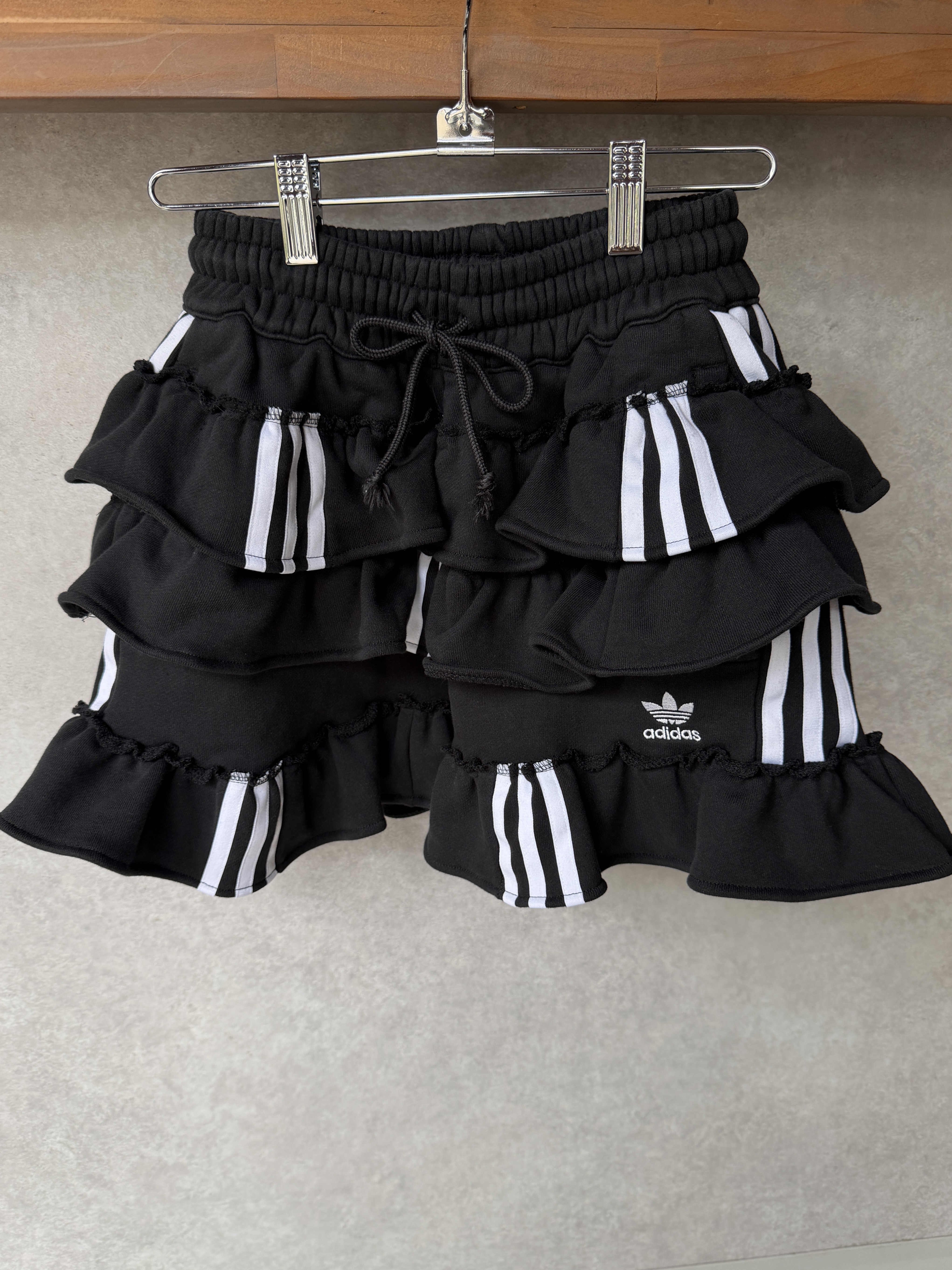 ブラックのadidasのスウェットパンツを裁断し、スカートにリメイクしました。プリっと動きのあるティアードフリルでカジュアルテイストの中に甘さもミックスしたスカートです。ウエスト部分はゴムなので腰履きして長さ調節もしていただけます。1枚はもちろん、デニムやバイカーパンツの上にレイヤードさせたスタイリングもお勧めです。こちらは1点物のアイテムとなります。同じものは一つとして無いあなただけの一着をお届けします。※こちらの商品はUSEDの生地を使用しております。多少の汚れやほつれ等ダメージがある場合が御座います。商品特有の風合いをご理解、ご了承頂いた上でのご注文をお願い致します。返品交換は対応致しかねます。神経質な方や商品の特性をご理解、ご了承頂けない方は手に取ってご購入頂けるショップでのご購入をお願い致します。STAFF:158cm【サイズ】サイズ表記XS(平置き採寸)スカート丈33cm ウエスト27.5cm(ゴムの為伸縮) ヒップ45cm【素材】本体:コットン100%■クロネコ代金後払いをご利用のお客様■商品到着後に請求書(払込用紙)が到着します。14日以内にお支払いをお願いします。全国の主要なコンビニで、請求書をレジに持っていくだけでお支払いが可能です。全国の郵便局でも同じ請求書でお支払いできます。※ご請求書が圧着ハガキタイプの場合、郵便局でのお支払いはできません。※弊社の銀行口座宛にお振込頂くものでは御座いません。ご注意下さい。