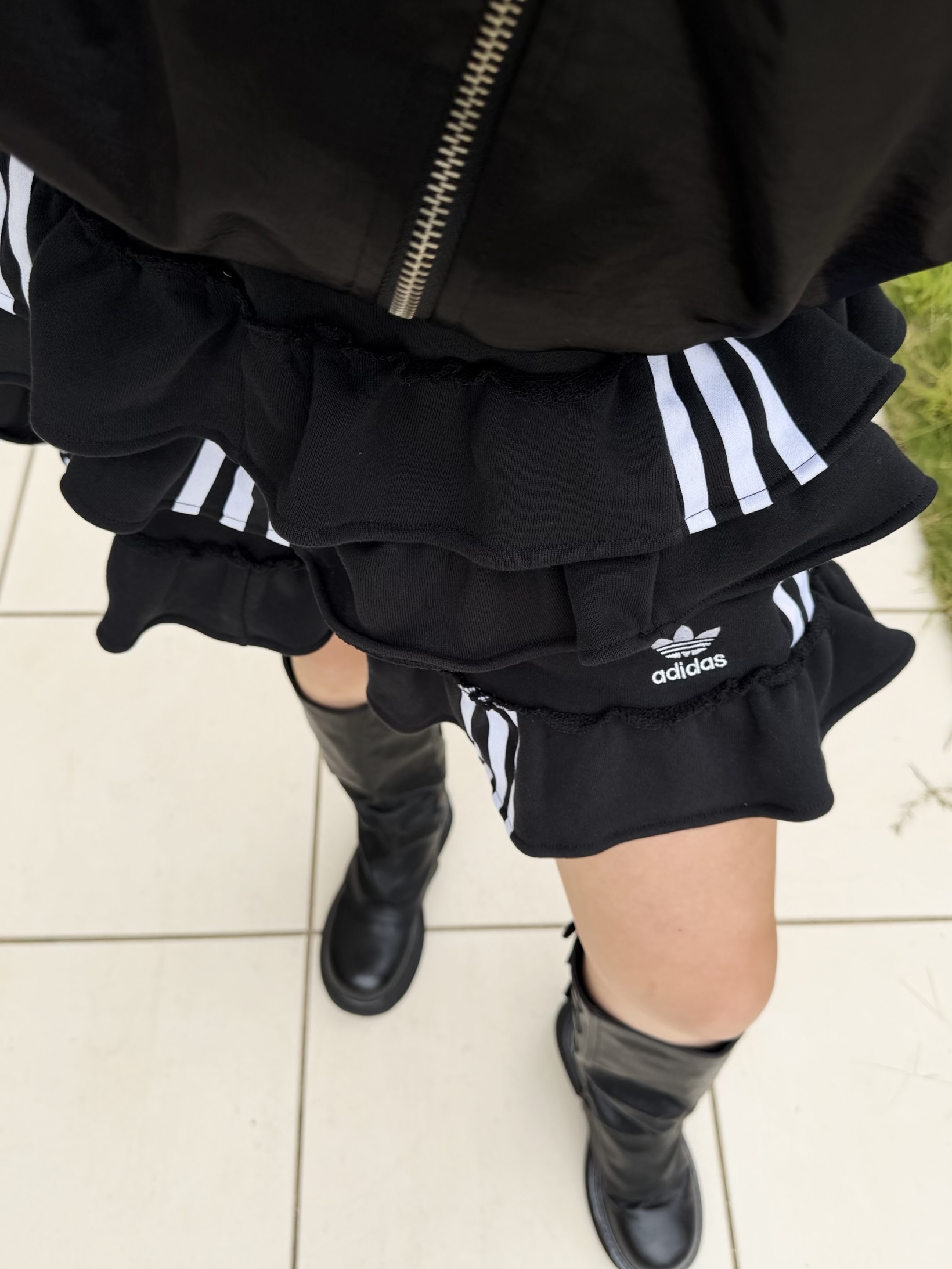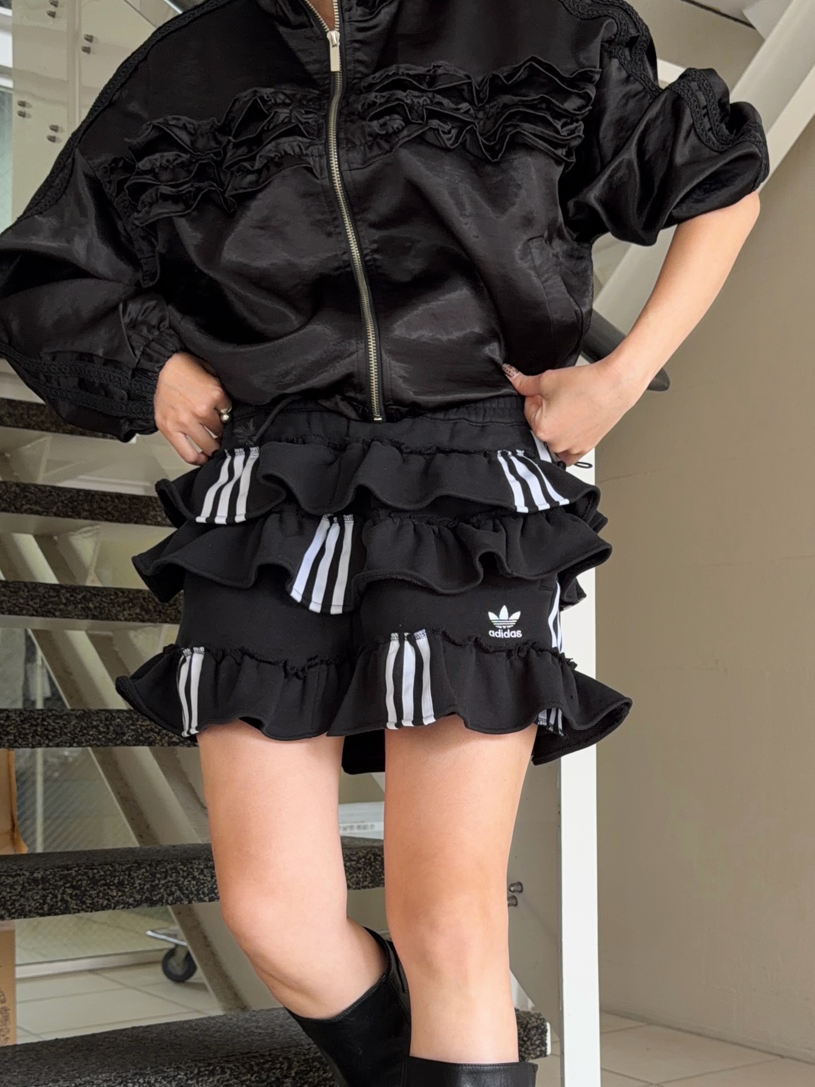 ブラックのadidasのスウェットパンツを裁断し、スカートにリメイクしました。