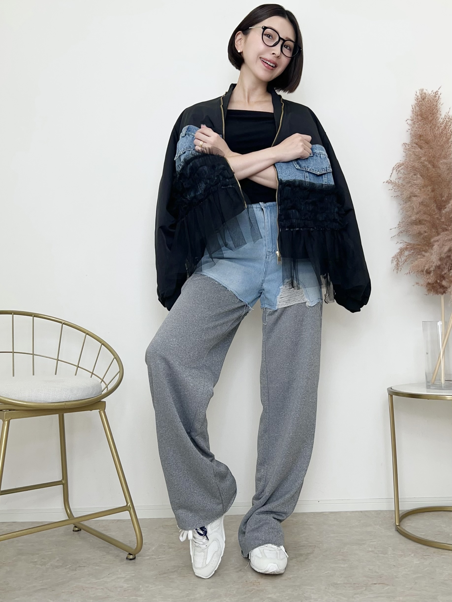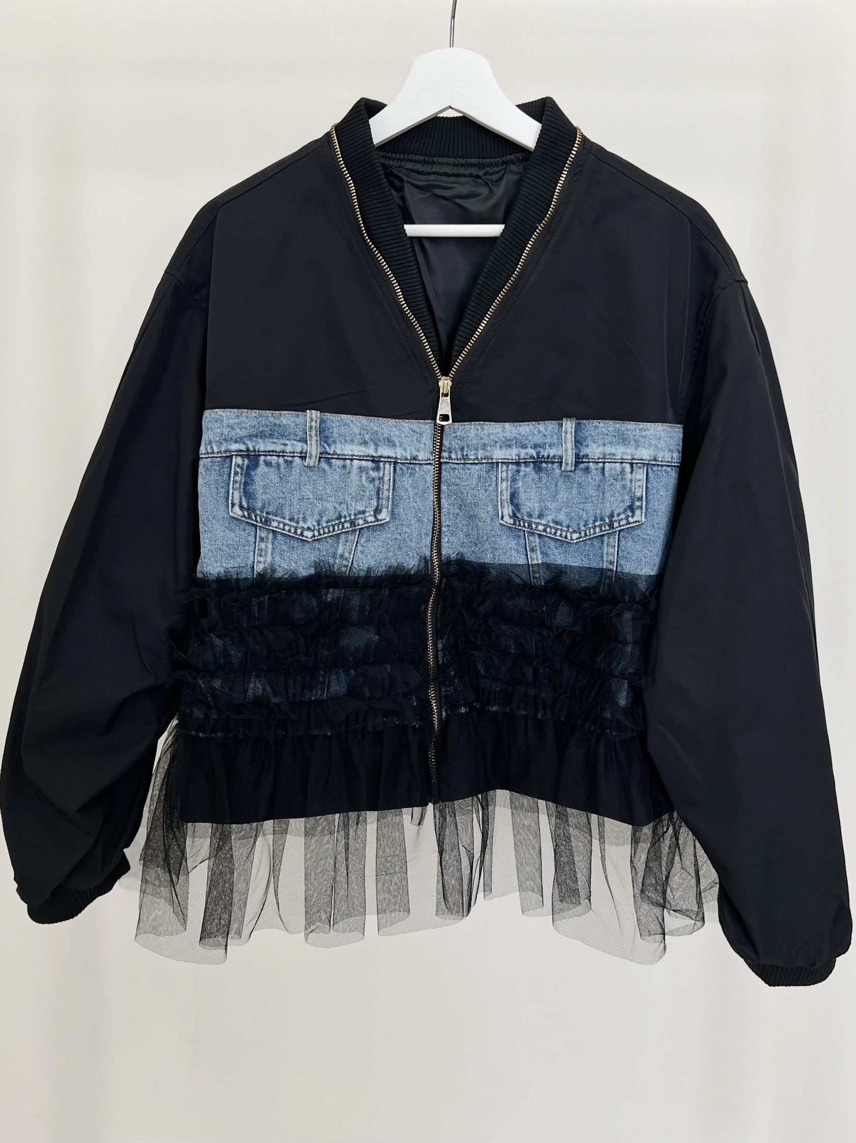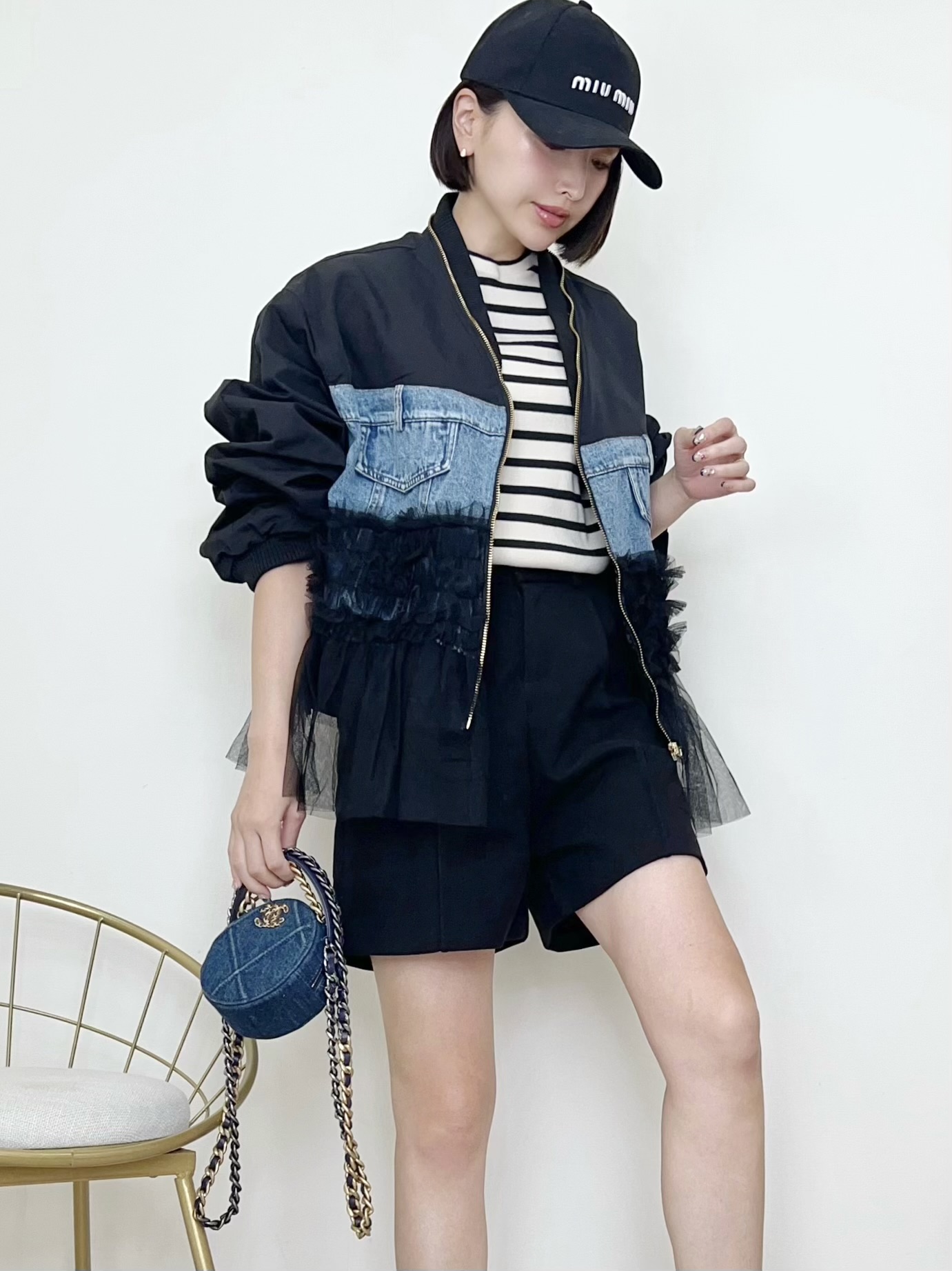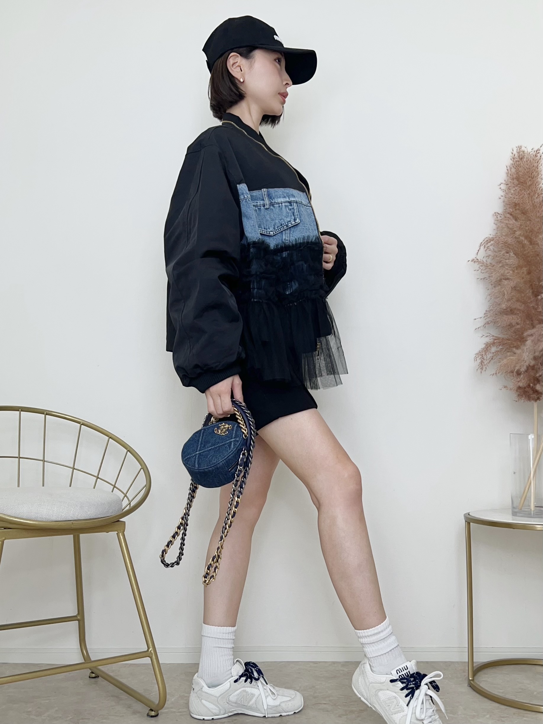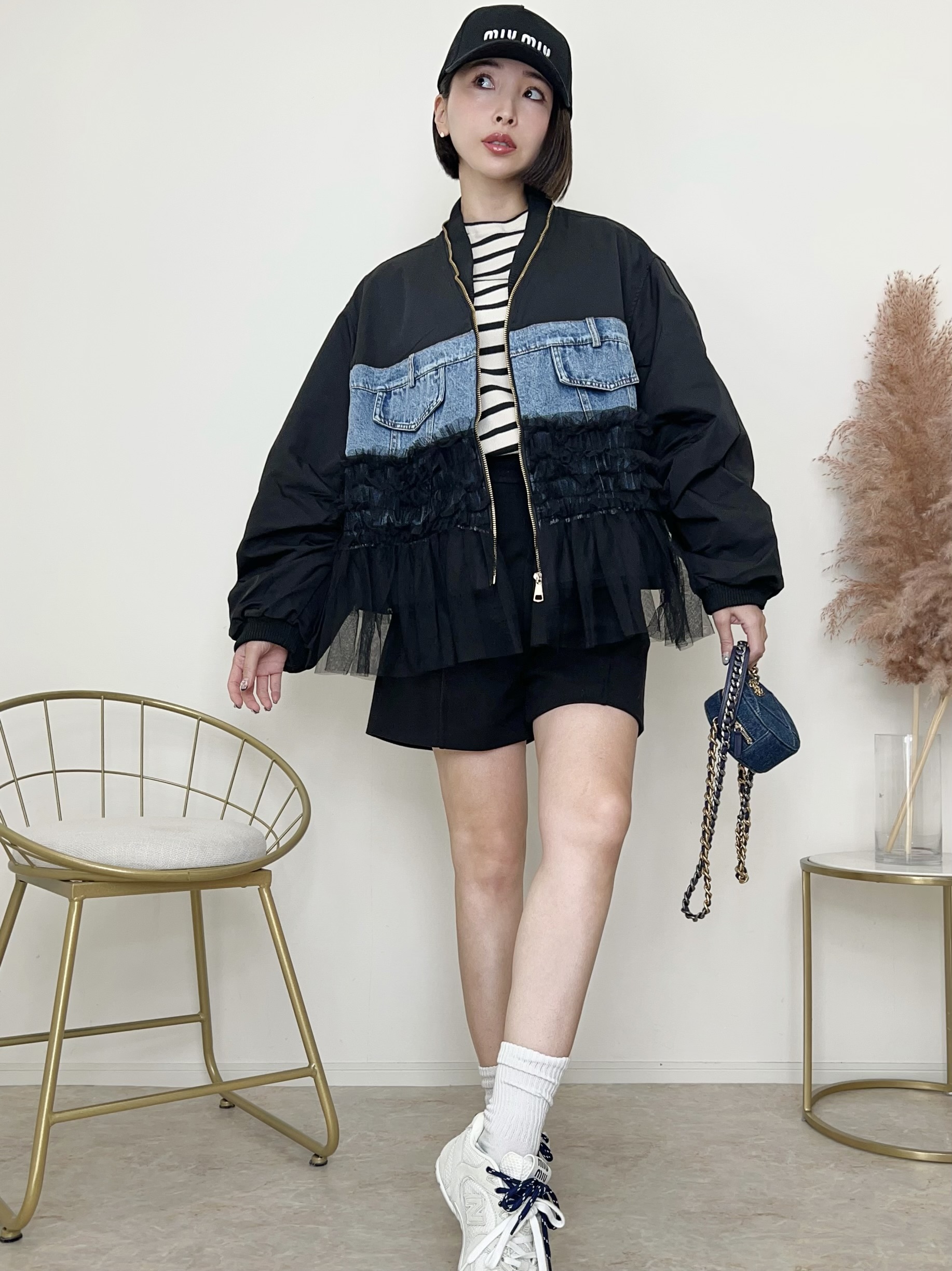 カジュアルなデニム切替のブルゾンに裾のチュールで女性らしさをプラス。