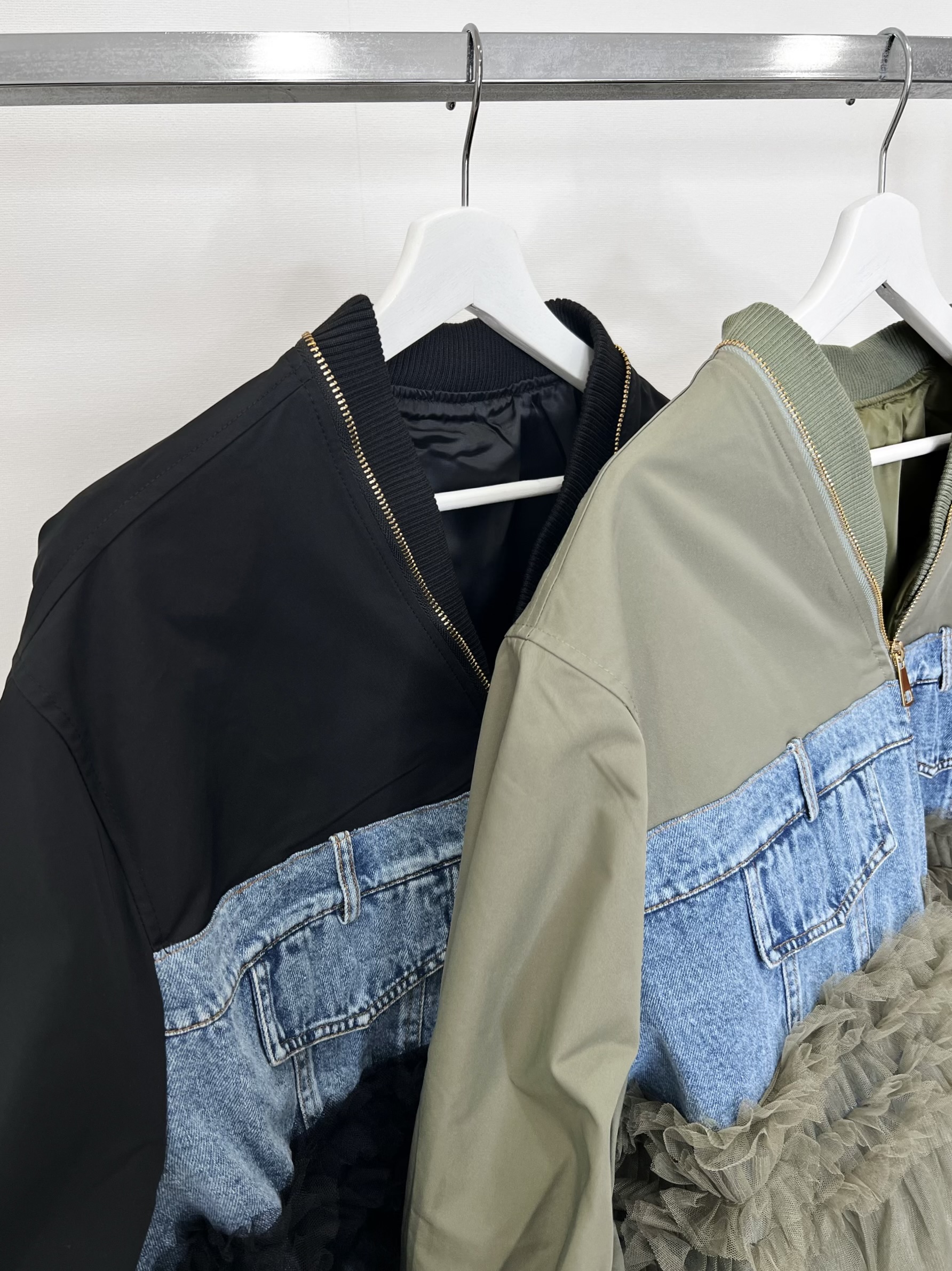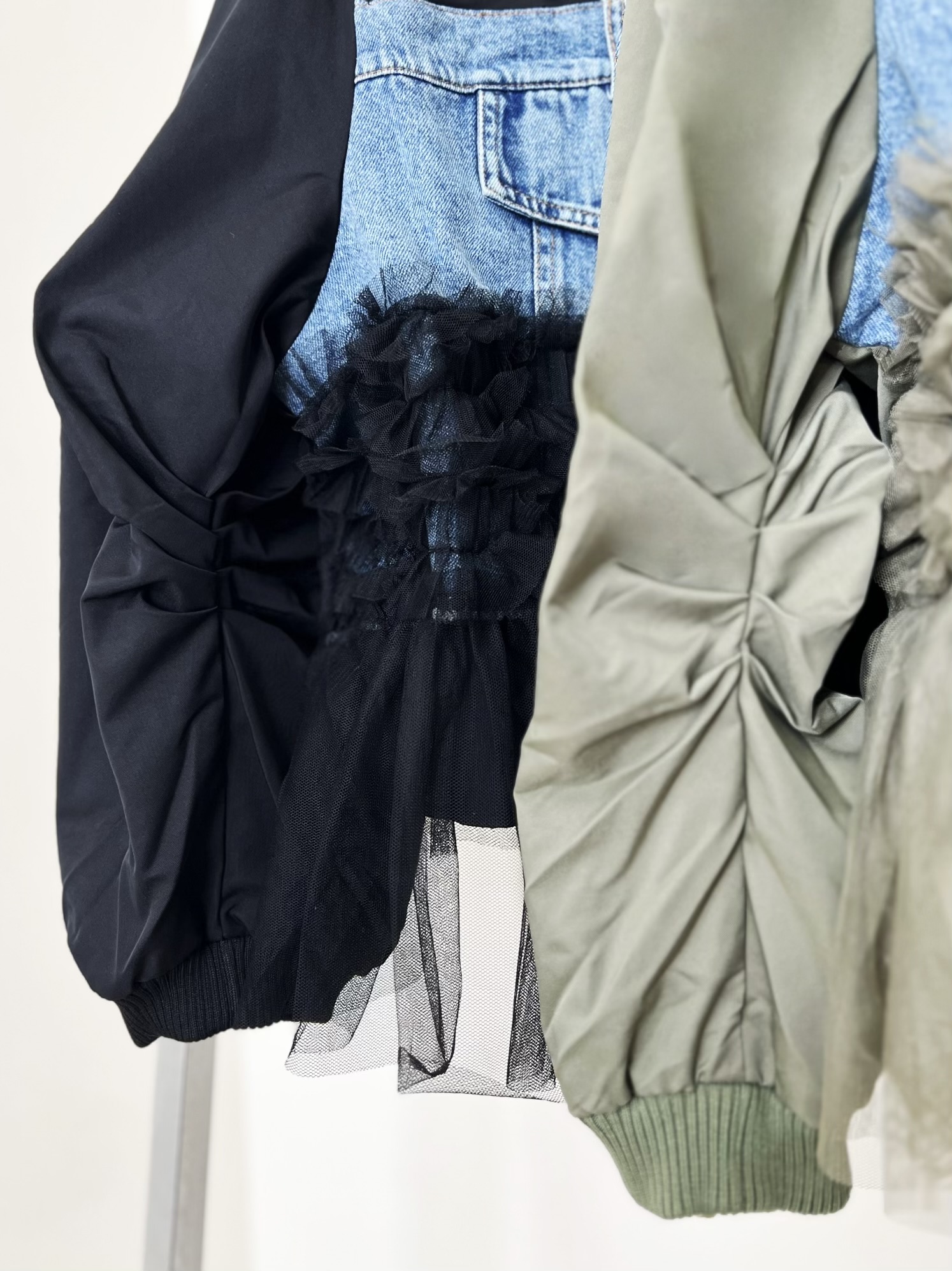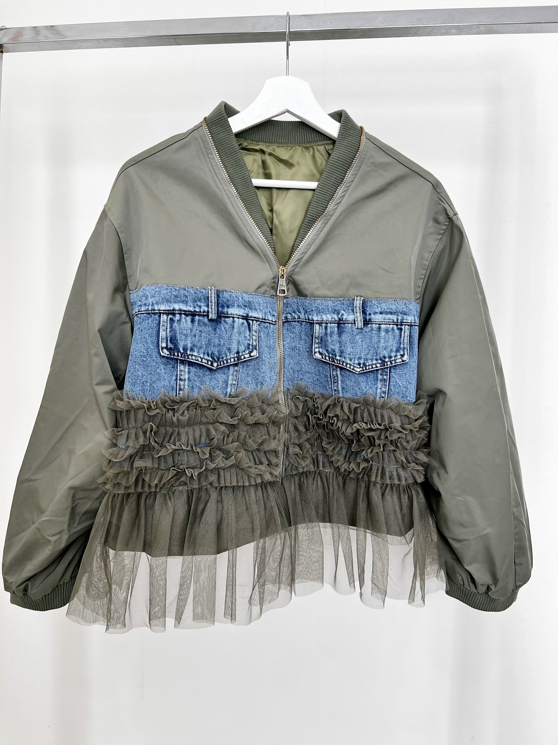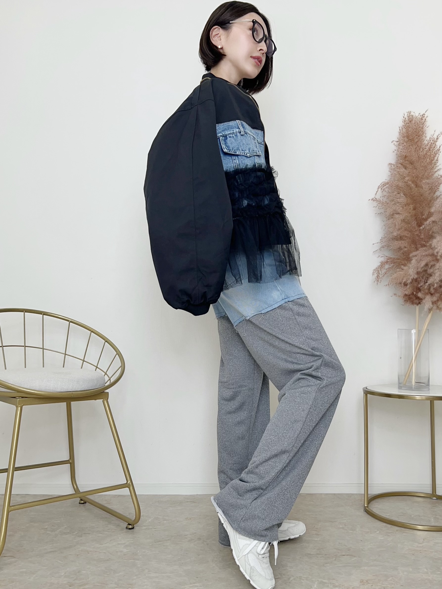 カジュアルなデニム切替のブルゾンに裾のチュールで女性らしさをプラス。