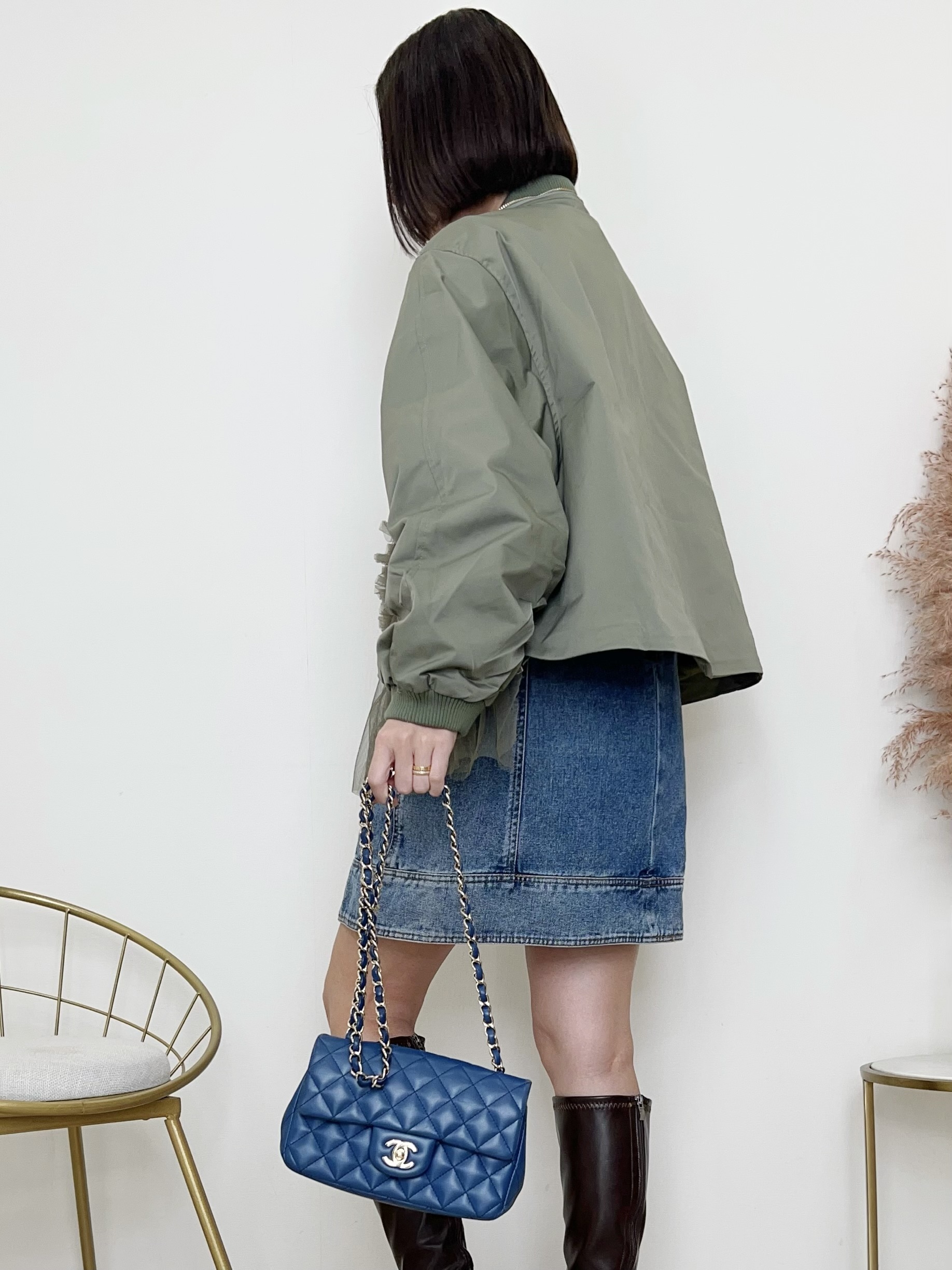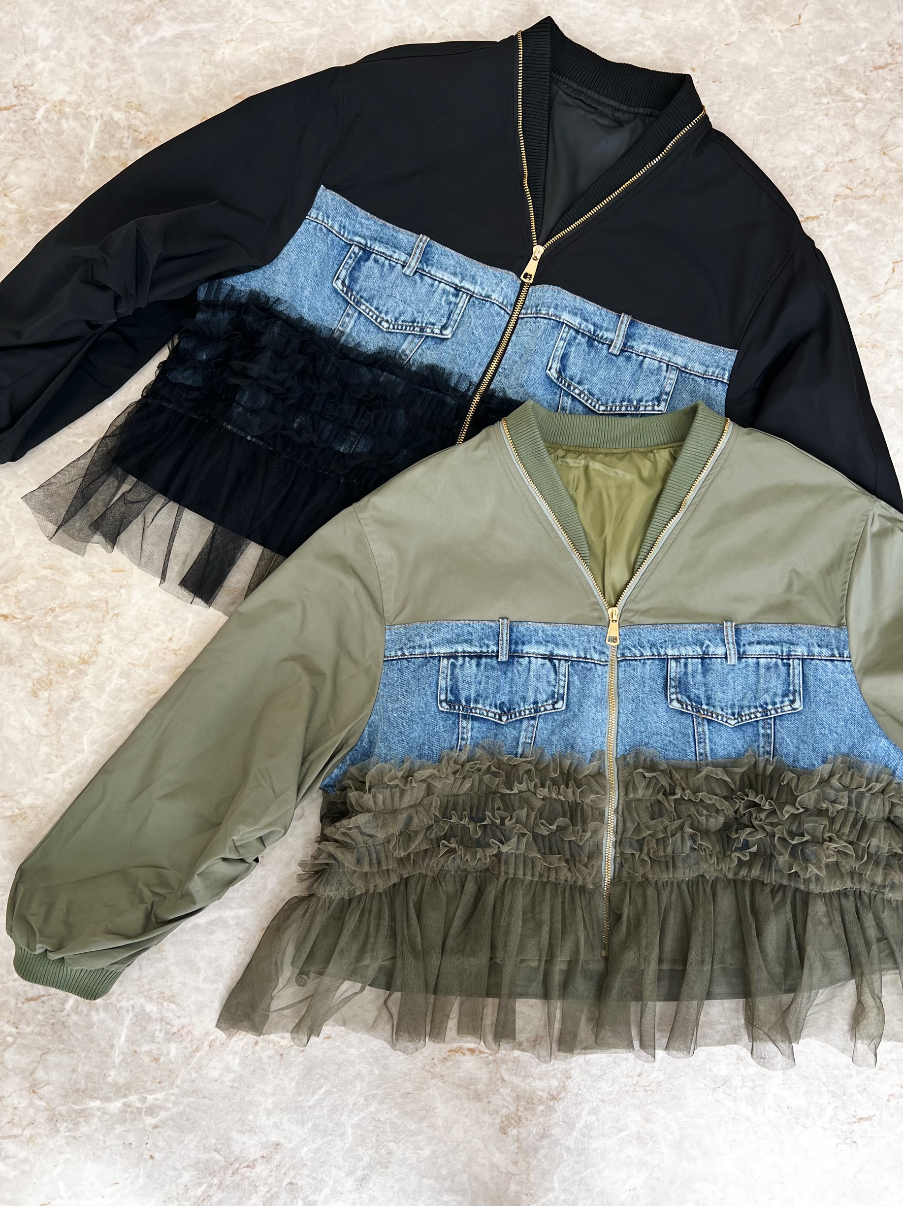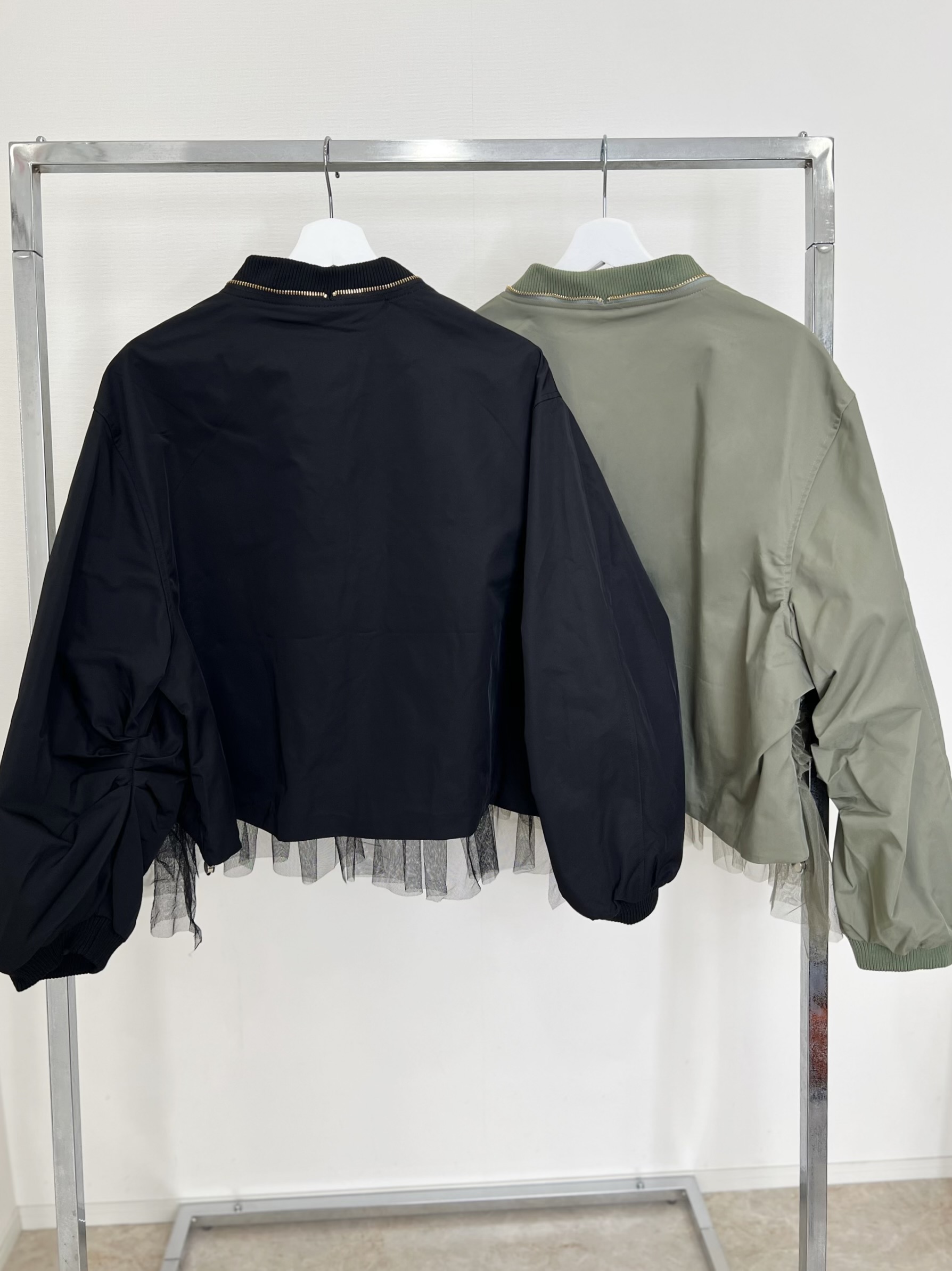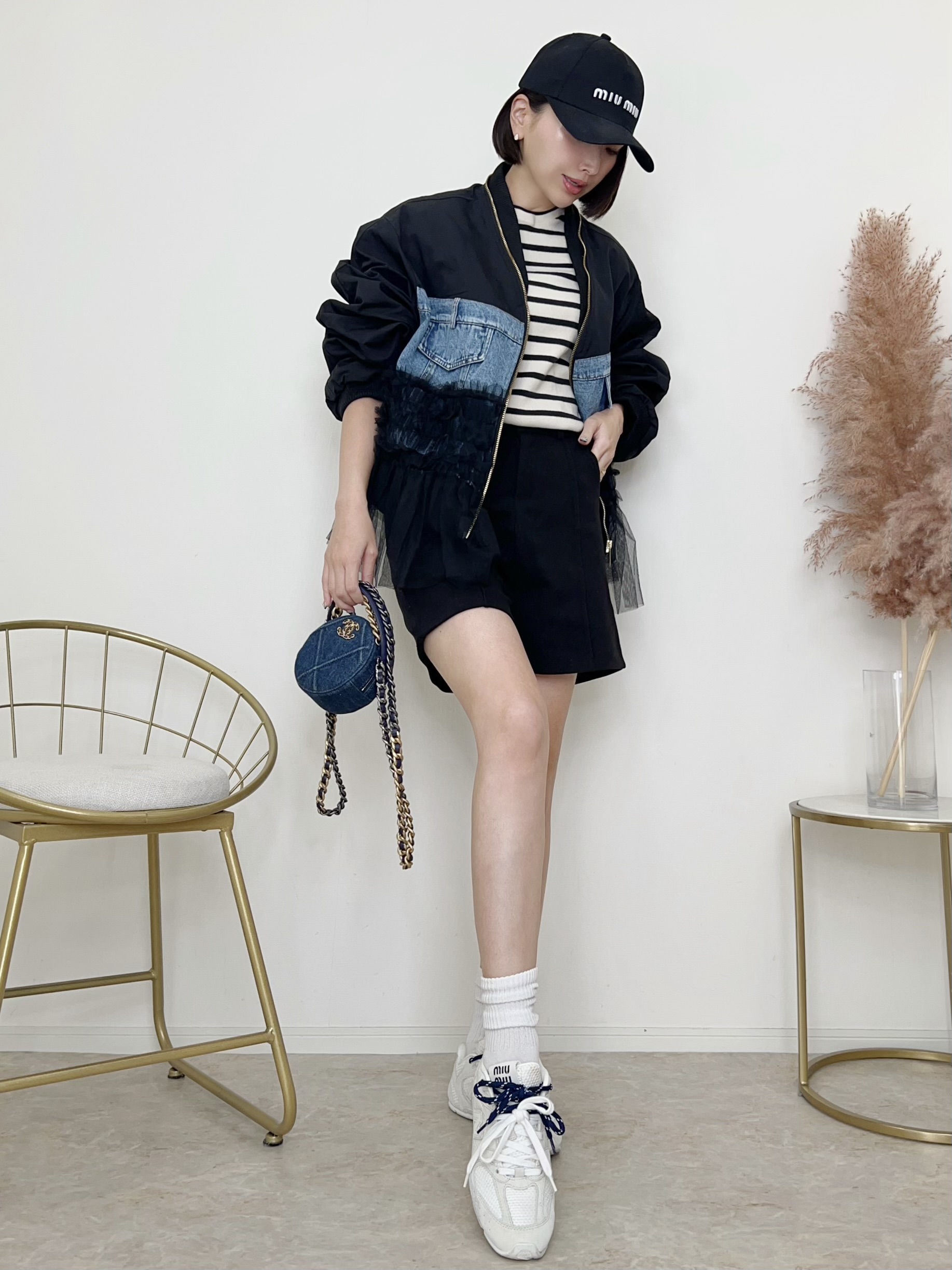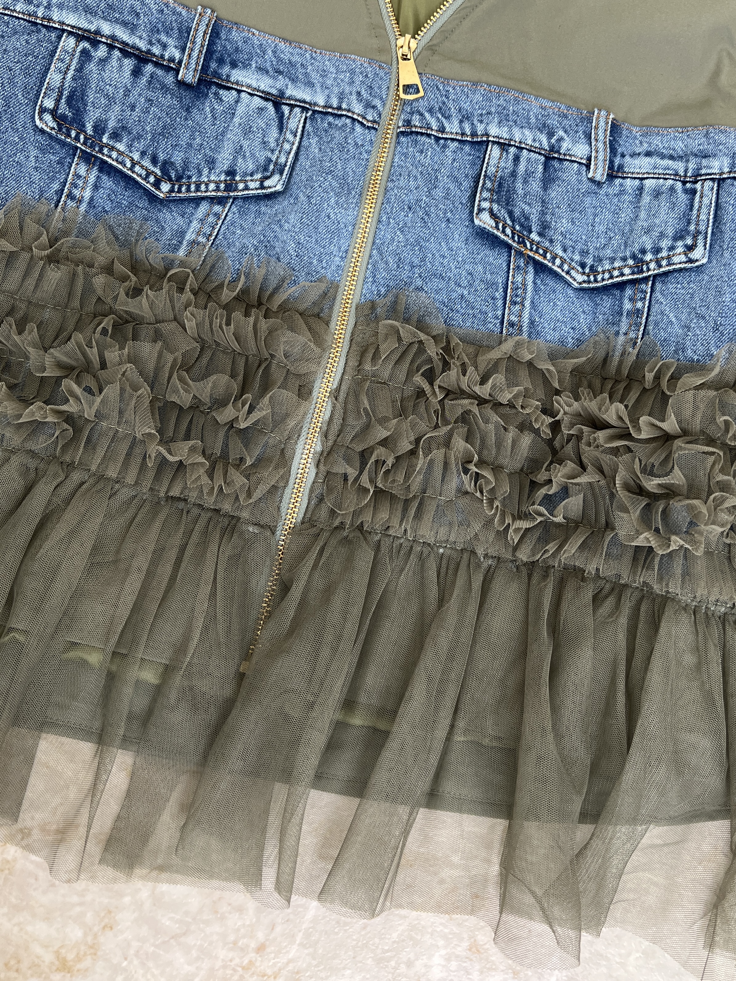 カジュアルなデニム切替のブルゾンに裾のチュールで女性らしさをプラス。