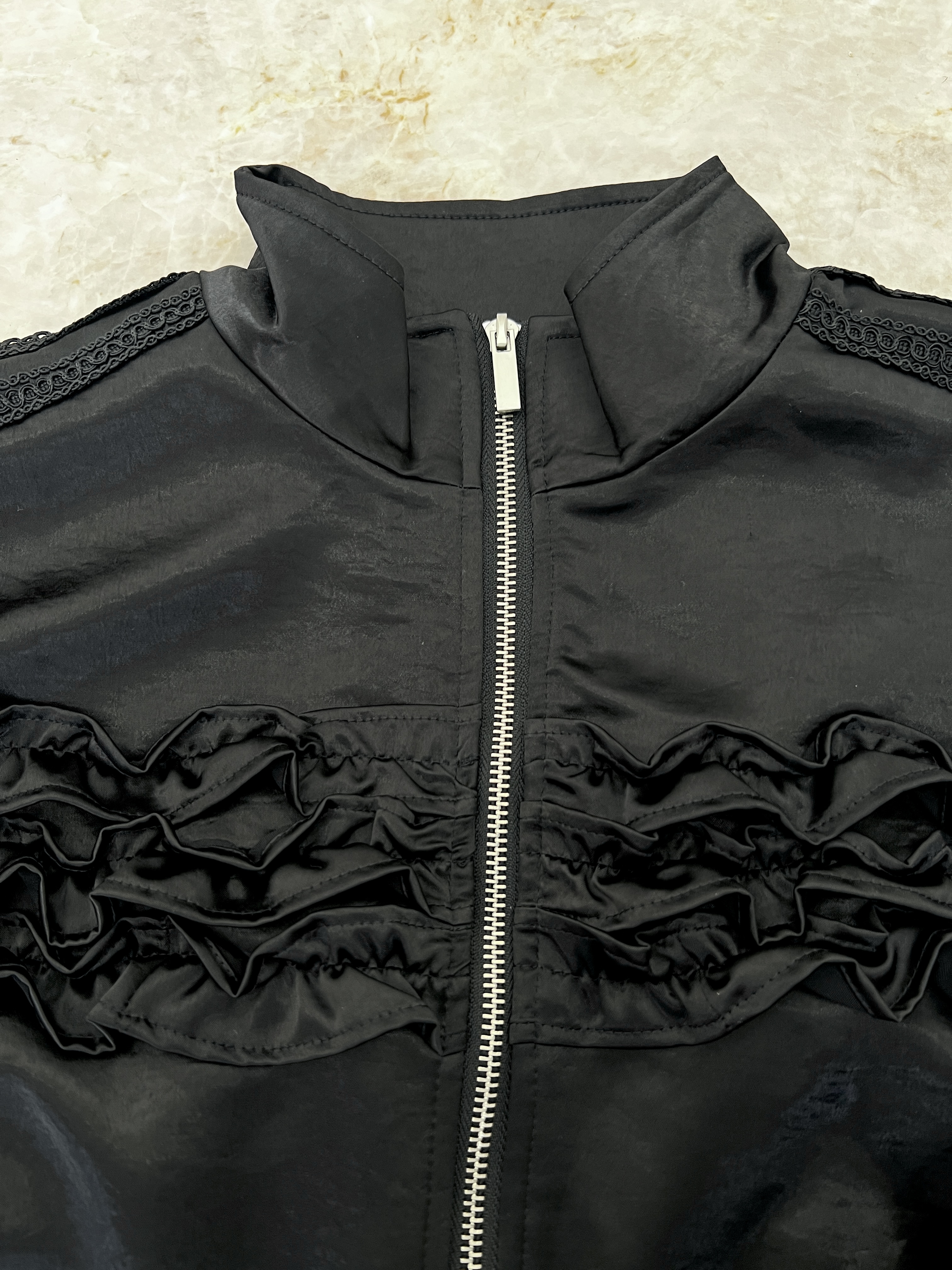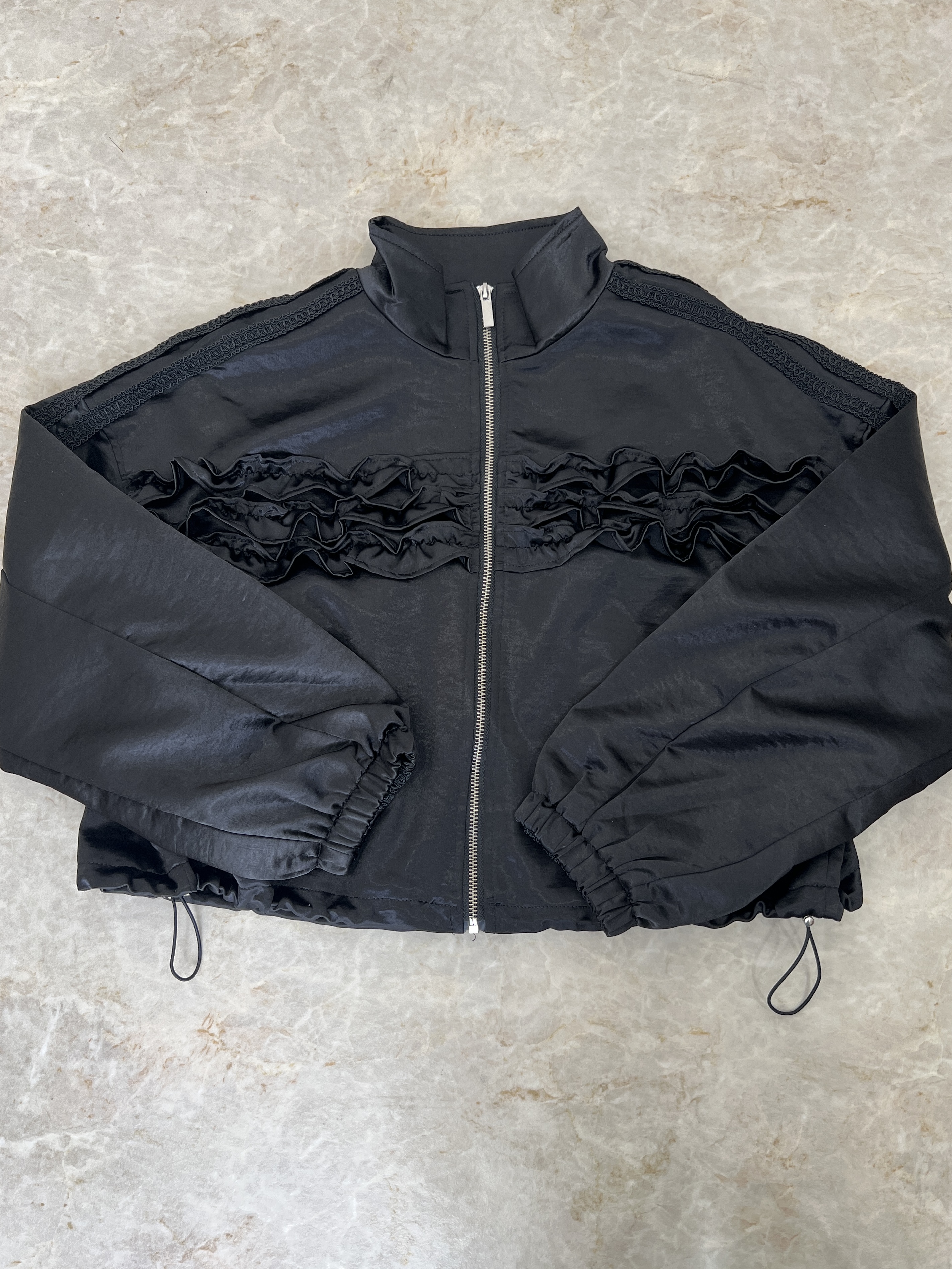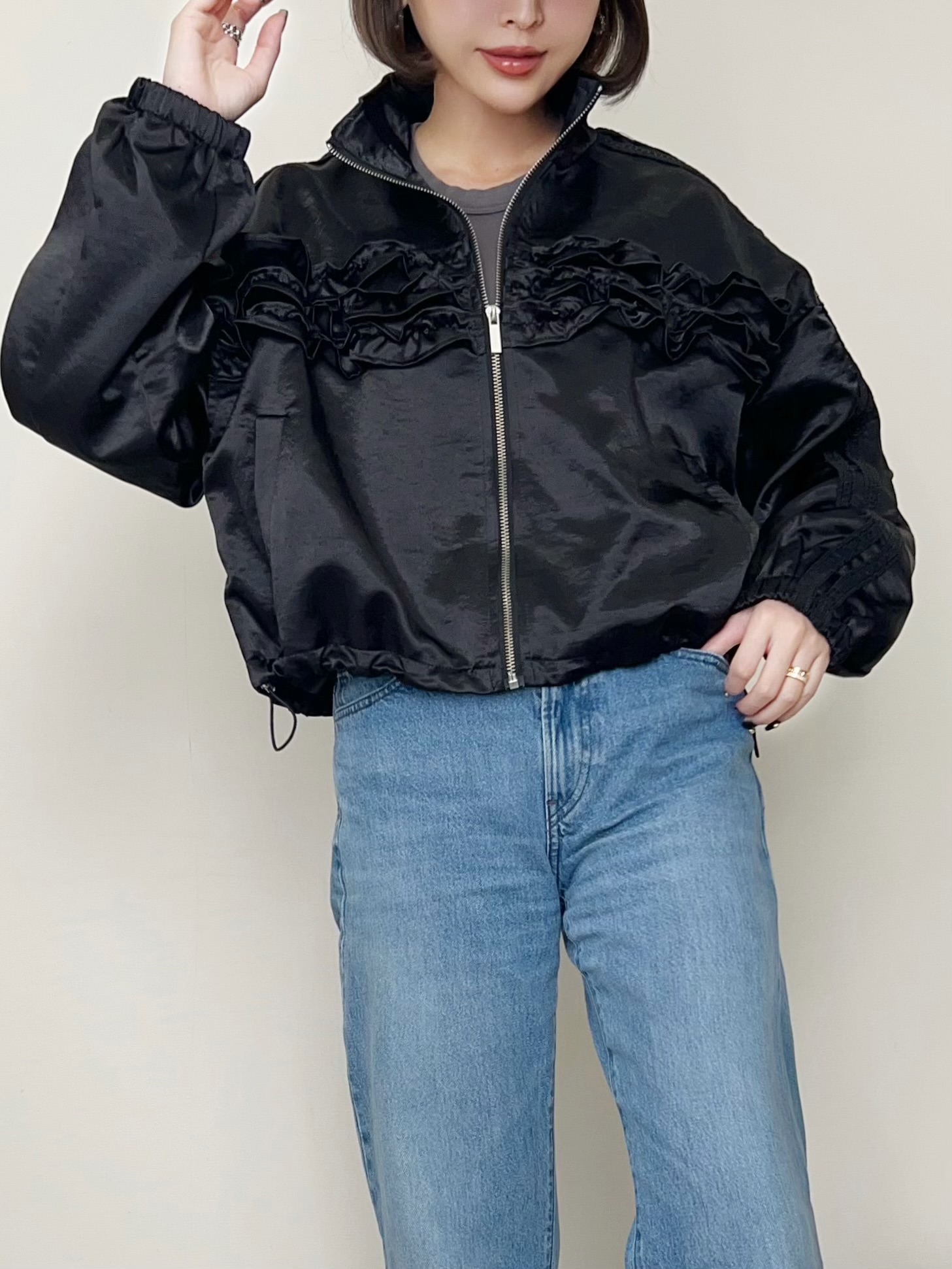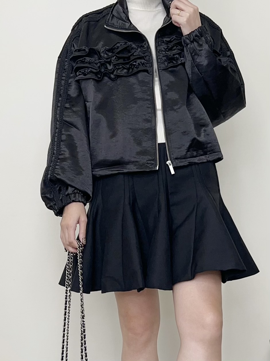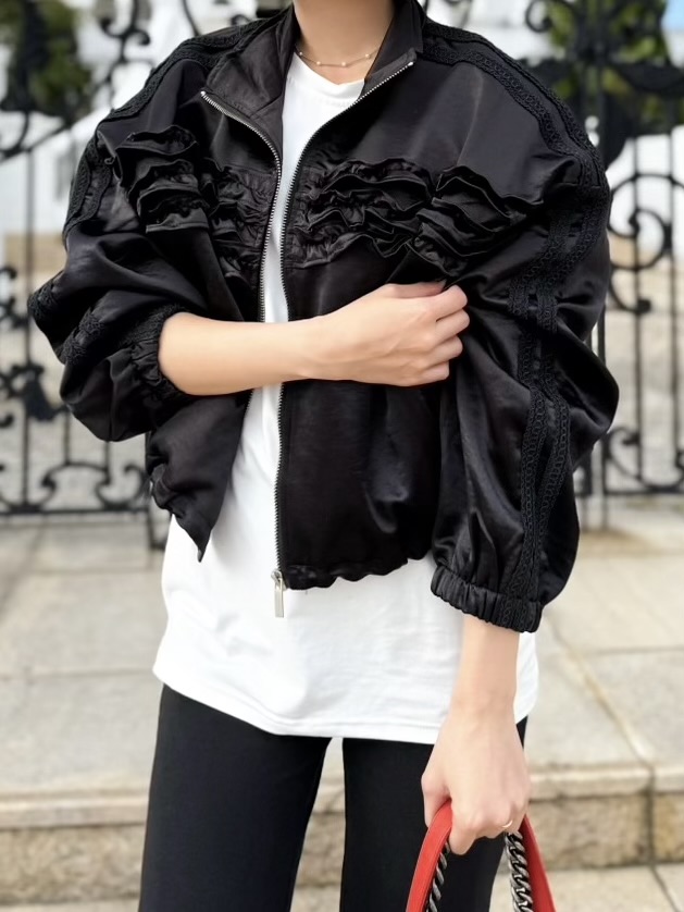 カジュアルな中にも上品でエレガントな雰囲気が漂うフリルブルゾン。