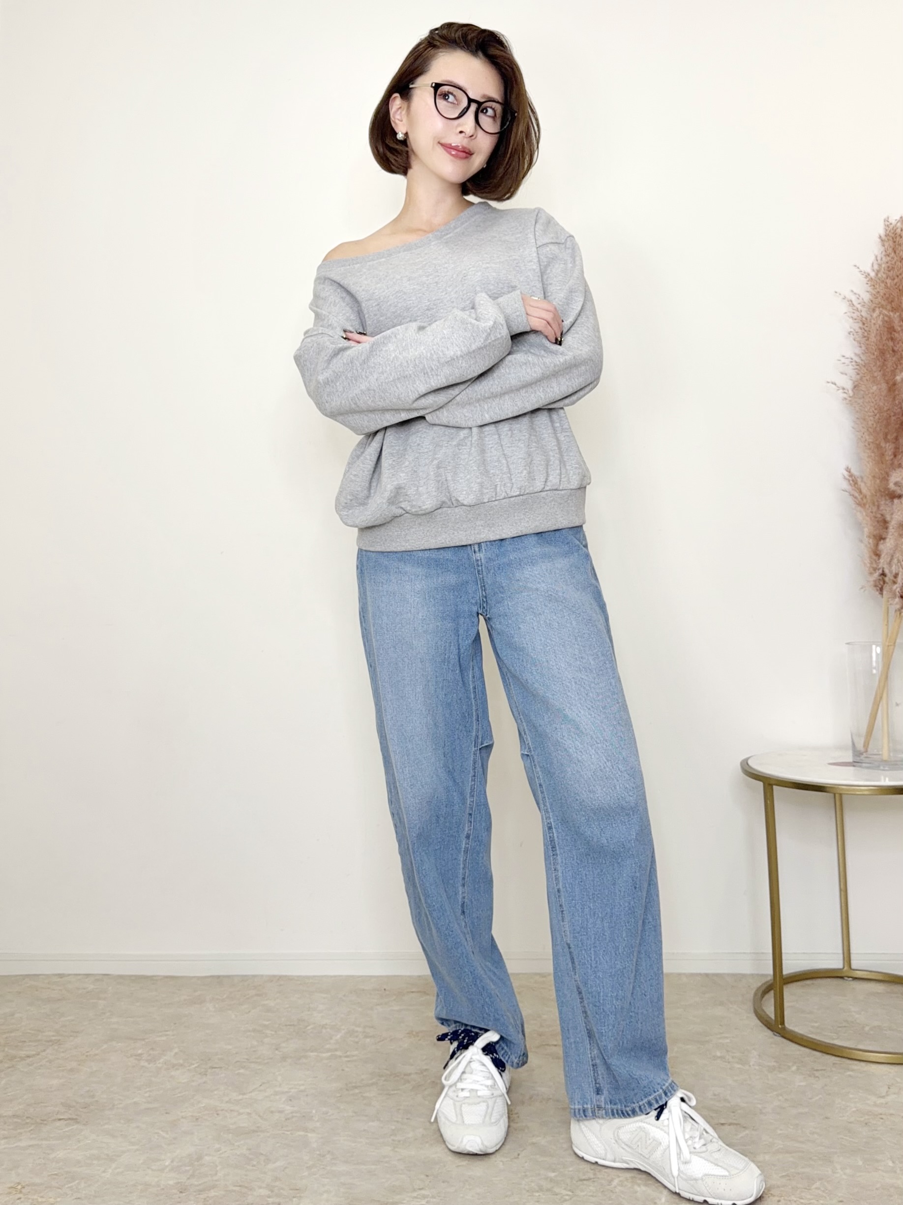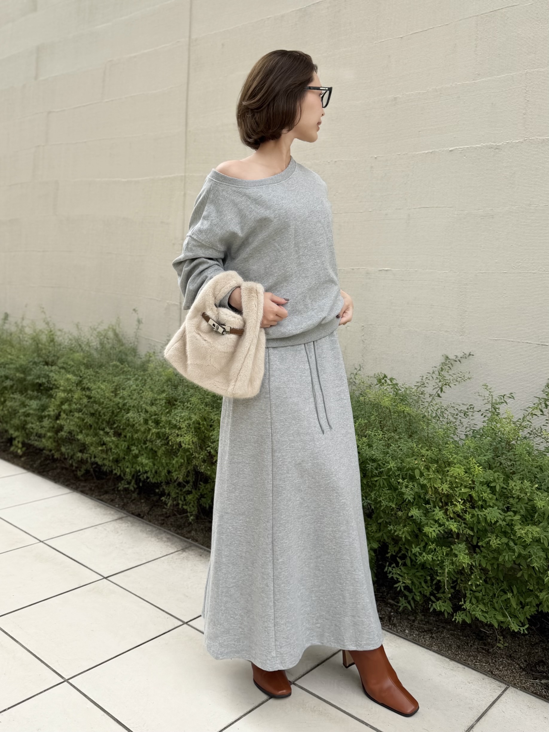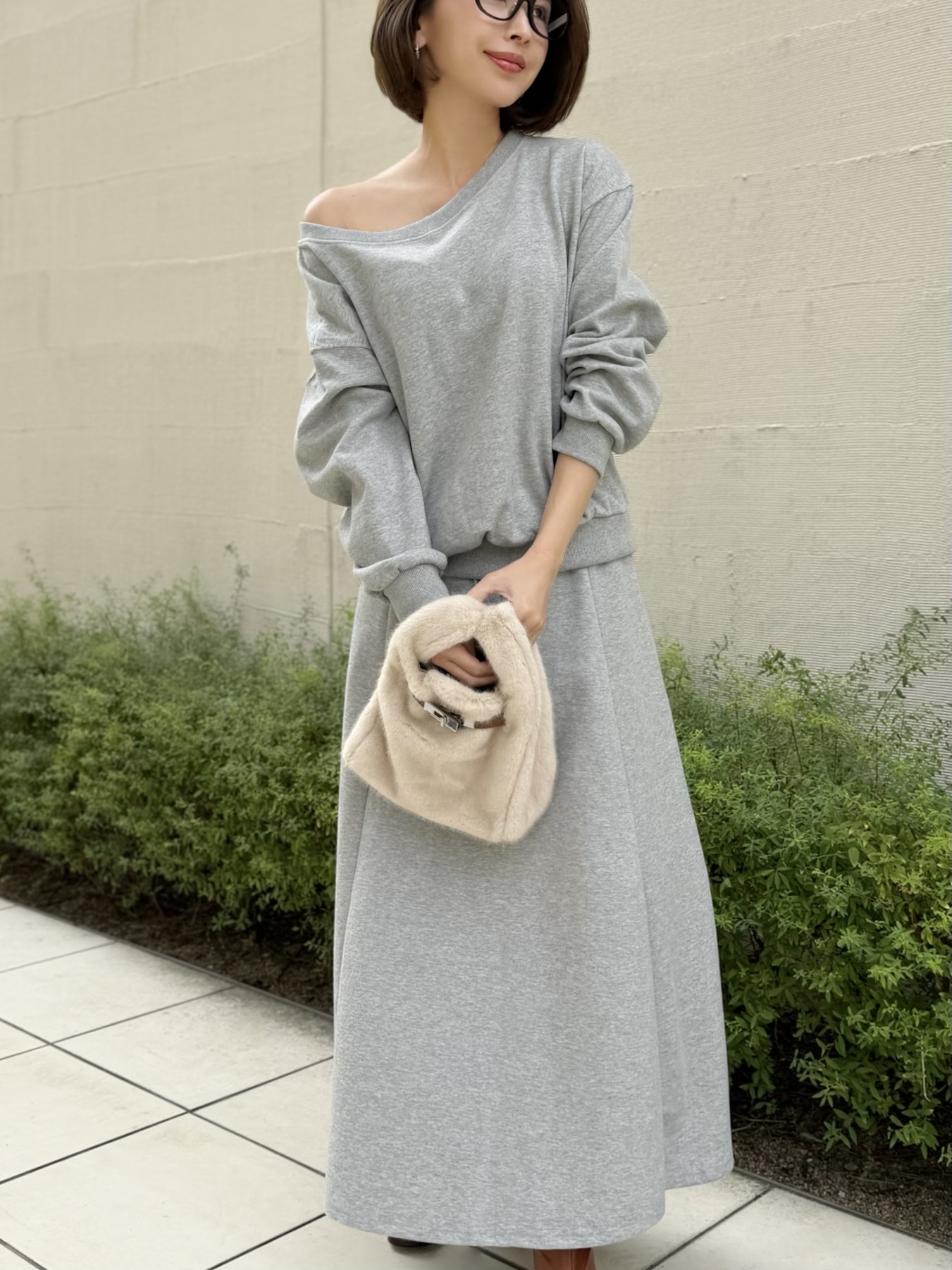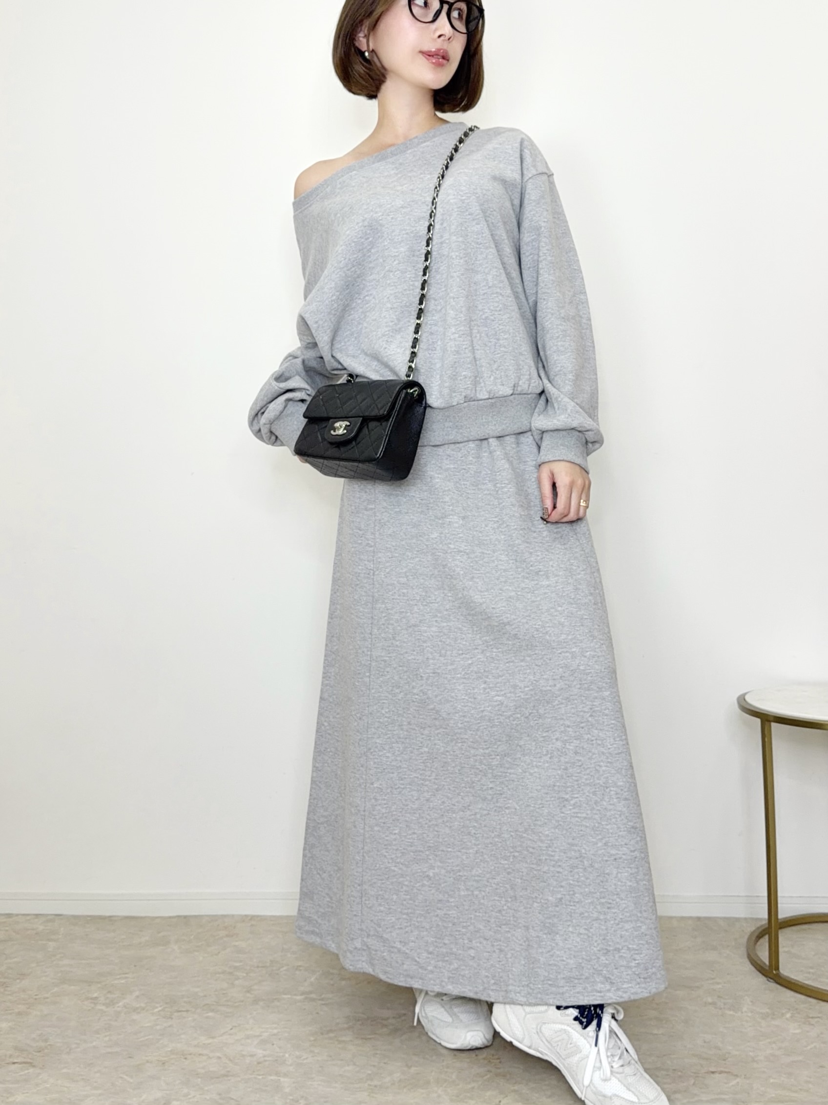カジュアルな印象のスウェットもオフショルダーとスカートの組み合わせで女性らしい印象に。
