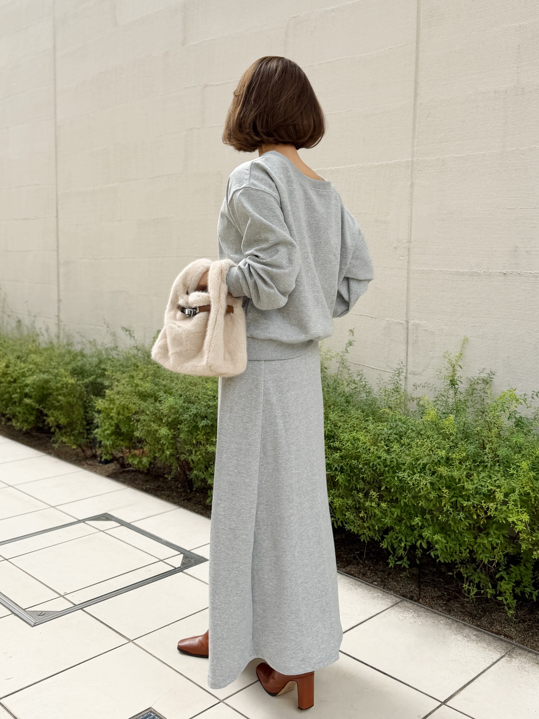 ゆるっとしたシルエットがリラクシーなセットアップ。カジュアルな印象のスウェットもオフショルダーとスカートの組み合わせで女性らしい印象に。ジャケットに合わせると綺麗目にも、ワンマイルウエアや機内コーデにもピッタリ。上下別にも着用可能なので着回しも効きます。スカートのウエスト部分は伸縮性に優れたリブ素材で快適◎アウターの下に着てもモタつかない適度な厚みのある生地もポイント。スウエット好き、カジュアル好きな方にお勧めのセットアップです。STAFF:158cm【サイズ】(平置き採寸)TOPS:着丈49cm 身幅59cm 肩幅58cm 袖丈52cmSKIRT:スカート丈89cm ウエスト30.5cm ヒップ54cm【素材】ポリエステル65%,コットン35%■クロネコ代金後払いをご利用のお客様■商品到着後に請求書(払込用紙)が到着します。14日以内にお支払いをお願いします。全国の主要なコンビニで、請求書をレジに持っていくだけでお支払いが可能です。全国の郵便局でも同じ請求書でお支払いできます。※ご請求書が圧着ハガキタイプの場合、郵便局でのお支払いはできません。※弊社の銀行口座宛にお振込頂くものでは御座いません。ご注意下さい。
