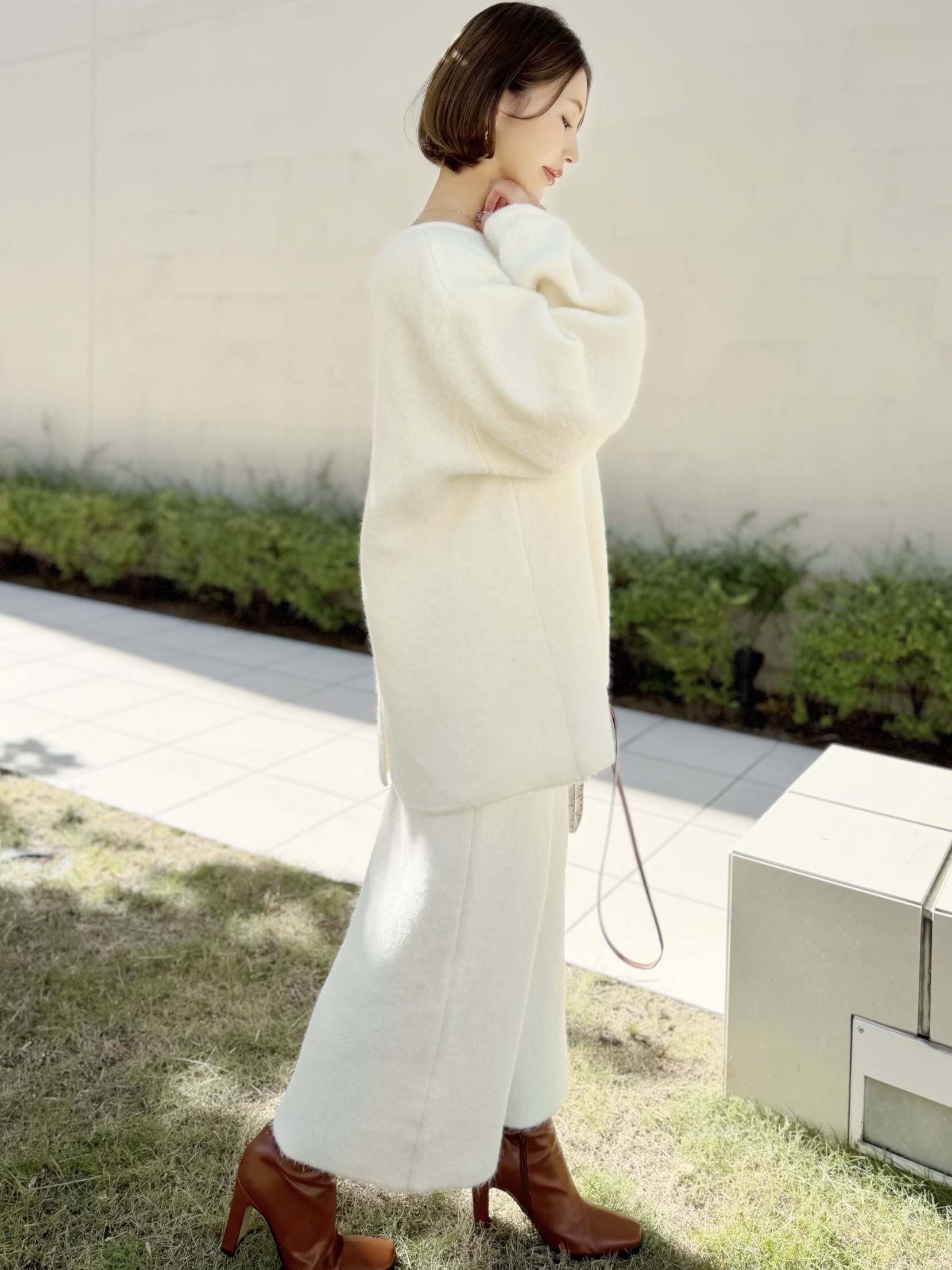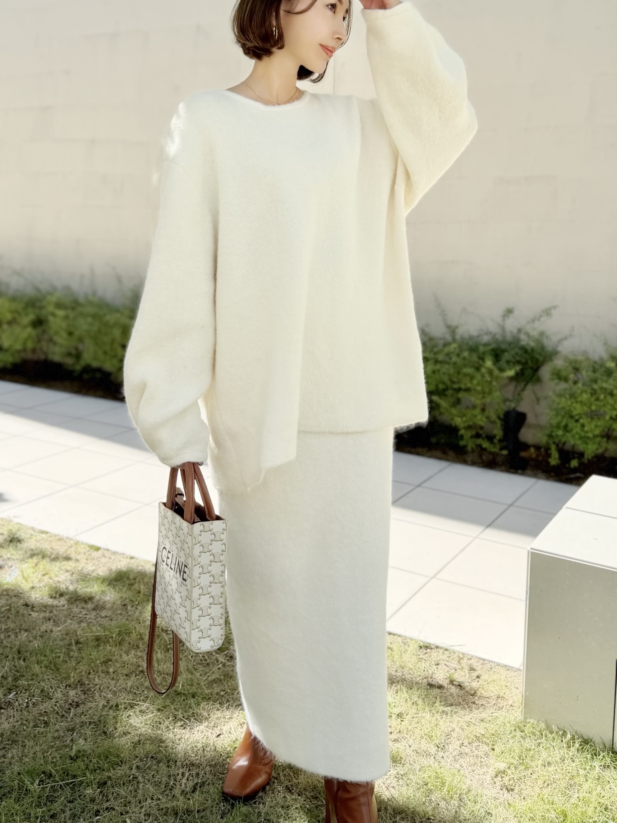 優しいアイボリーの色味が秋冬のスタイルをぱっと明るくしてくれる大人なニットセットアップです。