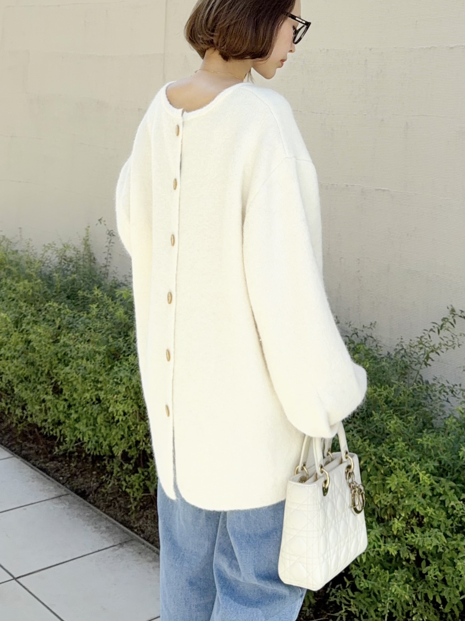 トップスはカーディガンとしても着用可能。前後どちらでもお召しいただけます。