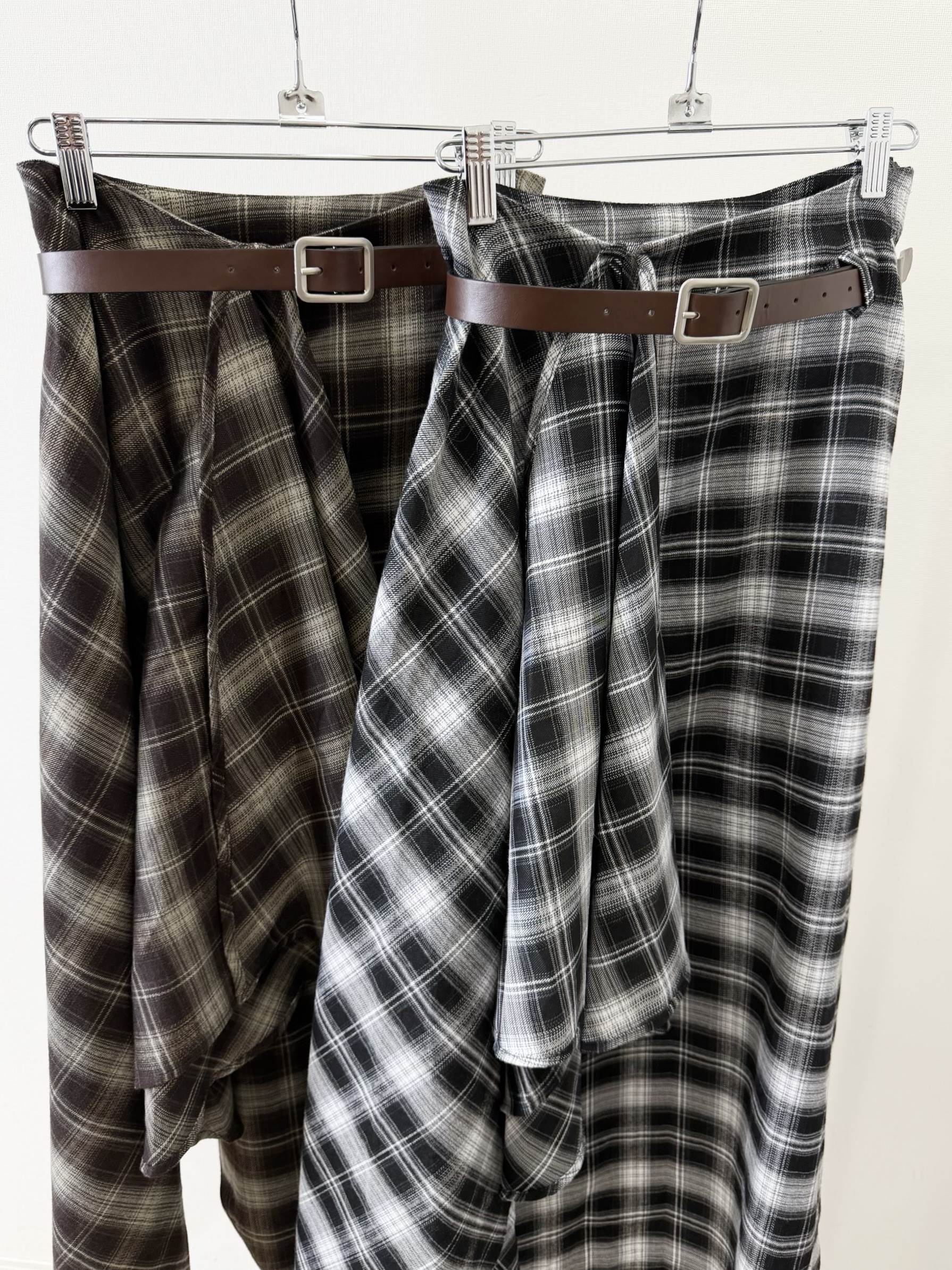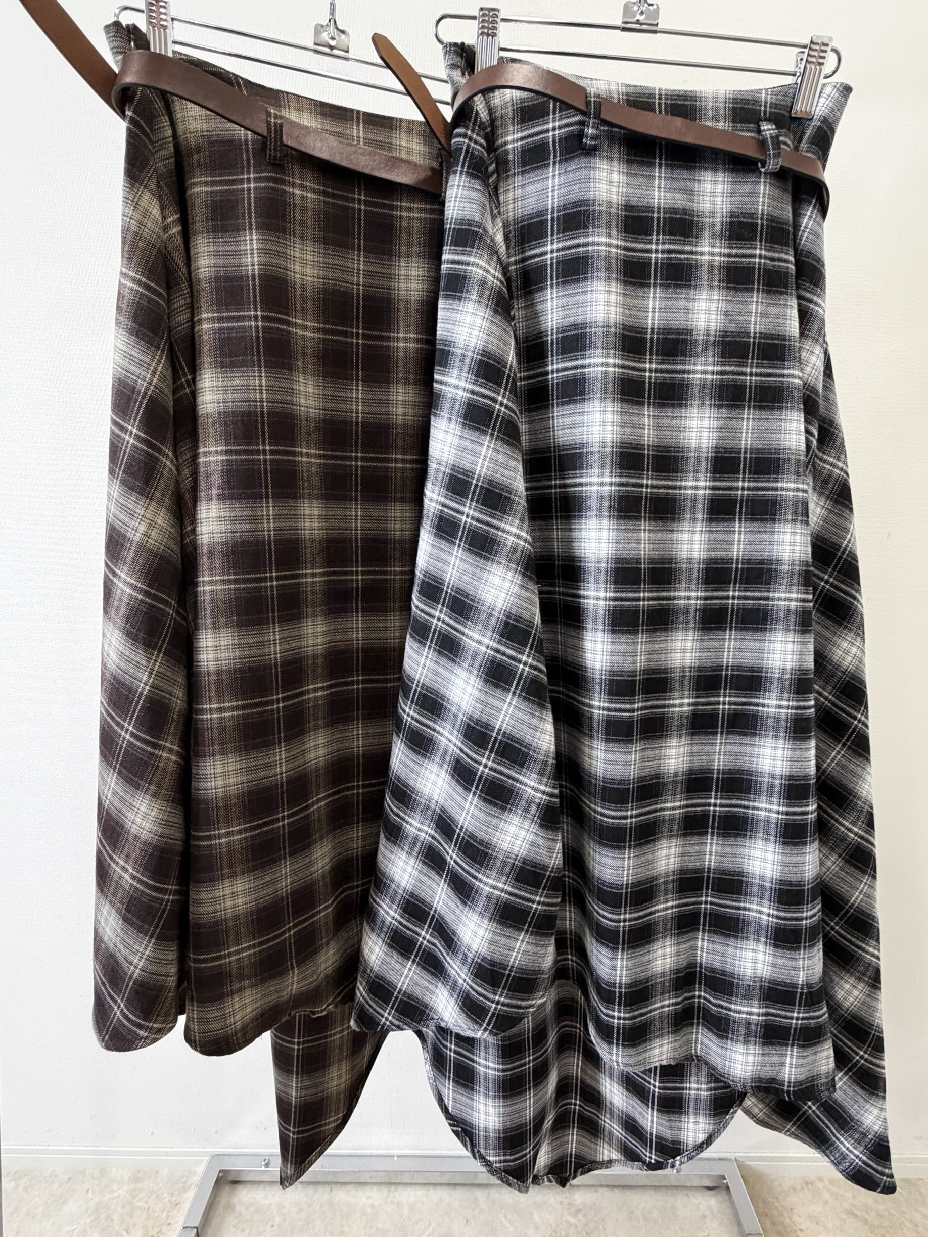 ニットやスウェットなど様々なトップスにマッチするチェックスカート。重くなりがちな秋冬のスタイリングに抜け感を演出してくれます。動きのあるランダムな裾デザインがポイント。綺麗目にもカジュアルにもお召しいただける1枚。ウエスト部分もゆとりがある為楽に履いていただけます。ソックスやタイツを合わせたりと1年を通して長く履いていただけるスカートです。サイドファスナー開閉。ブラウンのベルトが付属します。STAFF:158cm【サイズ/約:平置き採寸】スカート丈 (最長部分)87cm, (最短部分)71cm ウエスト31cm ヒップ52cm【素材】ポリエステル100%■クロネコ代金後払いをご利用のお客様■商品到着後に請求書(払込用紙)が到着します。14日以内にお支払いをお願いします。全国の主要なコンビニで、請求書をレジに持っていくだけでお支払いが可能です。全国の郵便局でも同じ請求書でお支払いできます。※ご請求書が圧着ハガキタイプの場合、郵便局でのお支払いはできません。※弊社の銀行口座宛にお振込頂くものでは御座いません。ご注意下さい。