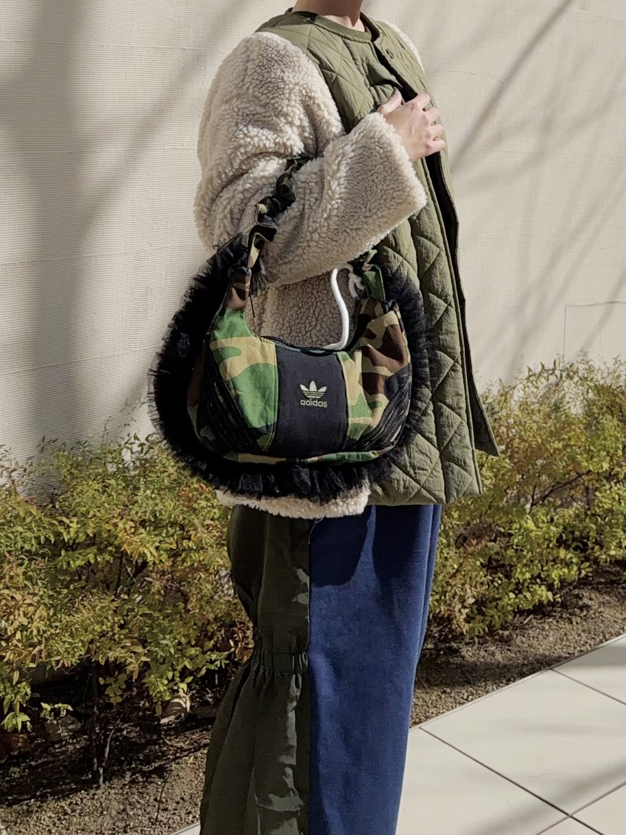 adidasのスウエットとカモフラージュ柄の生地を組み合わせてリメイクした2wayバッグ。