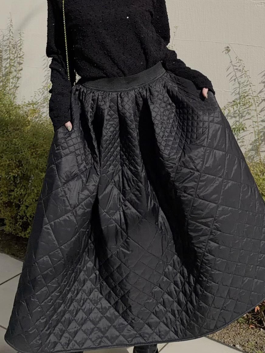 ふんわり広がるシルエットで360°素敵にキマるキルティングフレアスカート。