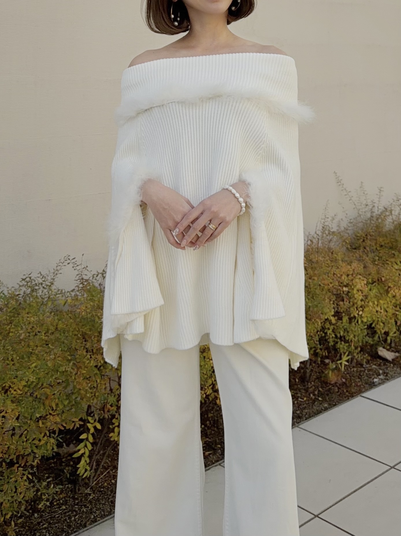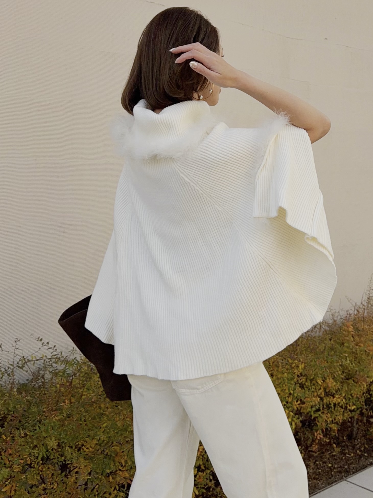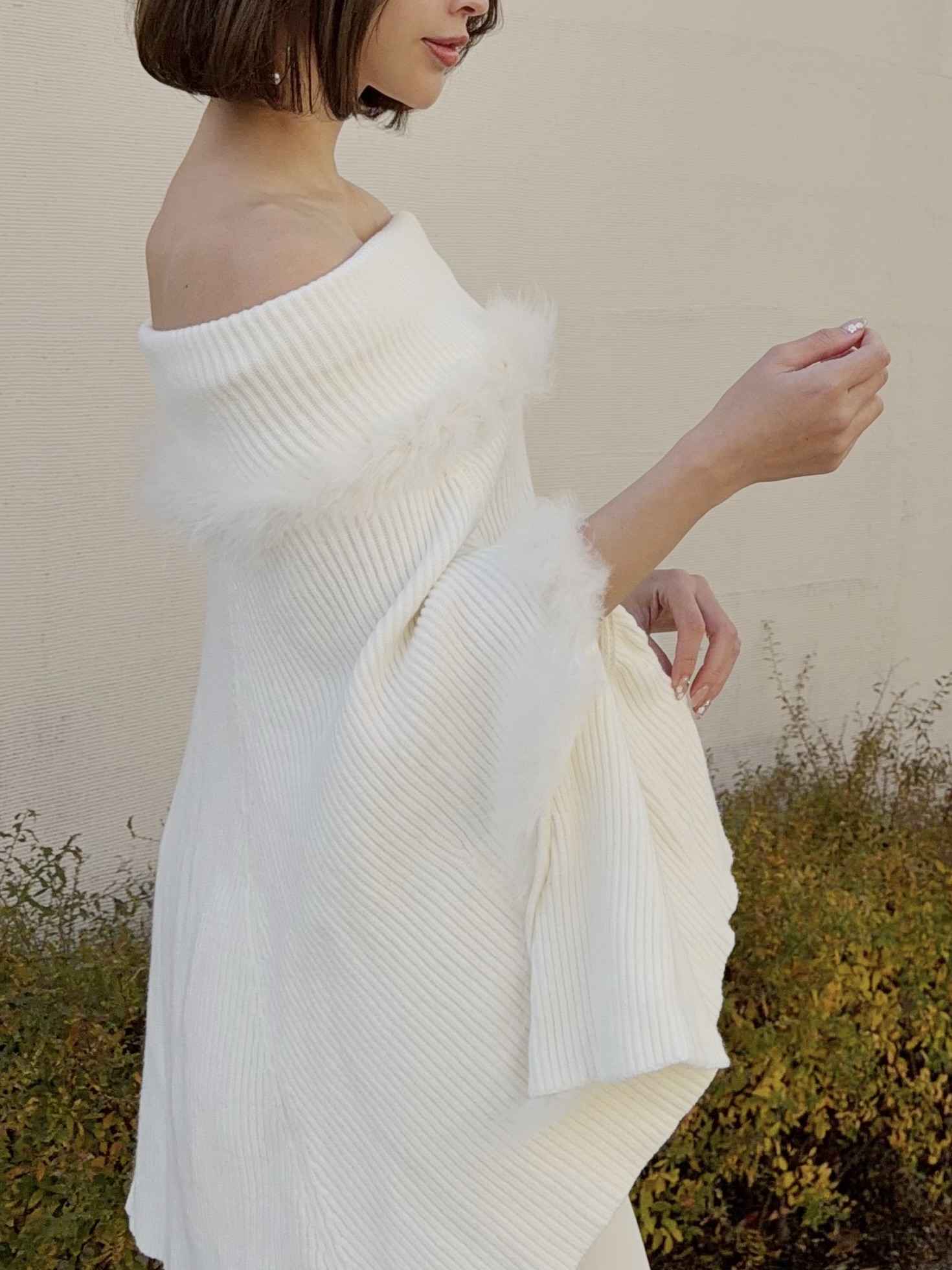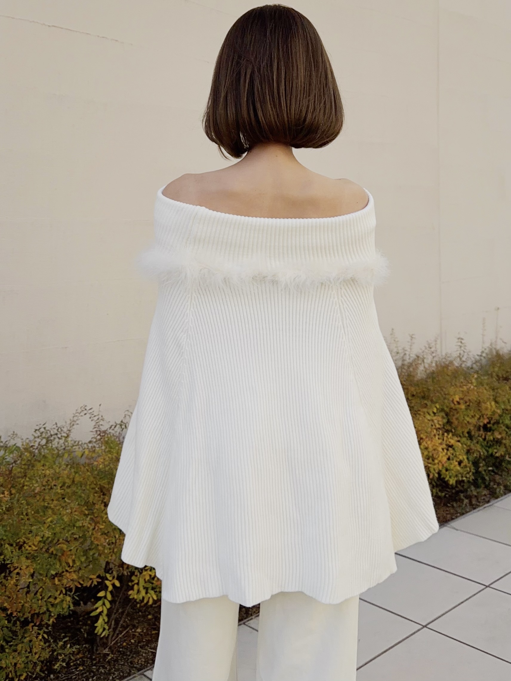 フェザーがあしらわれた華やかケープニット。冬のスタイリングに映えるホワイトで目立つこと間違いなし。身体のラインを拾わないケープシルエットが大人に嬉しい一枚。タートルニットや、薄手のインナーの上にレイヤードさせても可愛い1枚です。ちくちくしないもちっとしたニット素材で着心地も◎オフショルダーとしても着用可能な2wayデザインです。※フェザーは取り外し不可。STAFF:158cm【サイズ】(平置き採寸)着丈67cm【素材】ポリエステル95%,ポリウレタン5% 付属部分フェザー100%■クロネコ代金後払いをご利用のお客様■商品到着後に請求書(払込用紙)が到着します。14日以内にお支払いをお願いします。全国の主要なコンビニで、請求書をレジに持っていくだけでお支払いが可能です。全国の郵便局でも同じ請求書でお支払いできます。※ご請求書が圧着ハガキタイプの場合、郵便局でのお支払いはできません。※弊社の銀行口座宛にお振込頂くものでは御座いません。ご注意下さい。