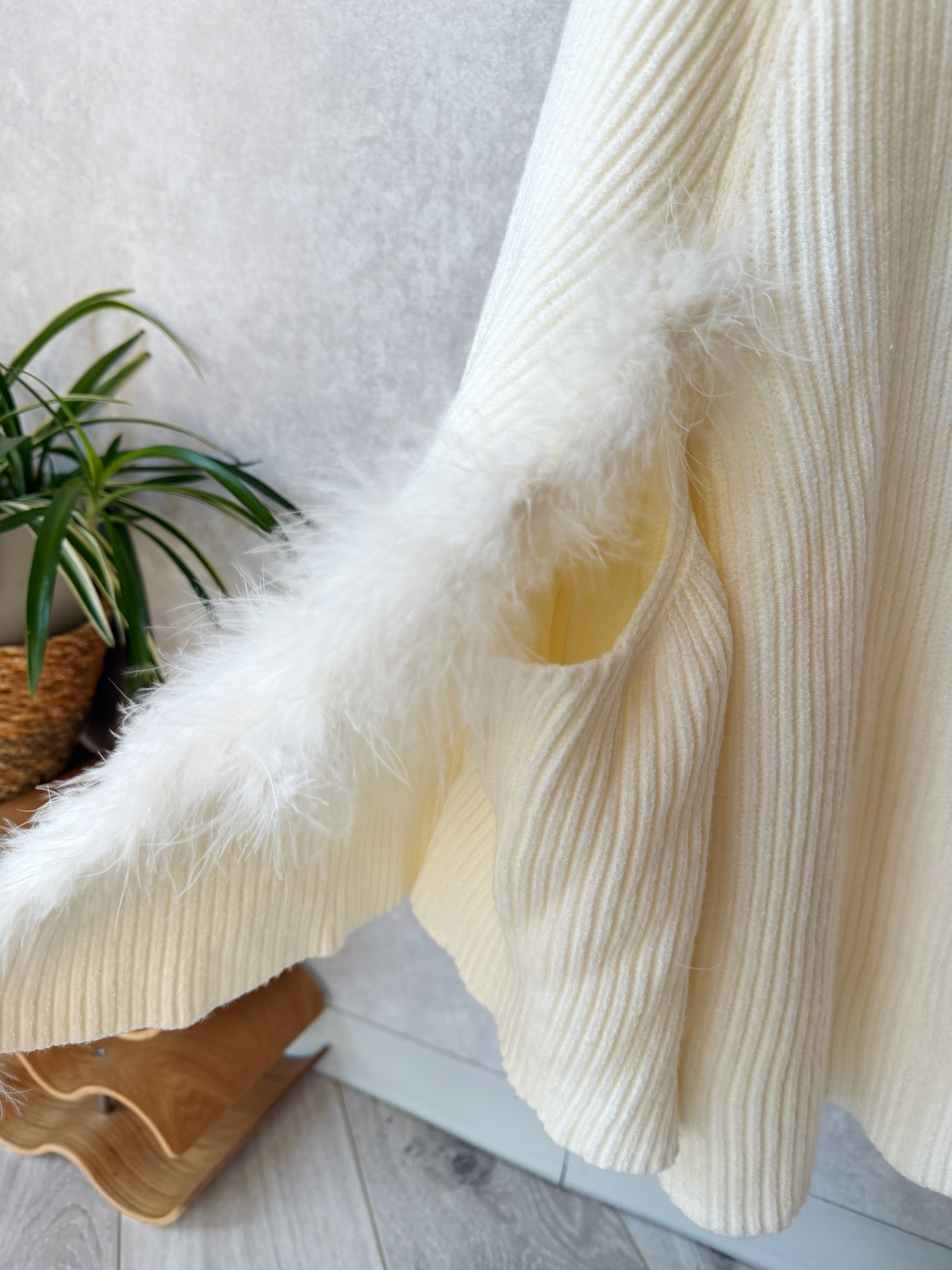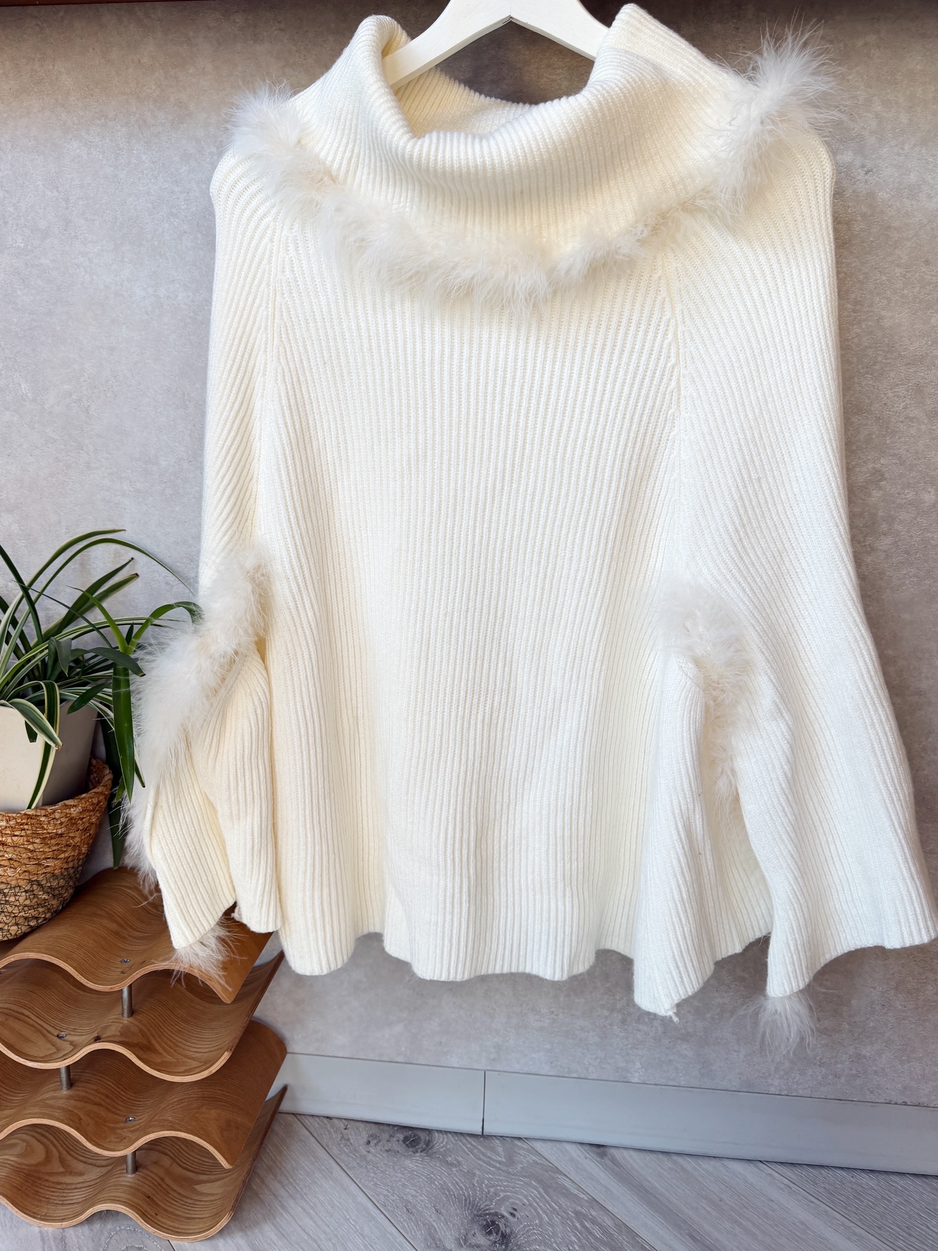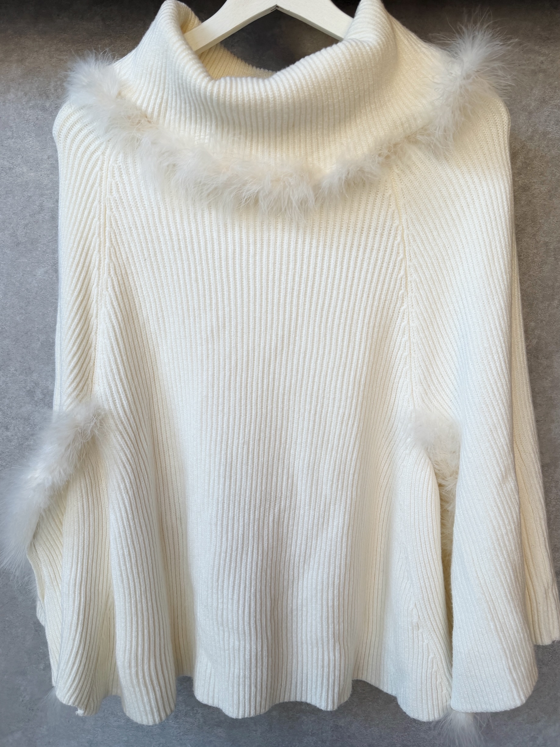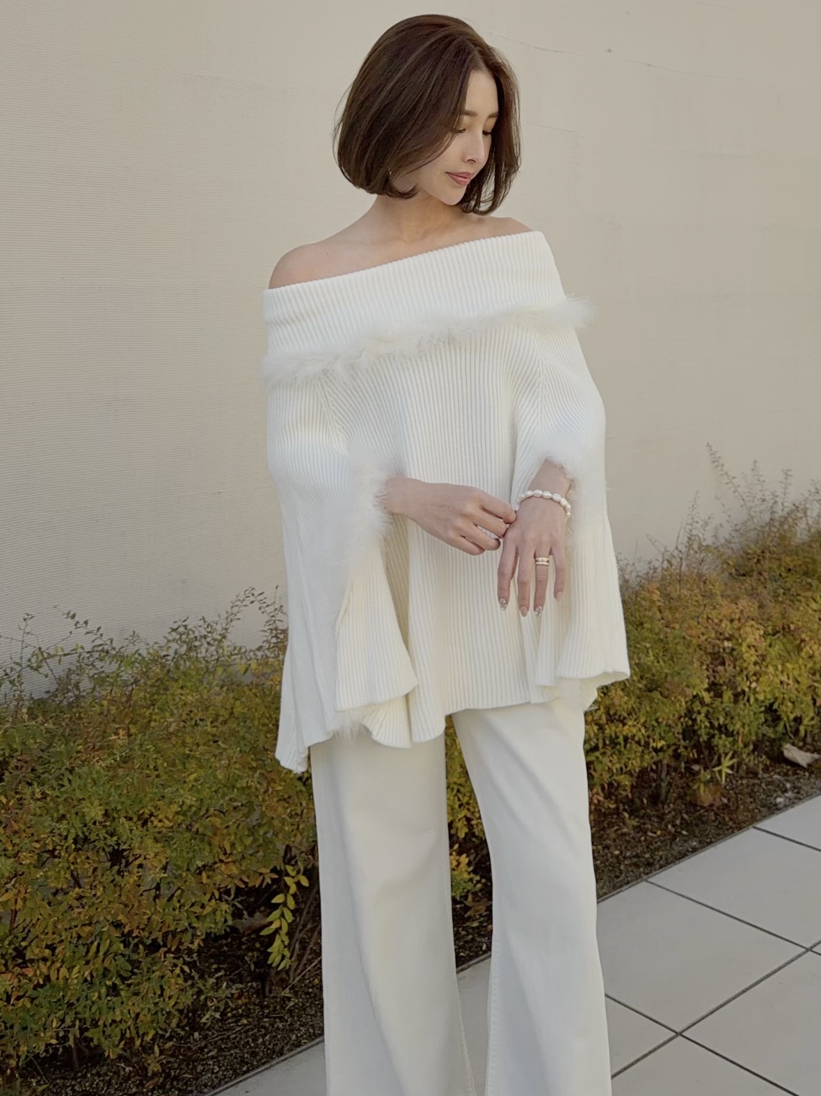 フェザーがあしらわれた華やかケープニット。冬のスタイリングに映えるホワイトで目立つこと間違いなし。身体のラインを拾わないケープシルエットが大人に嬉しい一枚。タートルニットや、薄手のインナーの上にレイヤードさせても可愛い1枚です。ちくちくしないもちっとしたニット素材で着心地も◎オフショルダーとしても着用可能な2wayデザインです。※フェザーは取り外し不可。STAFF:158cm【サイズ】(平置き採寸)着丈67cm【素材】ポリエステル95%,ポリウレタン5% 付属部分フェザー100%■クロネコ代金後払いをご利用のお客様■商品到着後に請求書(払込用紙)が到着します。14日以内にお支払いをお願いします。全国の主要なコンビニで、請求書をレジに持っていくだけでお支払いが可能です。全国の郵便局でも同じ請求書でお支払いできます。※ご請求書が圧着ハガキタイプの場合、郵便局でのお支払いはできません。※弊社の銀行口座宛にお振込頂くものでは御座いません。ご注意下さい。
