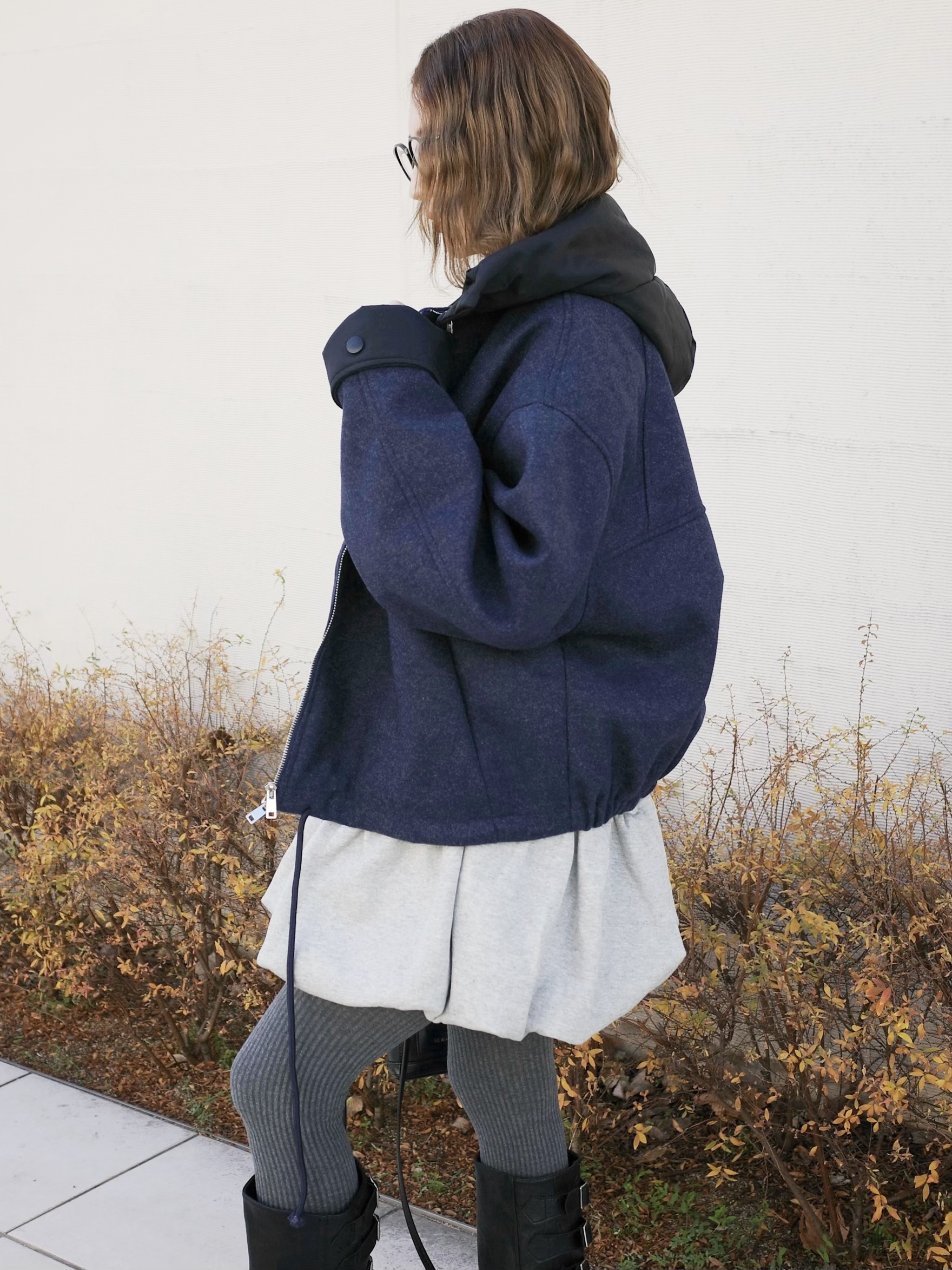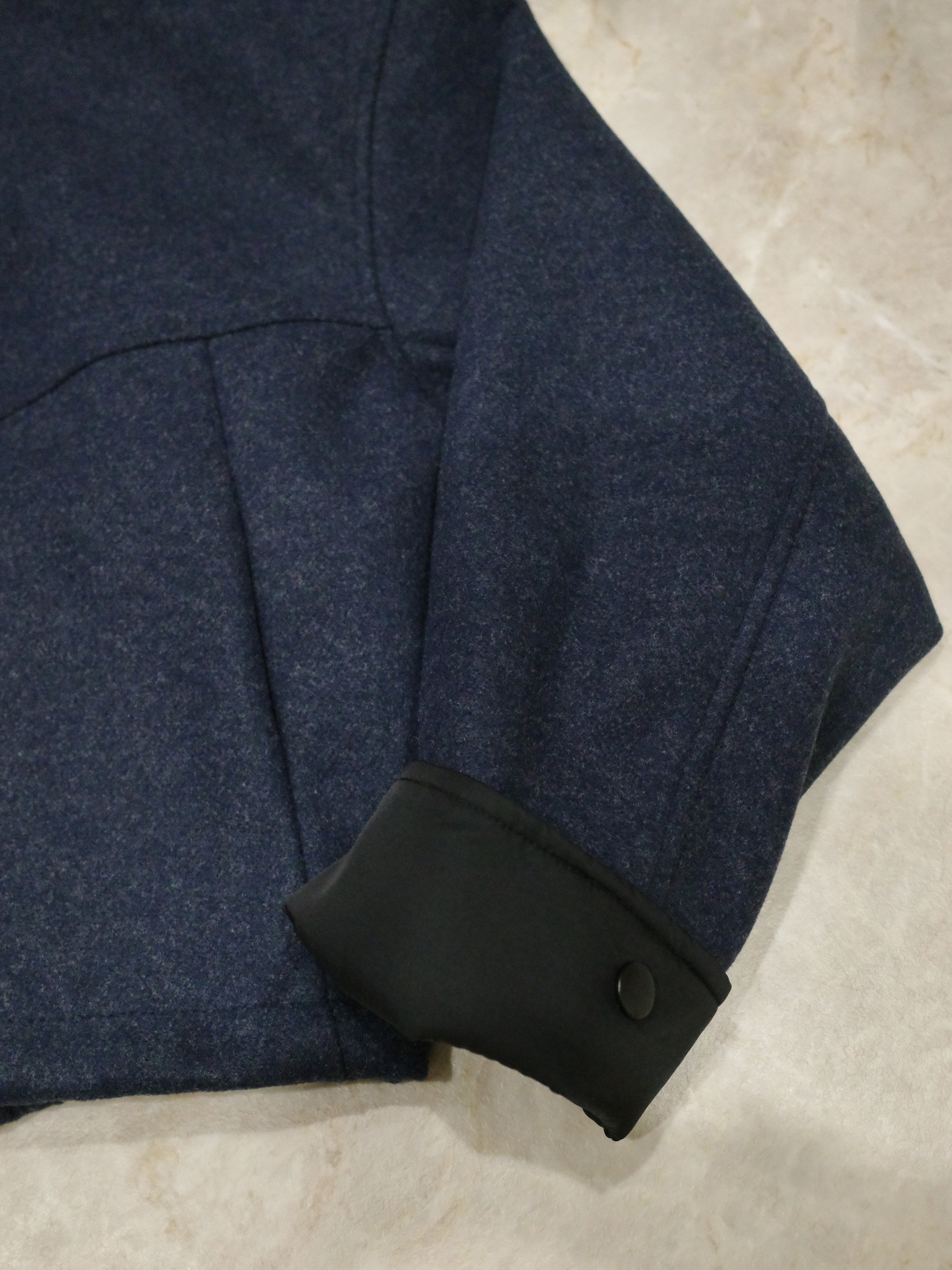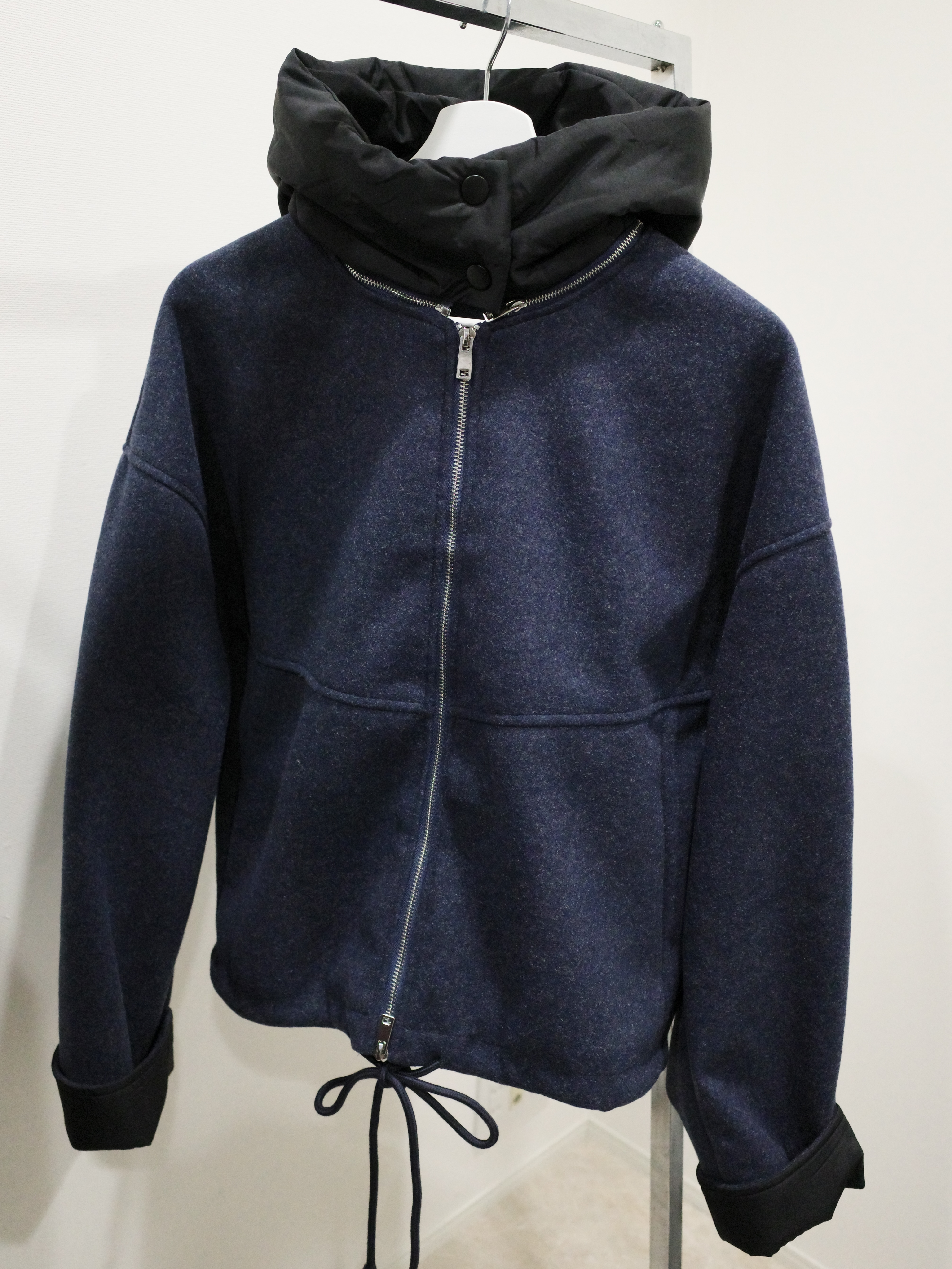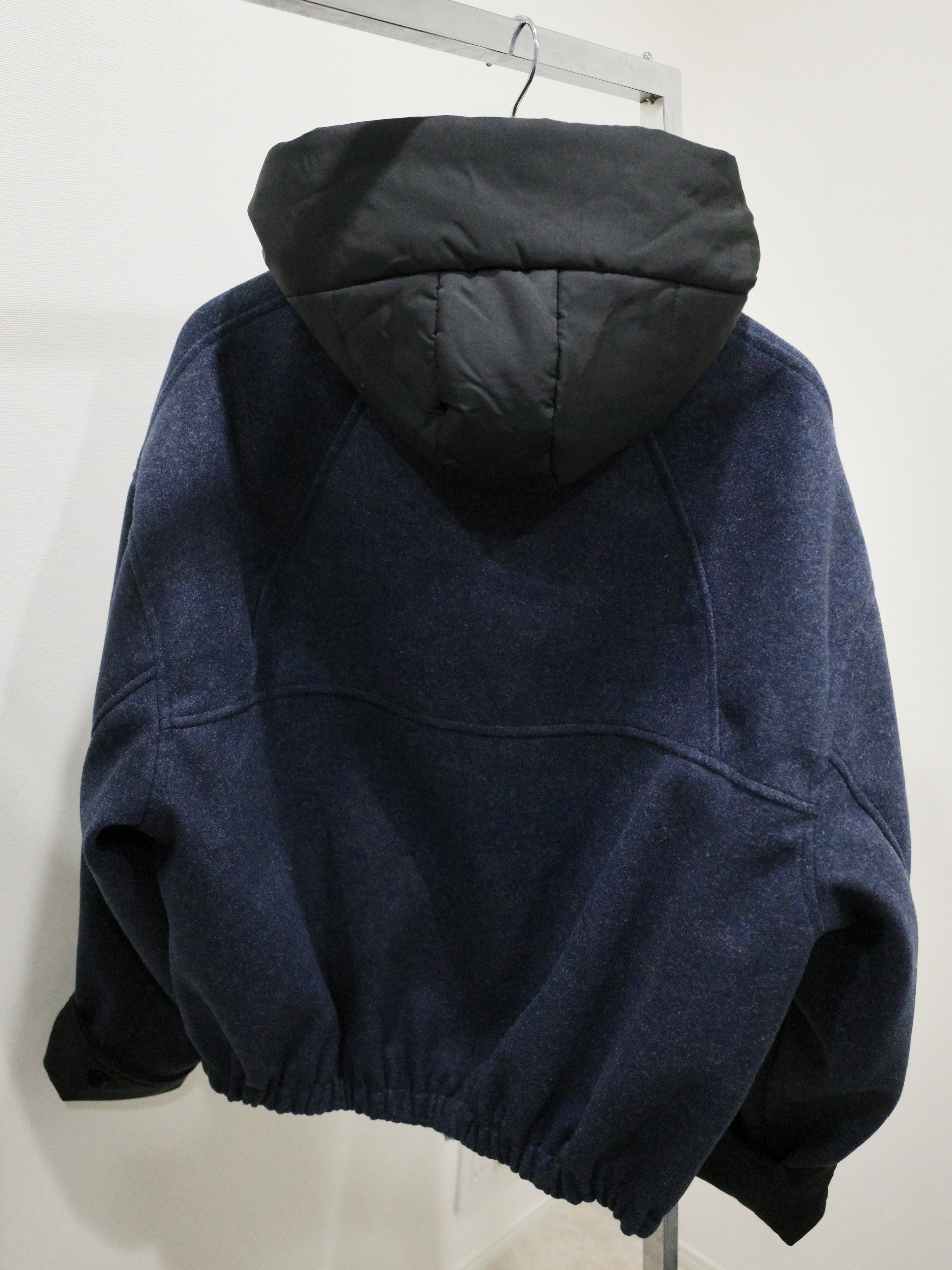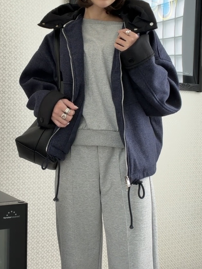 ウールライクなネイビーのボディにブラックの異素材切替のコントラストが映える一着。