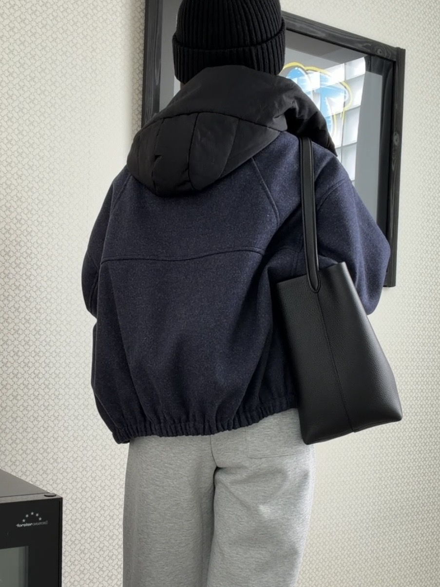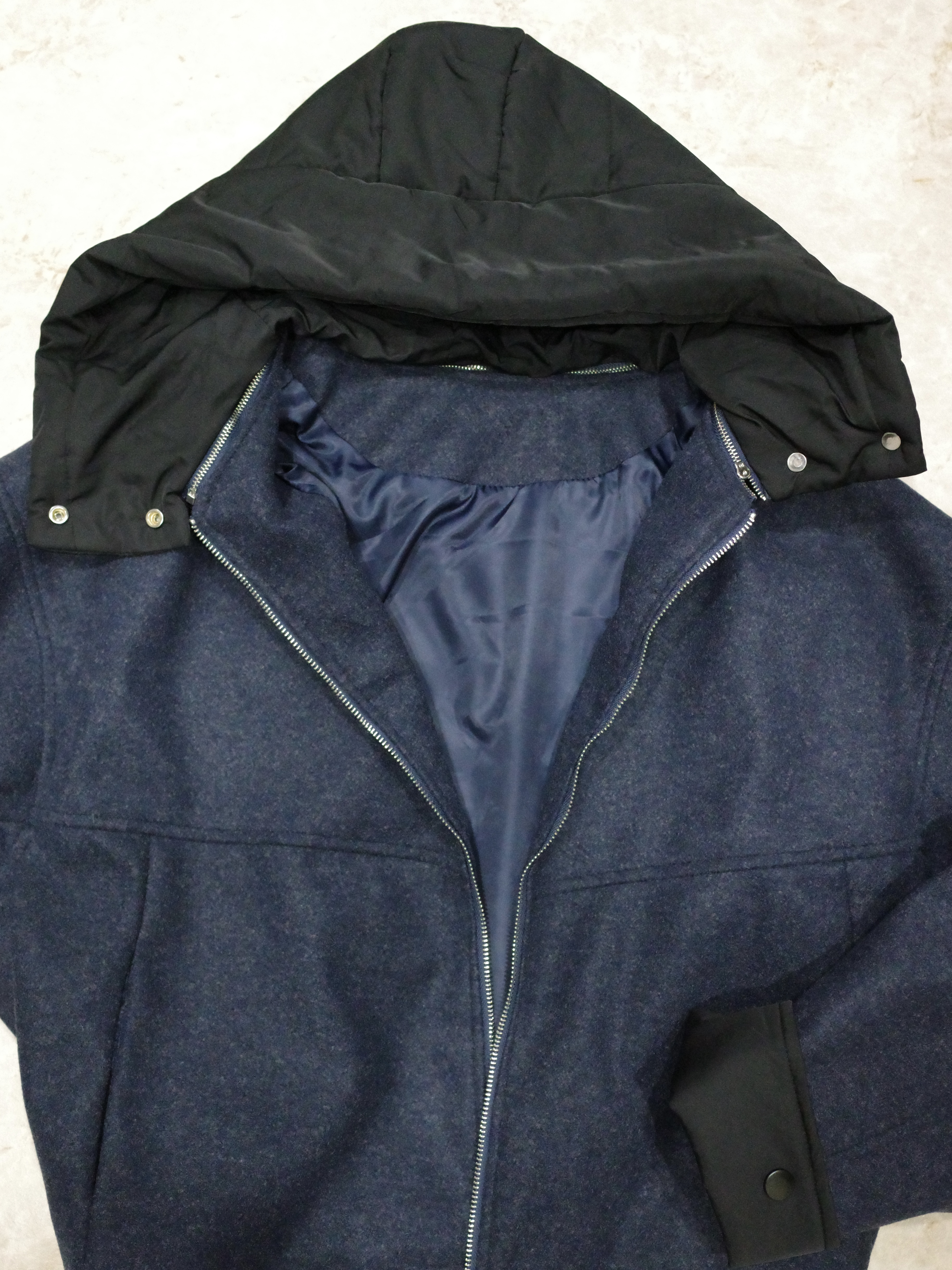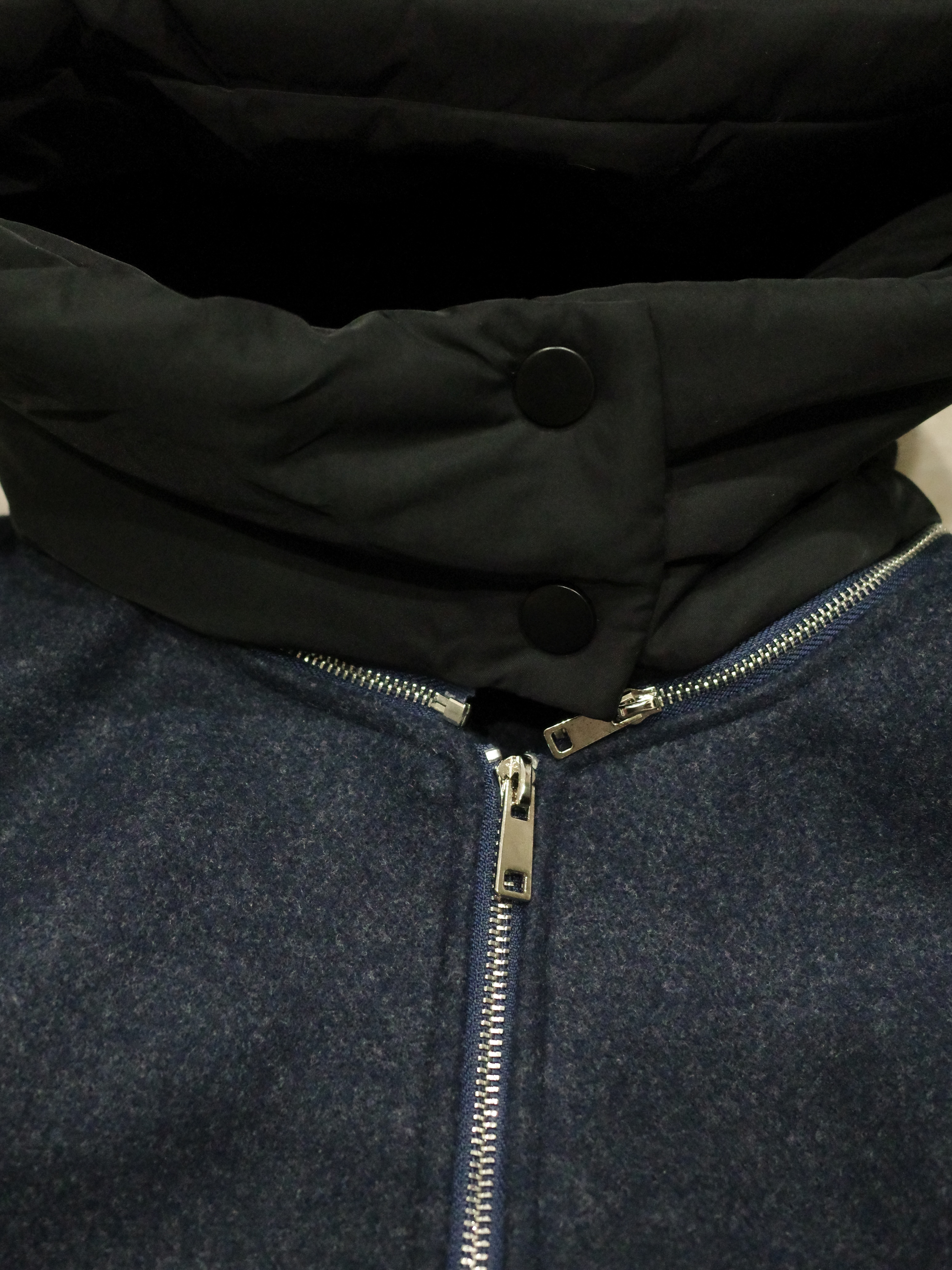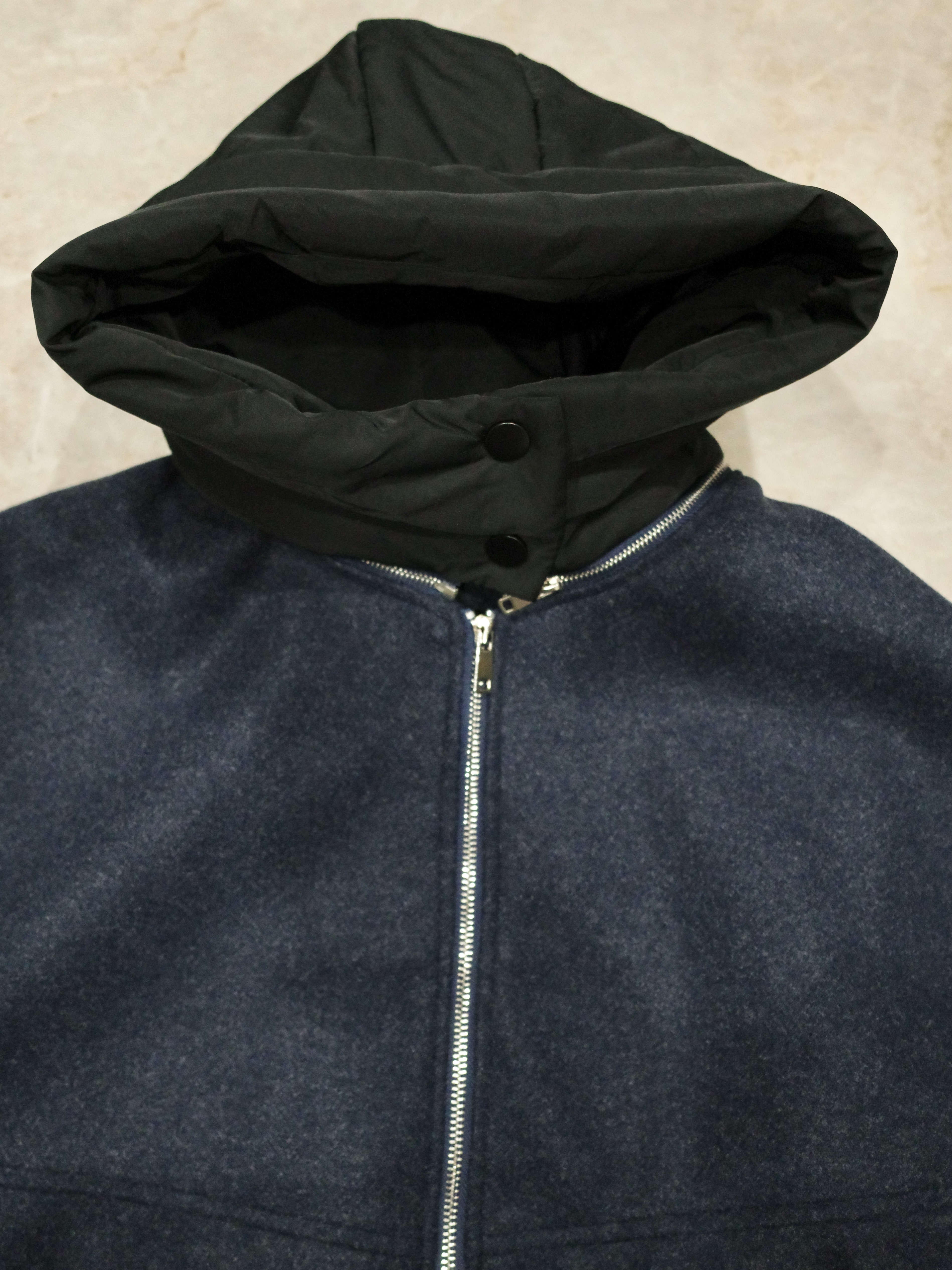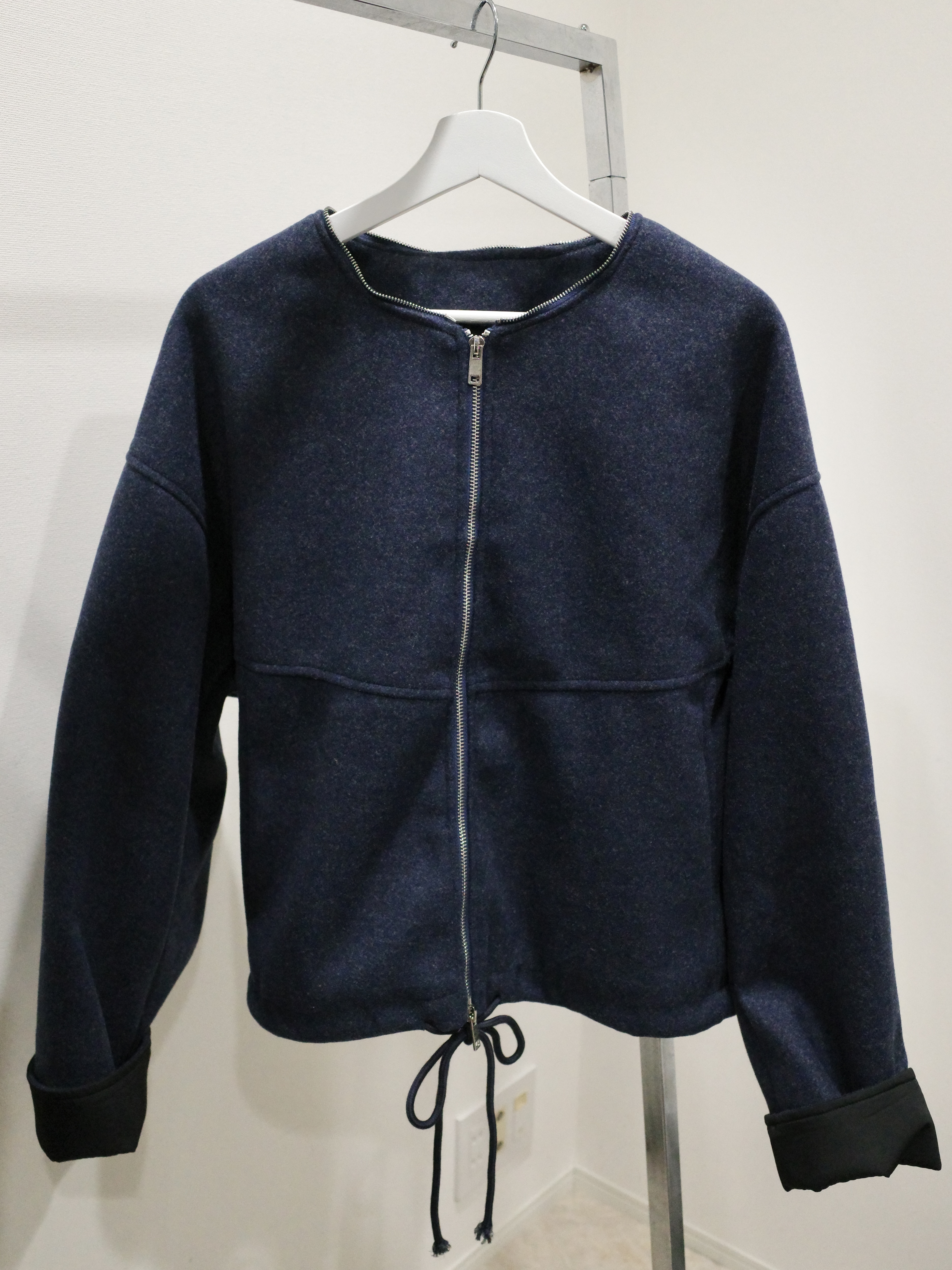 ウールライクなネイビーのボディにブラックの異素材切替のコントラストが映える一着。