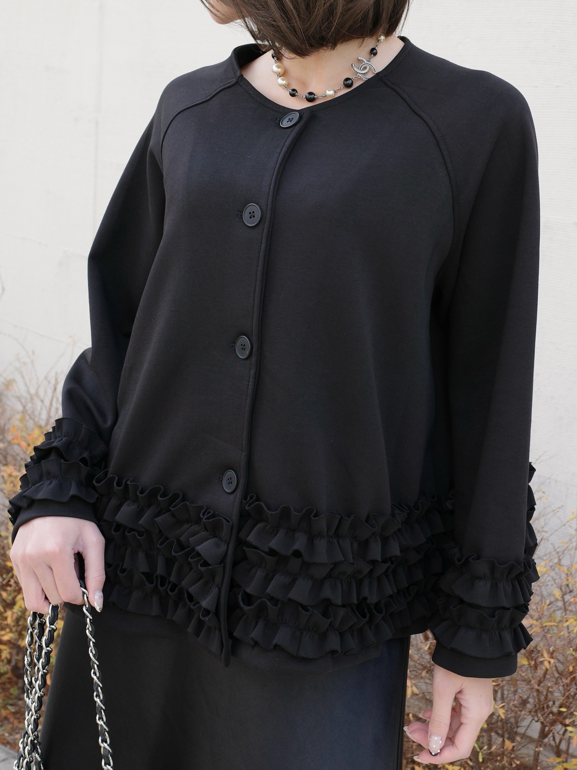 裾と袖口にあしらわれたフリルが上品フェミニンなトップス。トップスとしてはもちろん、カーディガンとしても着用可能な2wayデザイン。身体のラインを拾わないゆとりを持たせたシルエットで体型カバーも叶えます。甘くなり過ぎないフリルで大人でもトライしやすい1枚。伸縮性のある柔らかな素材でアウターを上から羽織ってもモタつきません。シンプルなスタイリングにスパイスをプラスしてくれるアイテムです♡春先の羽織としても活躍します。STAFF:158cm【サイズ】(平置き採寸)着丈59cm 身幅57cm 袖丈52cm【素材】ポリエステル95%,ポリウレタン5%■クロネコ代金後払いをご利用のお客様■商品到着後に請求書(払込用紙)が到着します。14日以内にお支払いをお願いします。全国の主要なコンビニで、請求書をレジに持っていくだけでお支払いが可能です。全国の郵便局でも同じ請求書でお支払いできます。※ご請求書が圧着ハガキタイプの場合、郵便局でのお支払いはできません。※弊社の銀行口座宛にお振込頂くものでは御座いません。ご注意下さい。