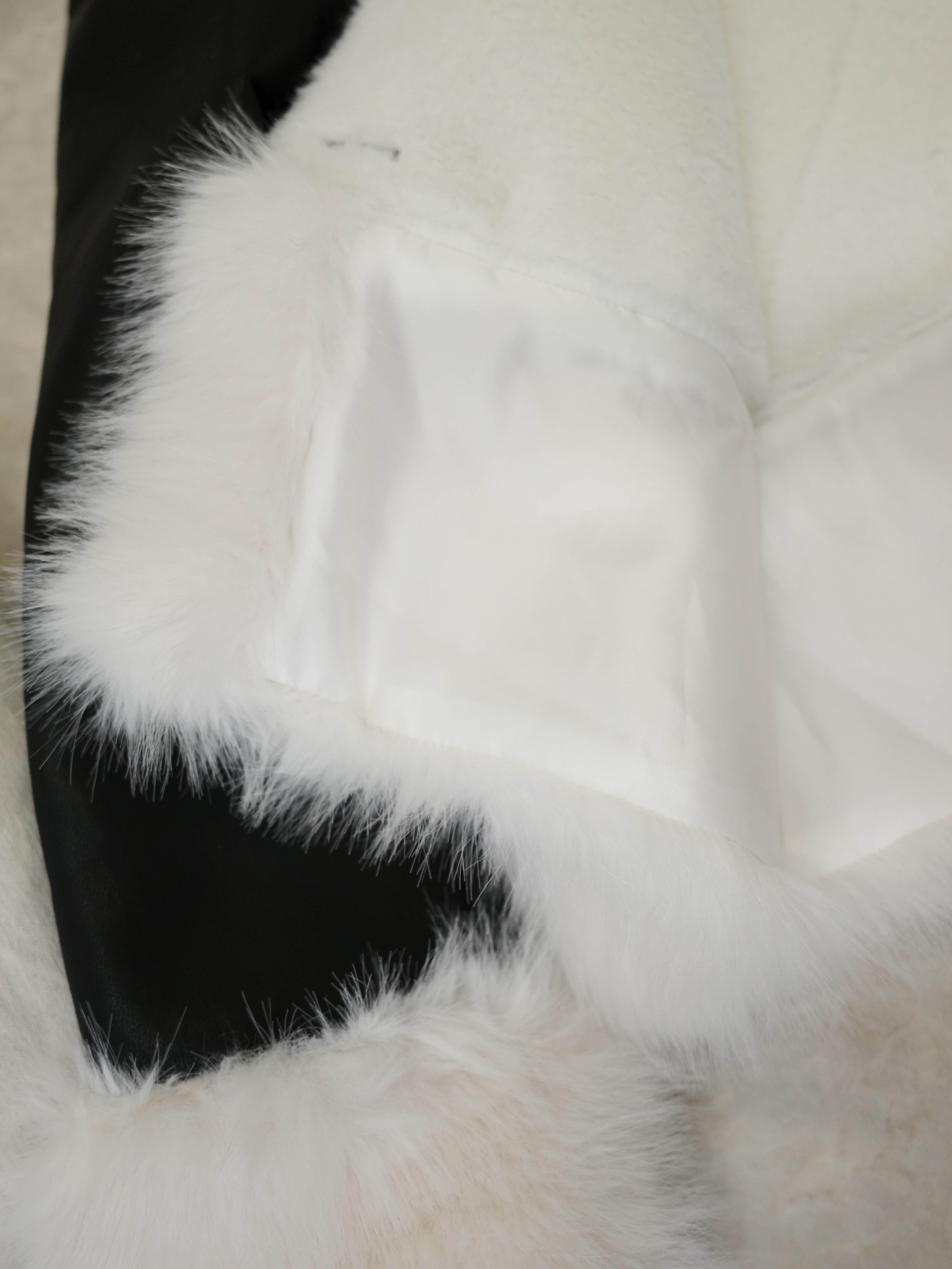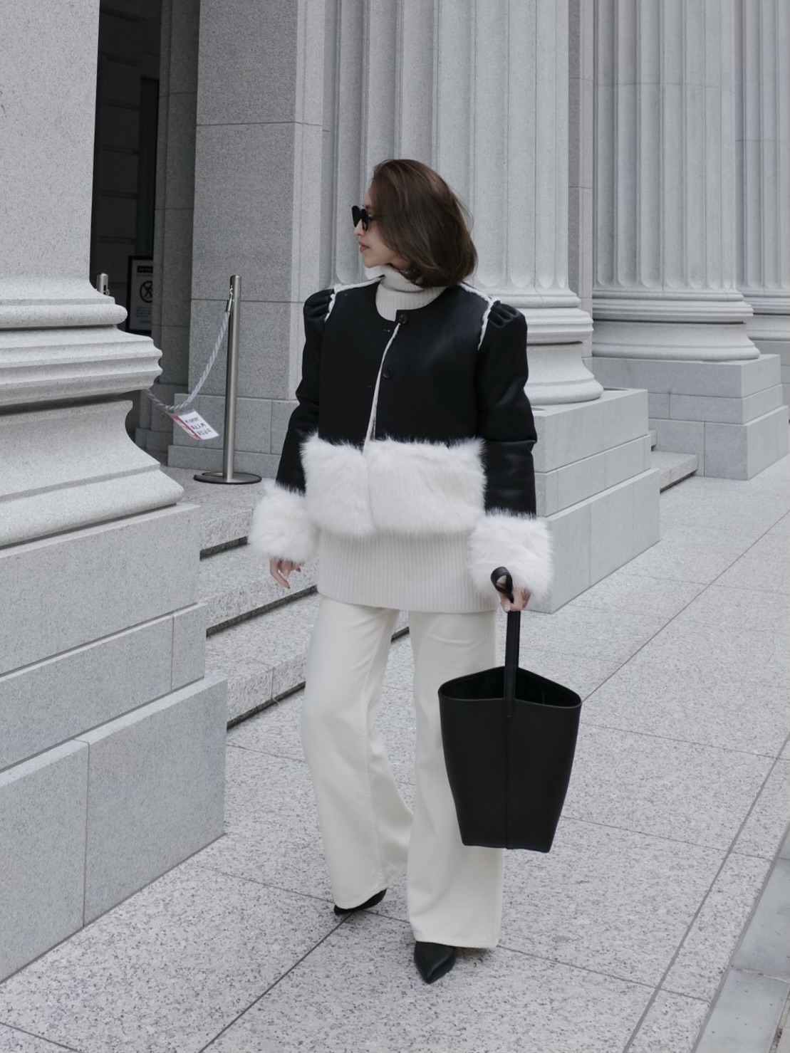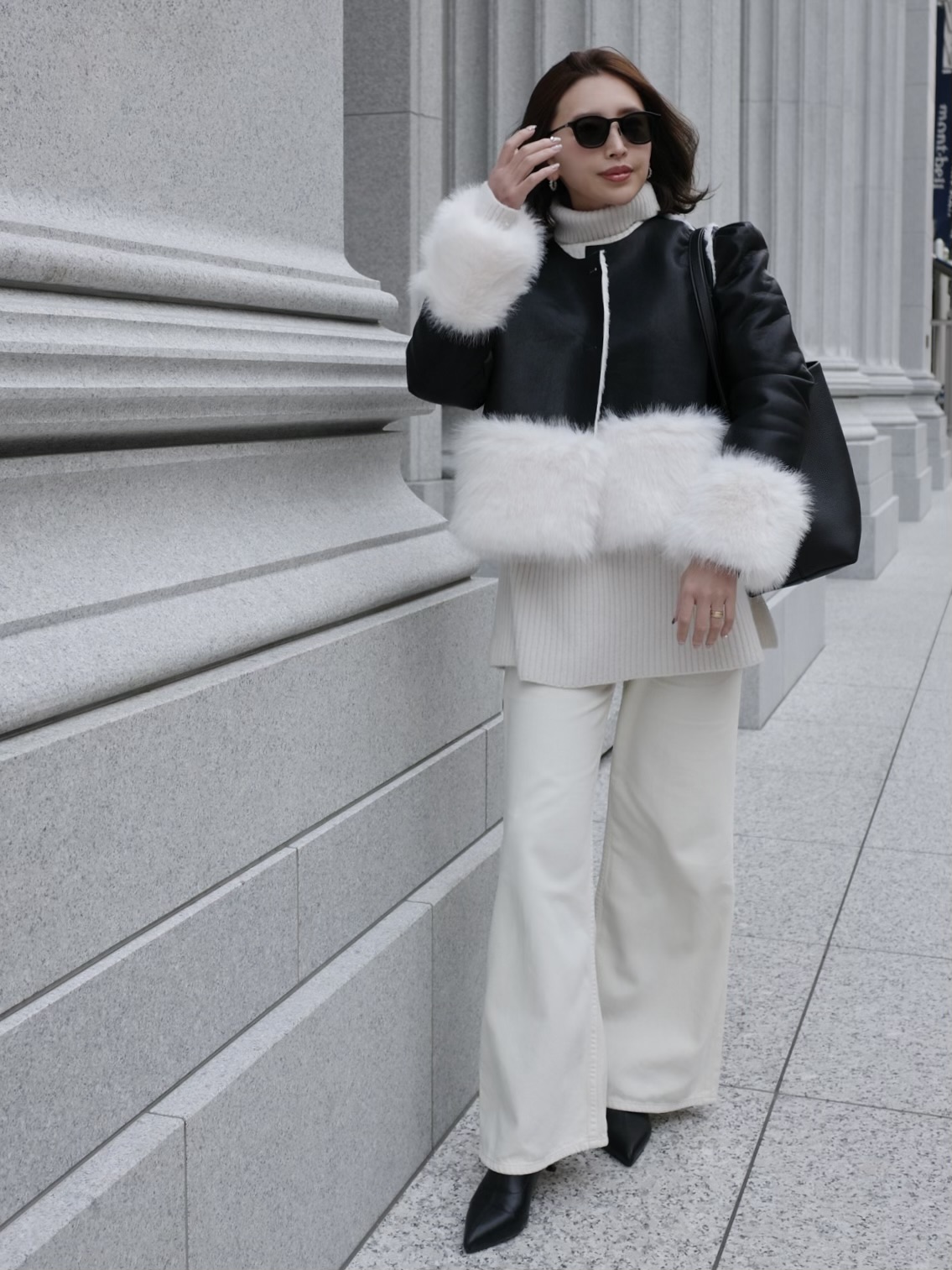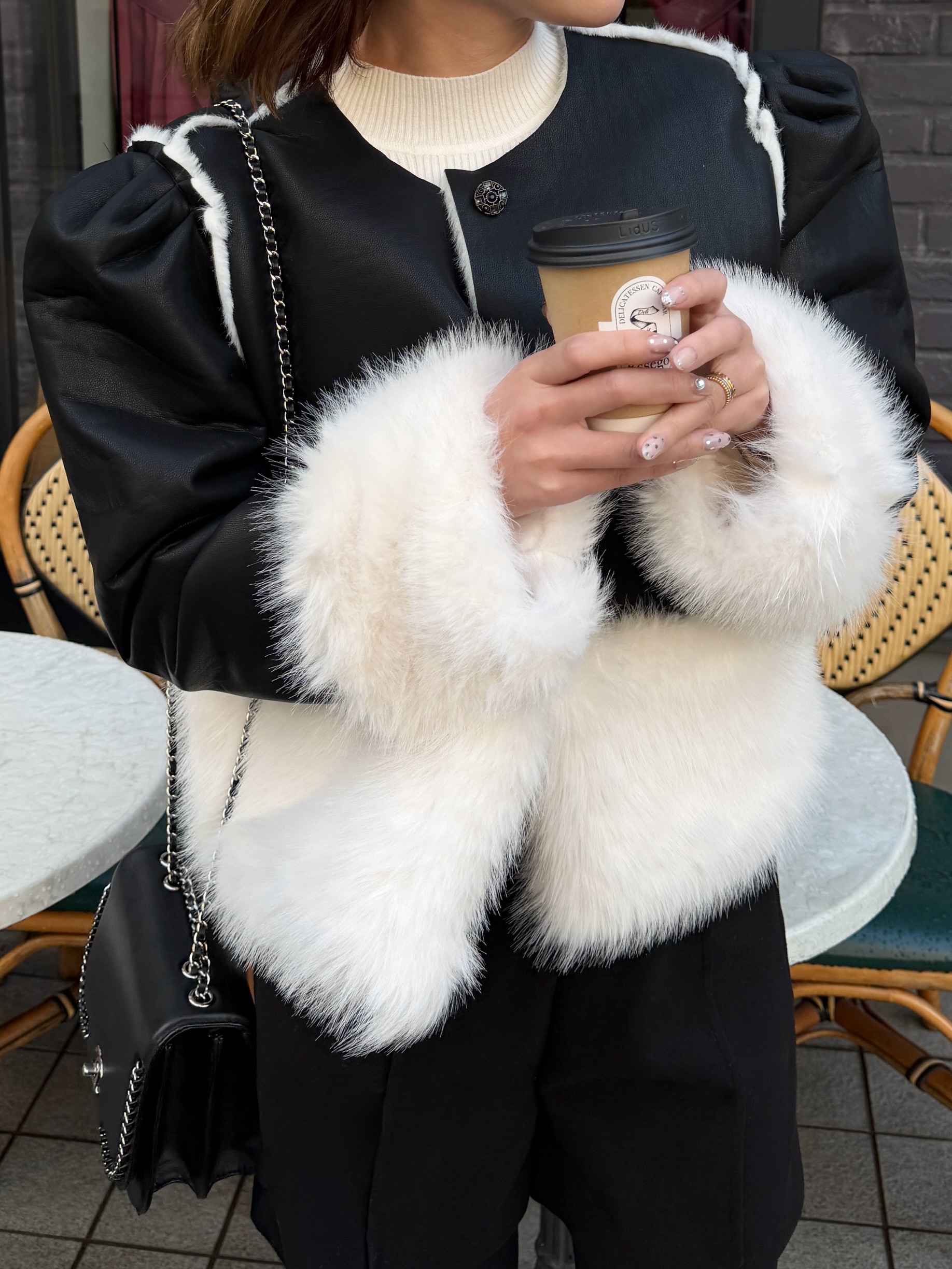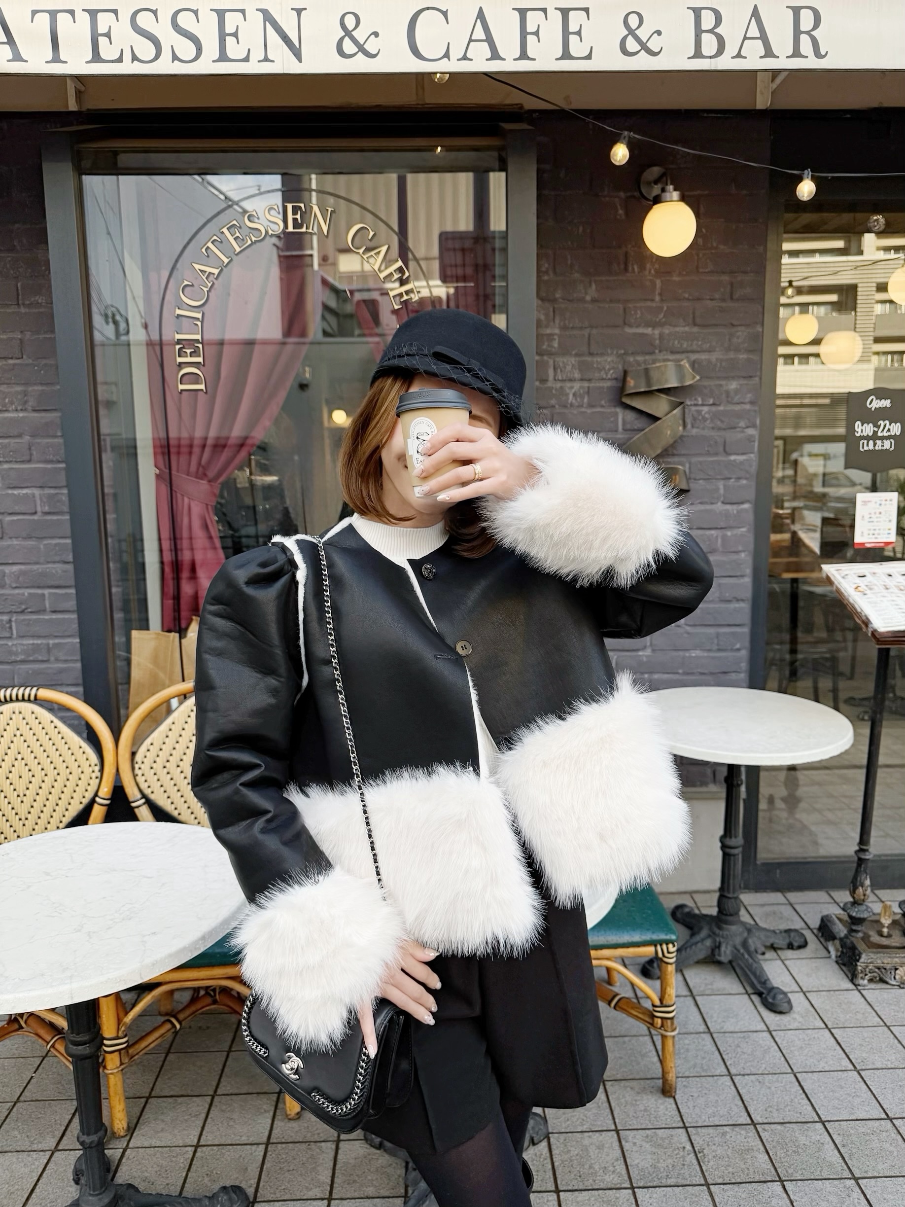 袖口と裾のボリューミーなエコファーがリッチな雰囲気。