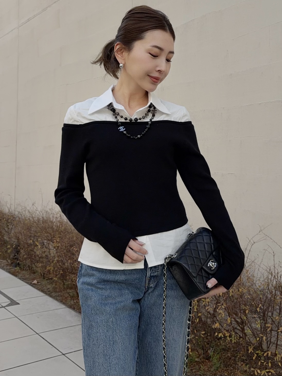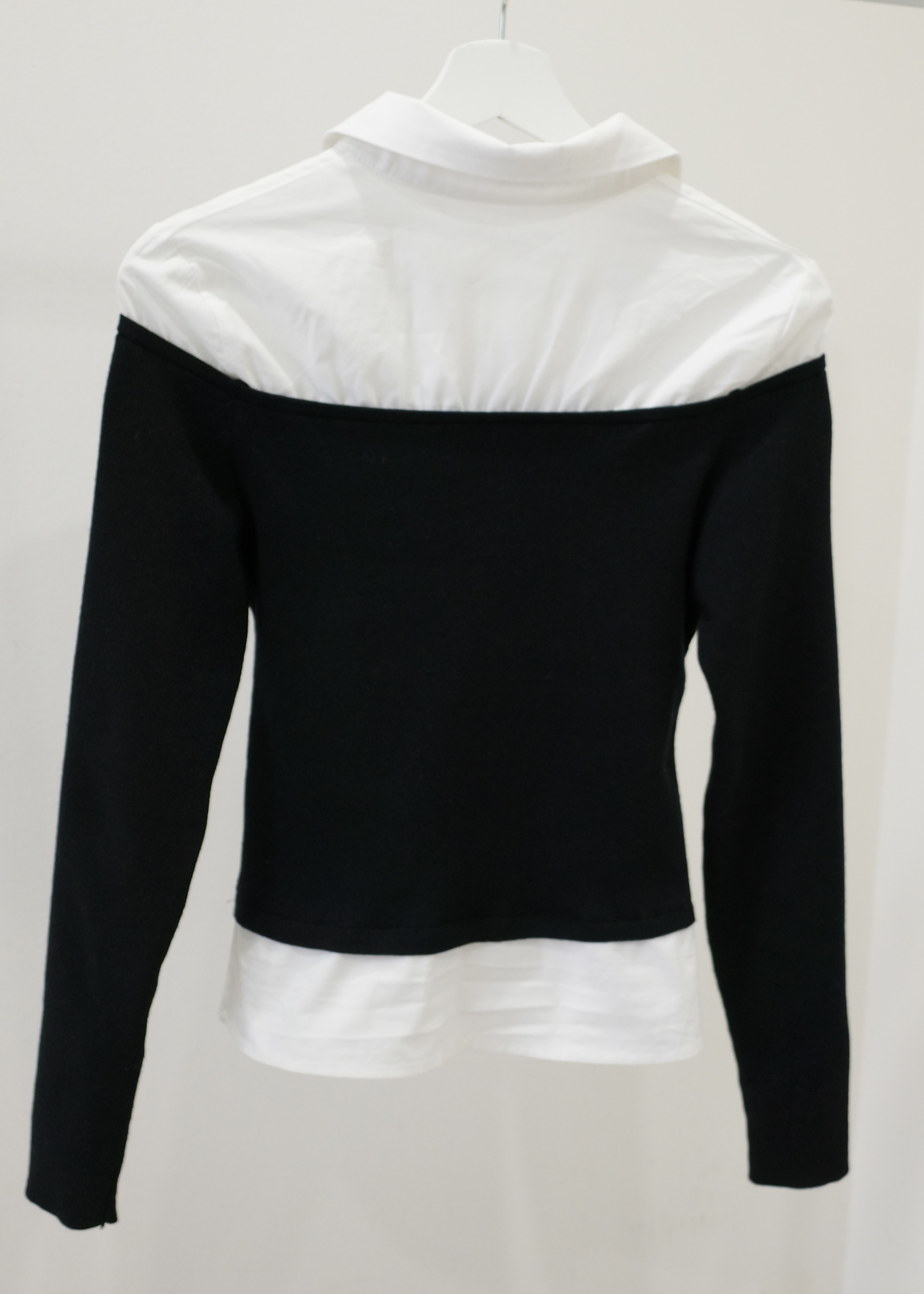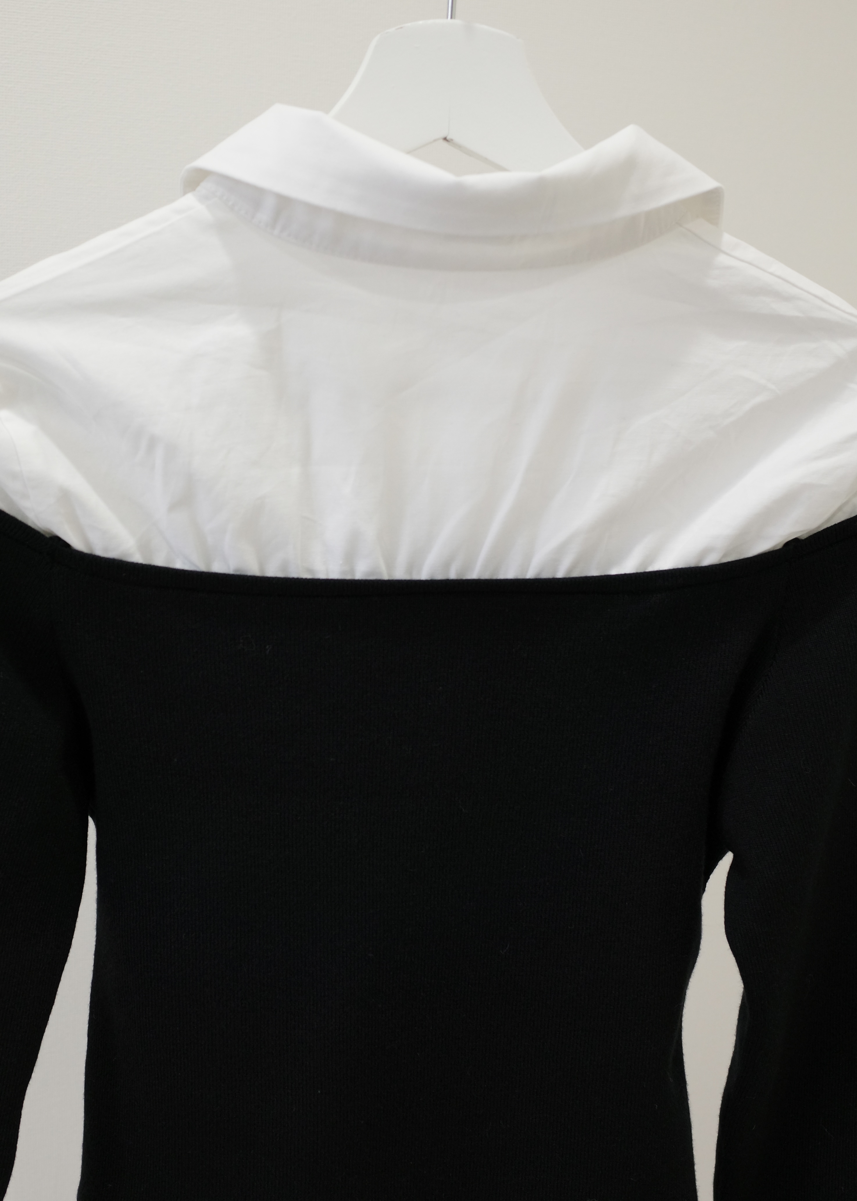 シャツにオフショルダーニットをレイヤードさせたユニークなブラウス。