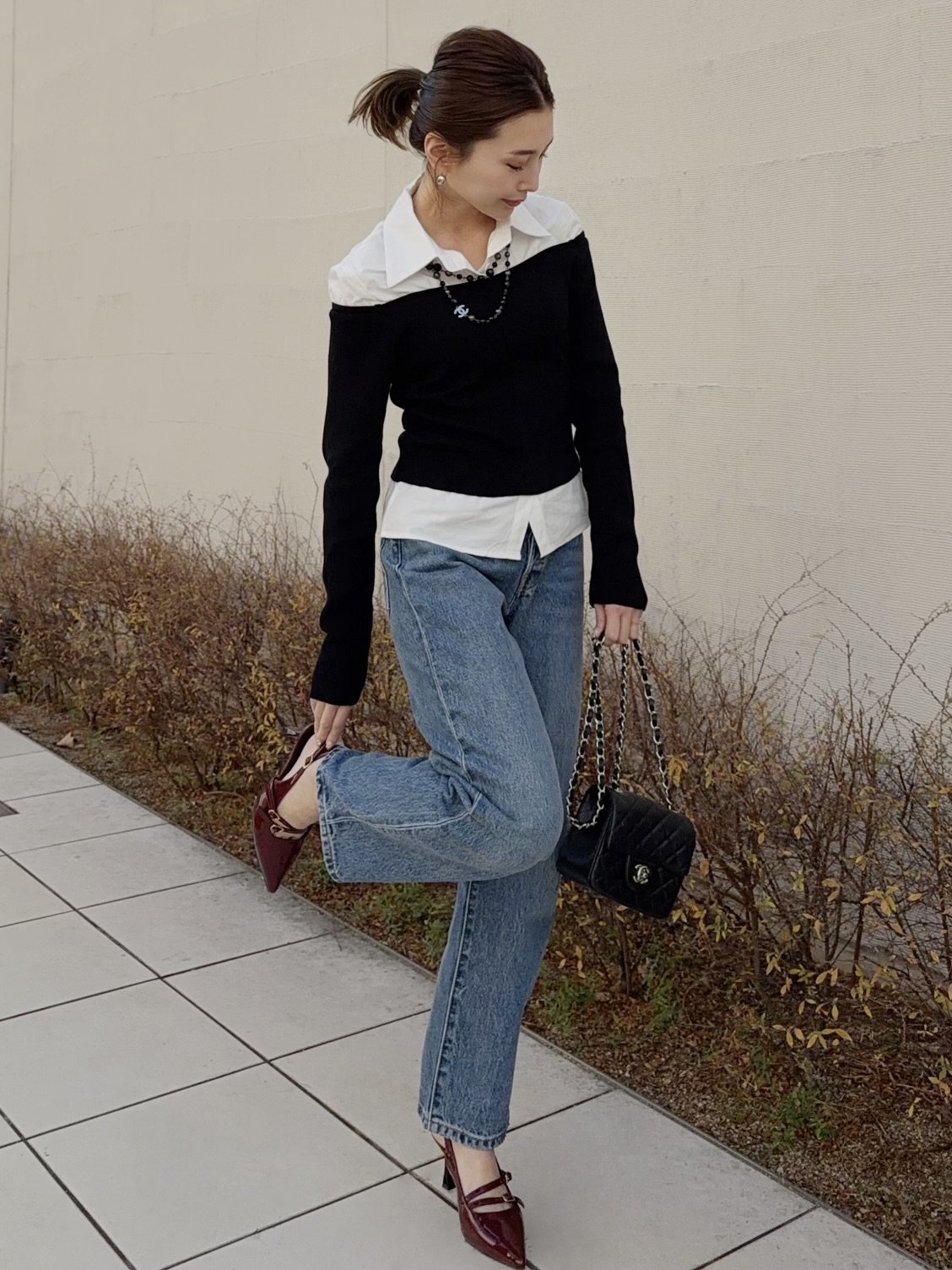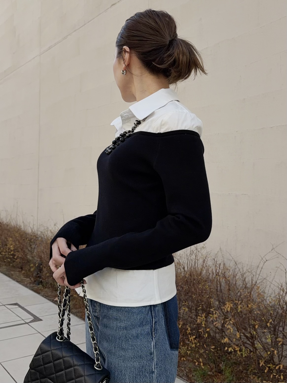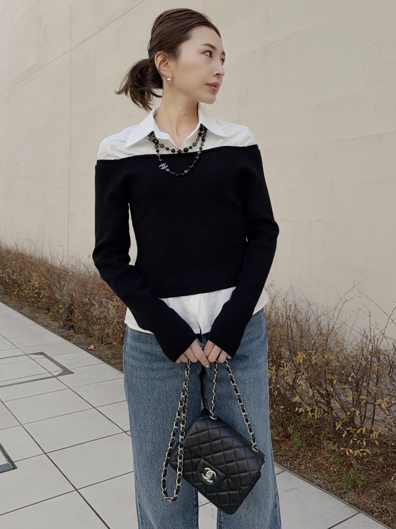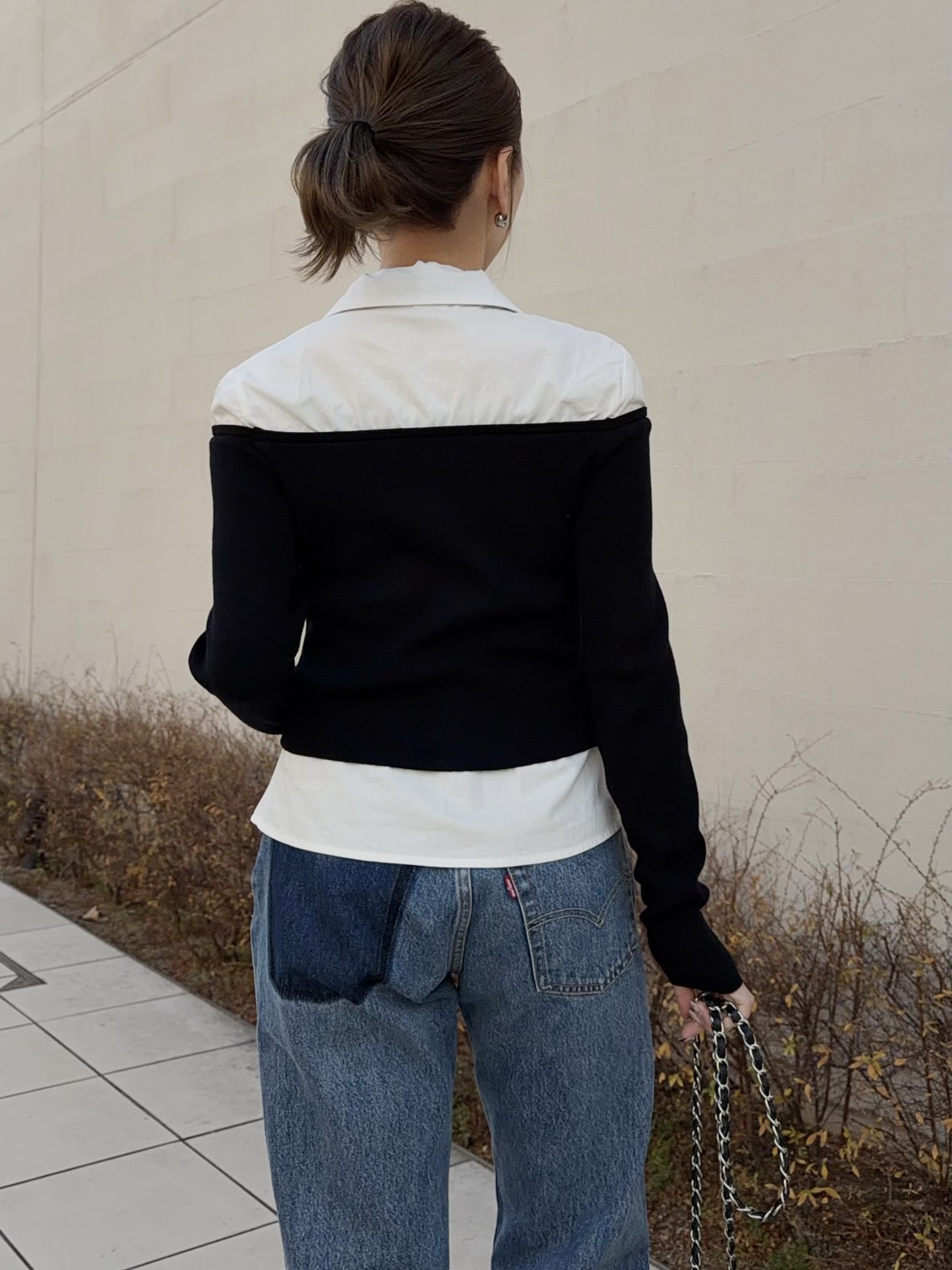 シャツにオフショルダーニットをレイヤードさせたユニークなブラウス。