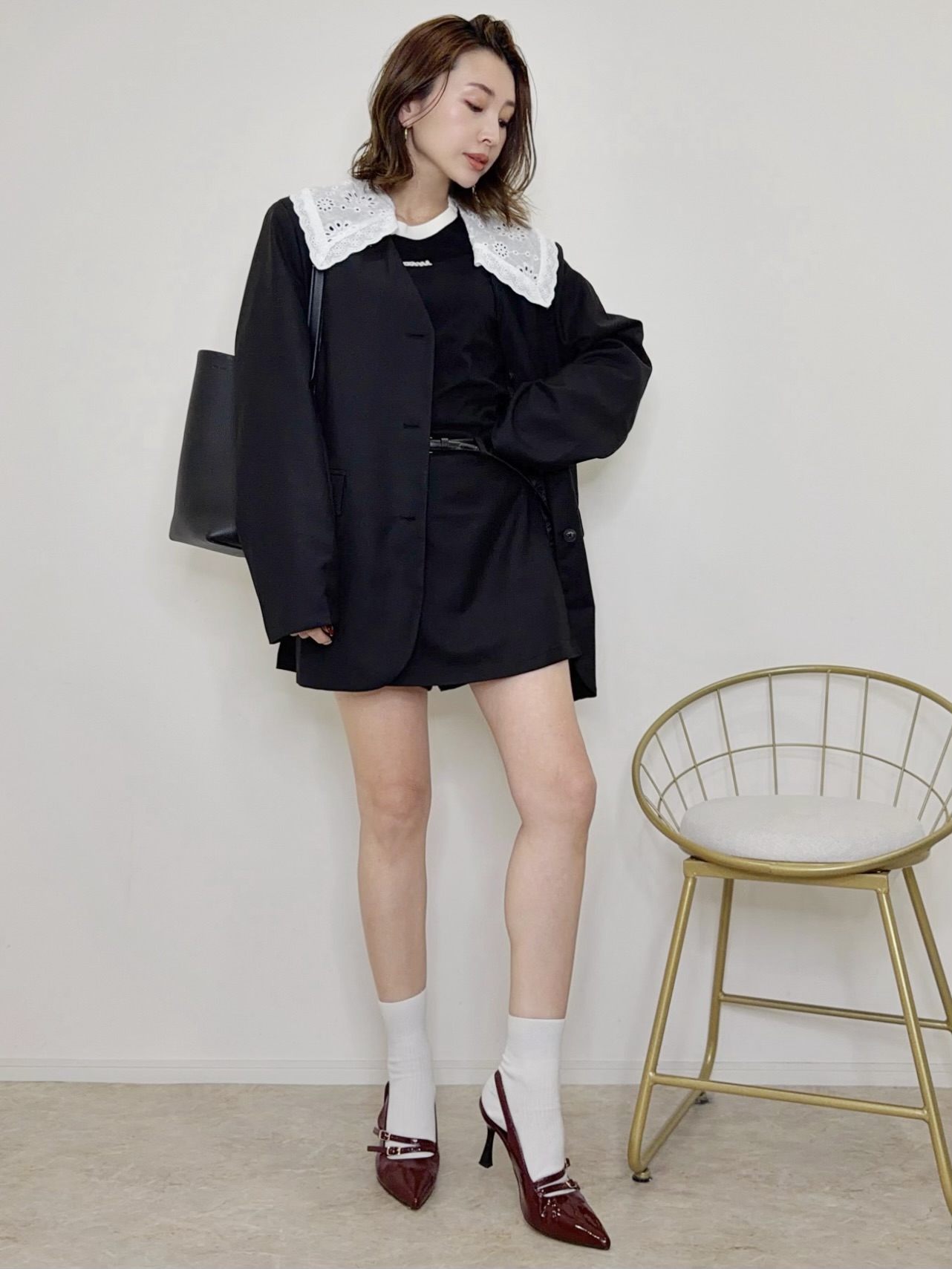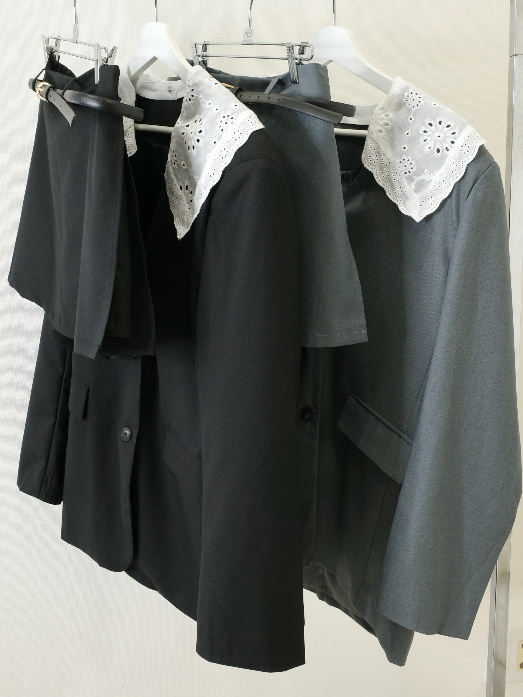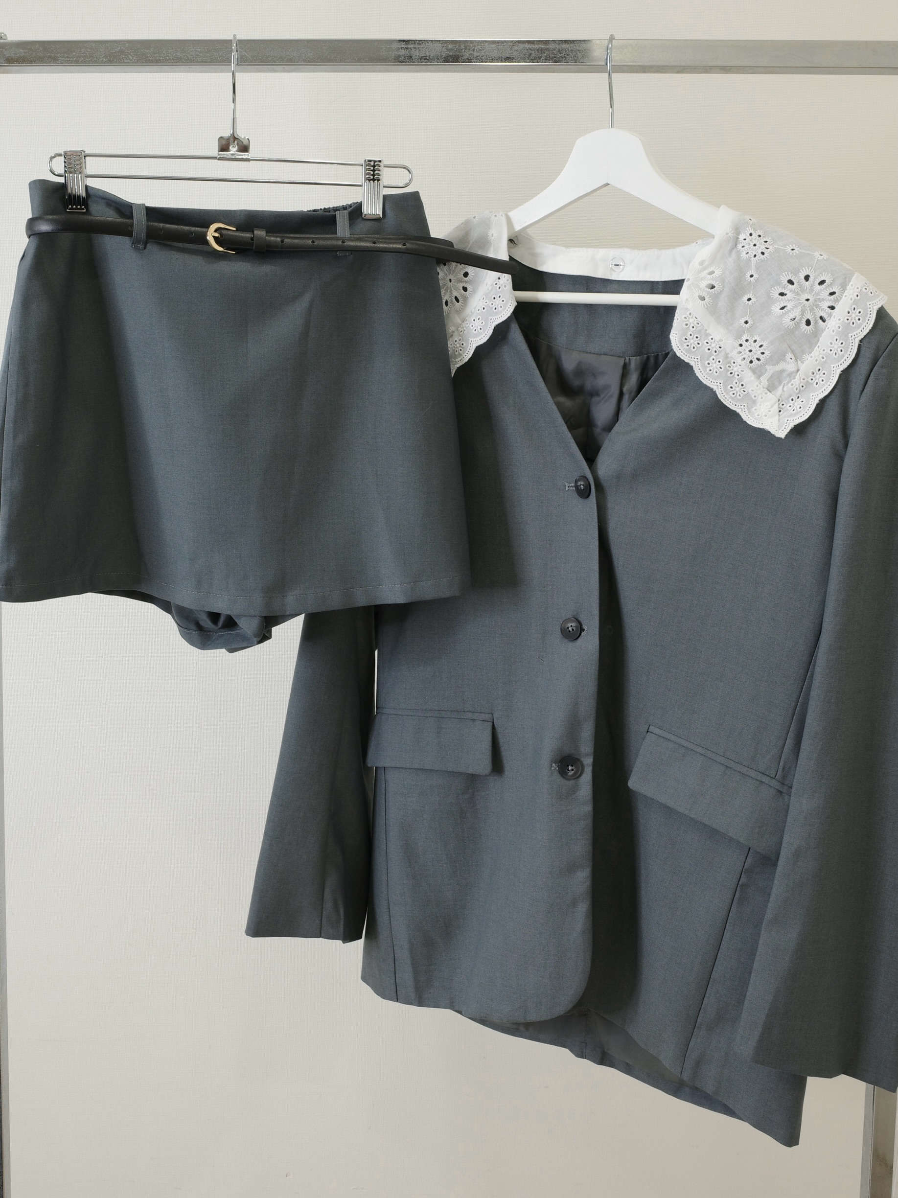 大人可愛いフリルの襟がポイントのジャケットセットアップ♡シアータイツやソックスと合わせて素敵な春コーデが完成♡セットになったボトムスはスコートになっていて安心◎ウエストはゴムで楽々です。ゆとりのあるシルエットで細見えします。セットアップとして着用するのはもちろん、ジャケットとスコートは単体でも着用出来て着回し力も抜群。襟は取外し可能なのでシンプルなジャケットとしても着用可能◎何通りものスタイルを楽しめる欲張りさんにオススメの一着です。ブラックとグレーの2カラー展開です。STAFF:158cm【サイズ】(平置き採寸)ジャケット/着丈77cm 身幅56cm 肩幅46cm 袖丈63cm スコート/ウエスト36cm(後ろ部分はゴムで伸縮) スカート丈34cm【素材】ポリエステル65%,レーヨン35%■クロネコ代金後払いをご利用のお客様■商品到着後に請求書(払込用紙)が到着します。14日以内にお支払いをお願いします。全国の主要なコンビニで、請求書をレジに持っていくだけでお支払いが可能です。全国の郵便局でも同じ請求書でお支払いできます。※ご請求書が圧着ハガキタイプの場合、郵便局でのお支払いはできません。※弊社の銀行口座宛にお振込頂くものでは御座いません。ご注意下さい。