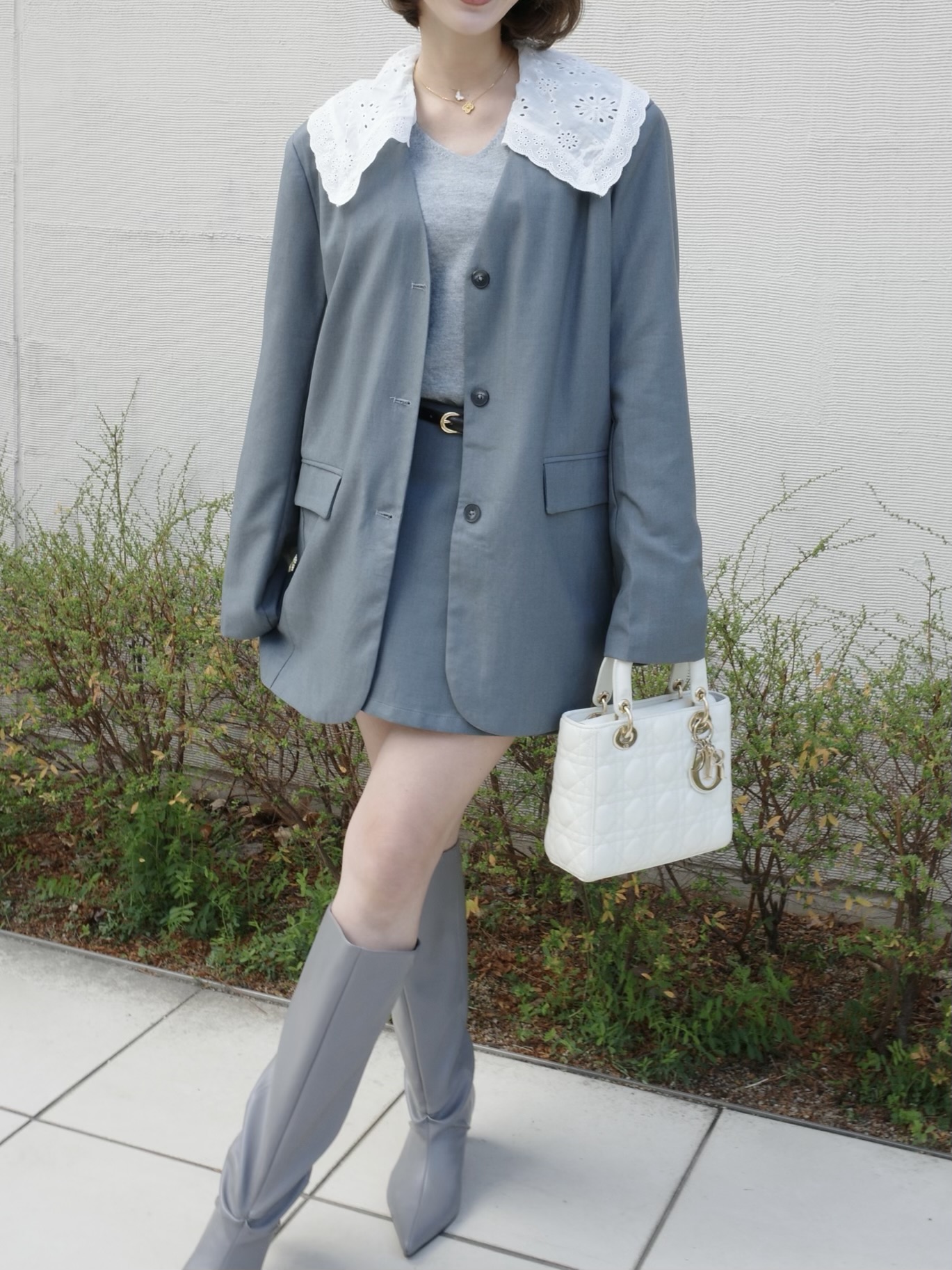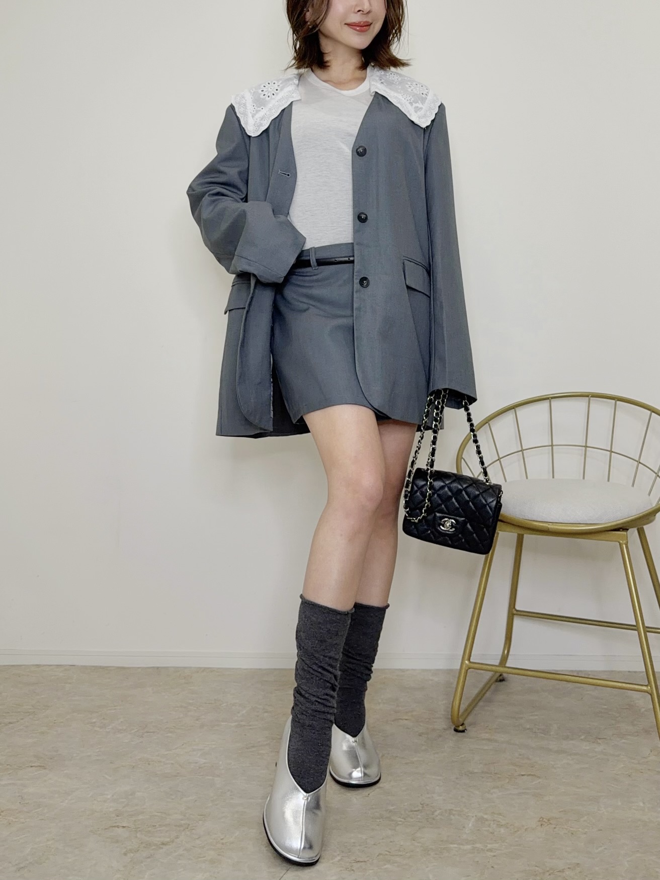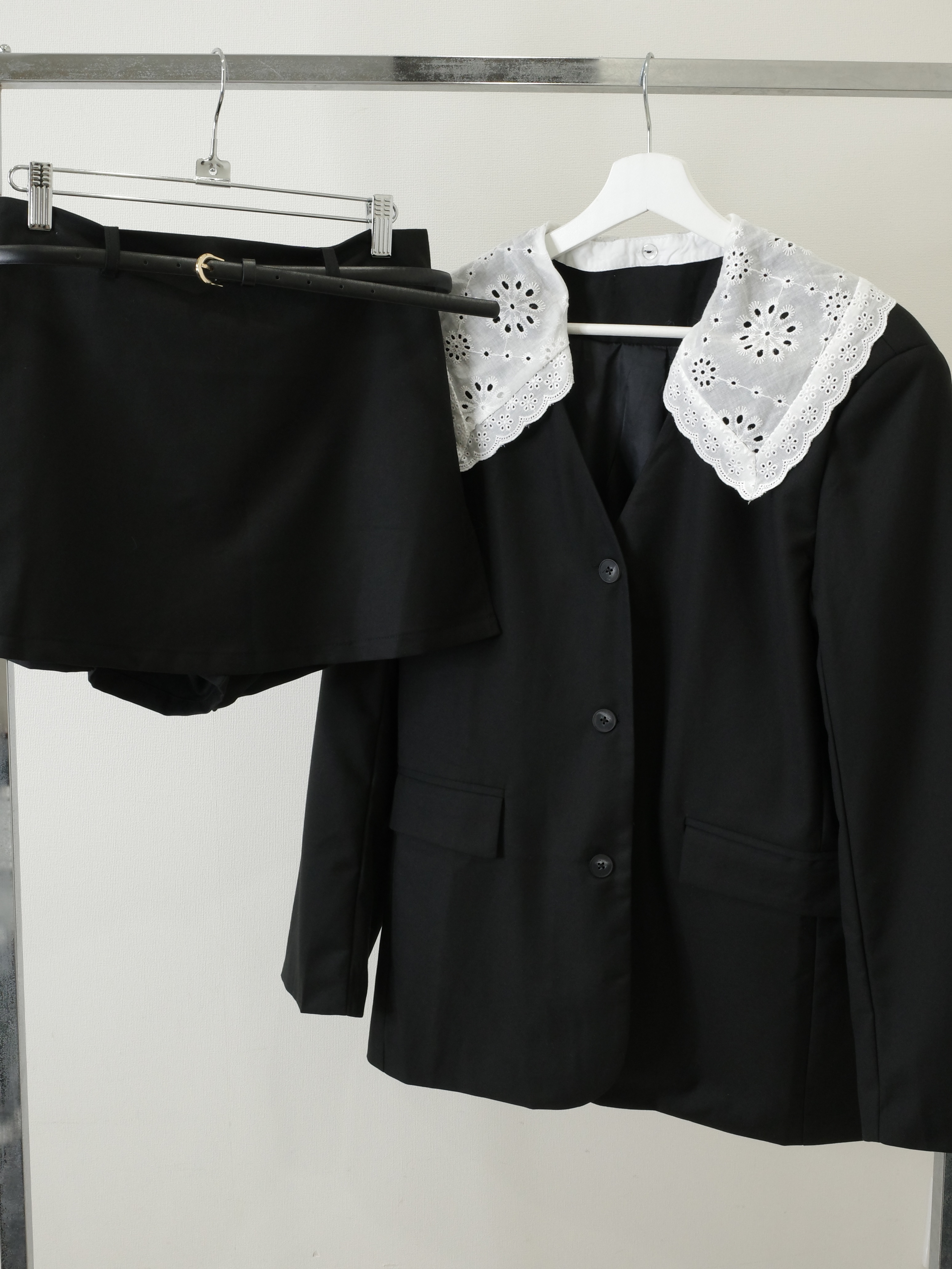大人可愛いフリルの襟がポイントのジャケットセットアップ♡