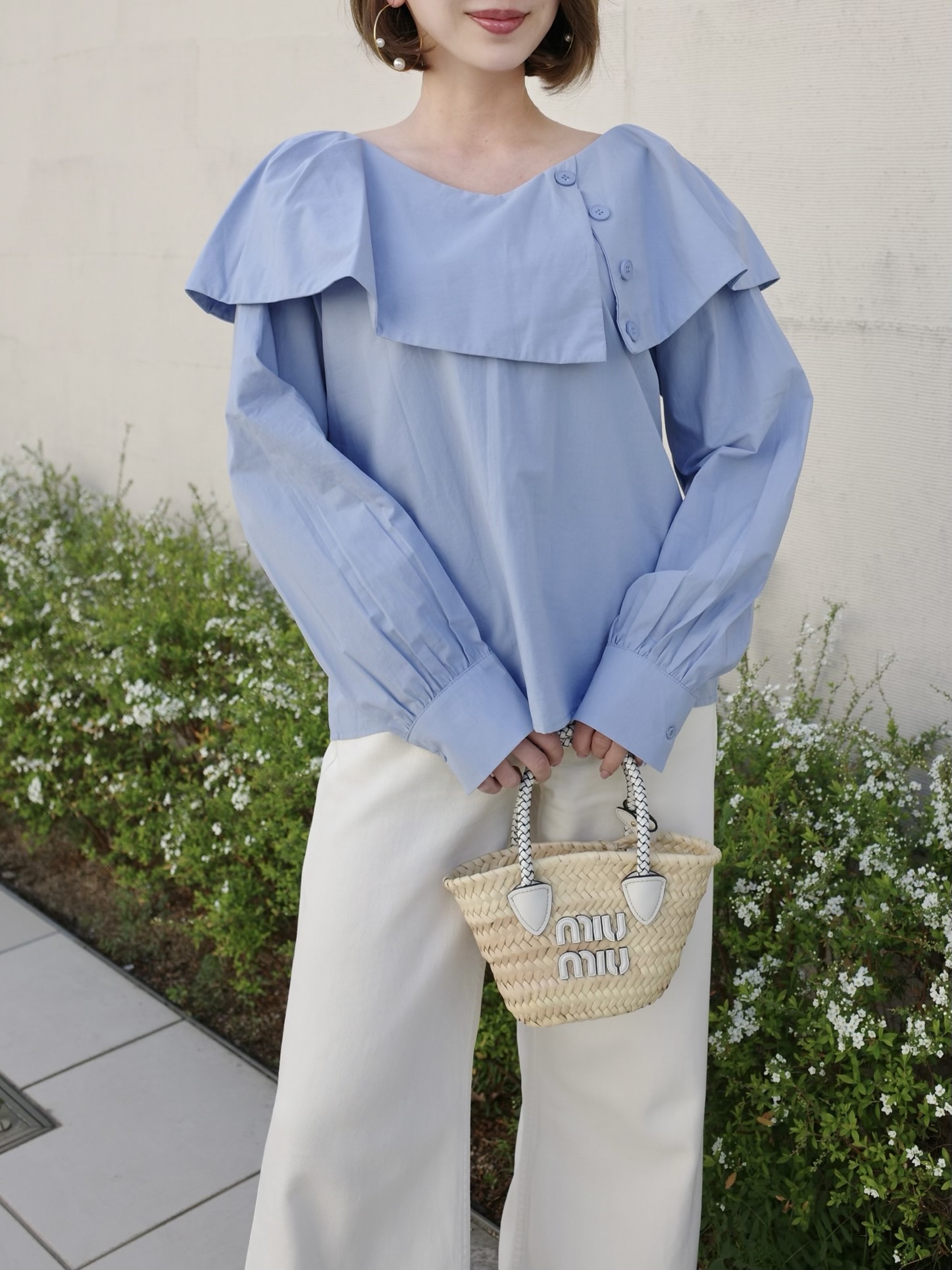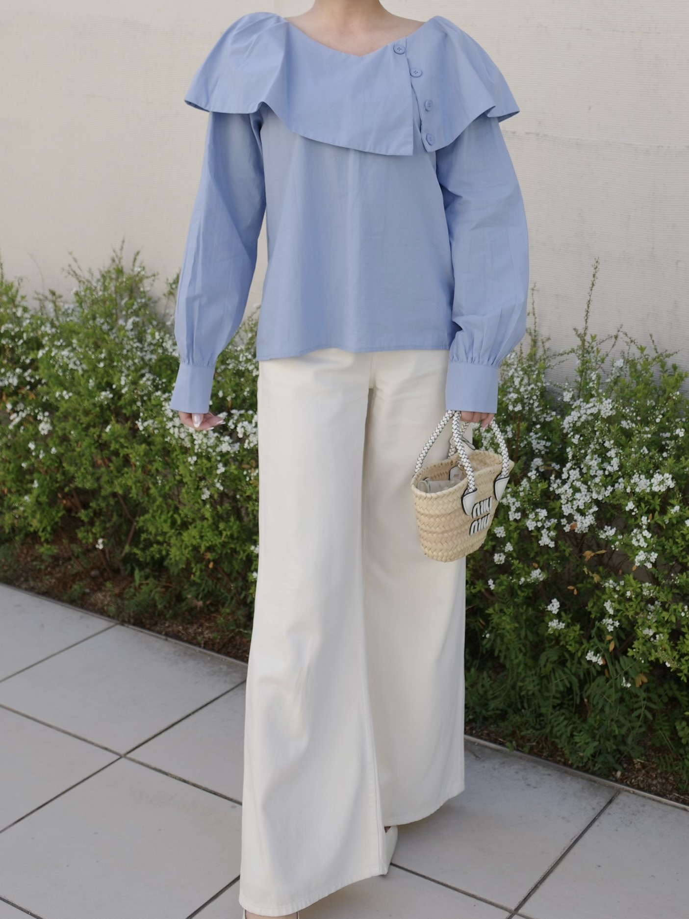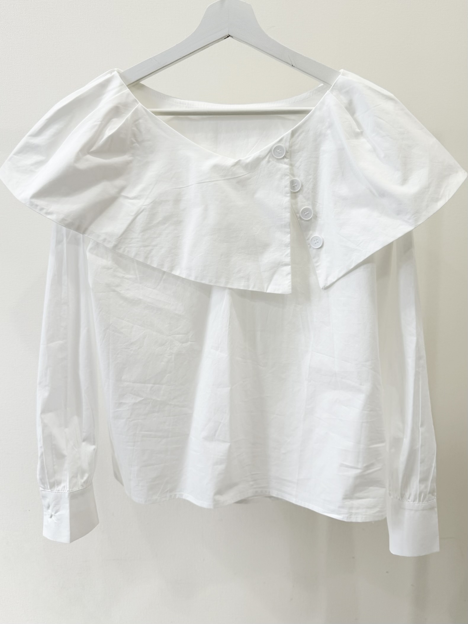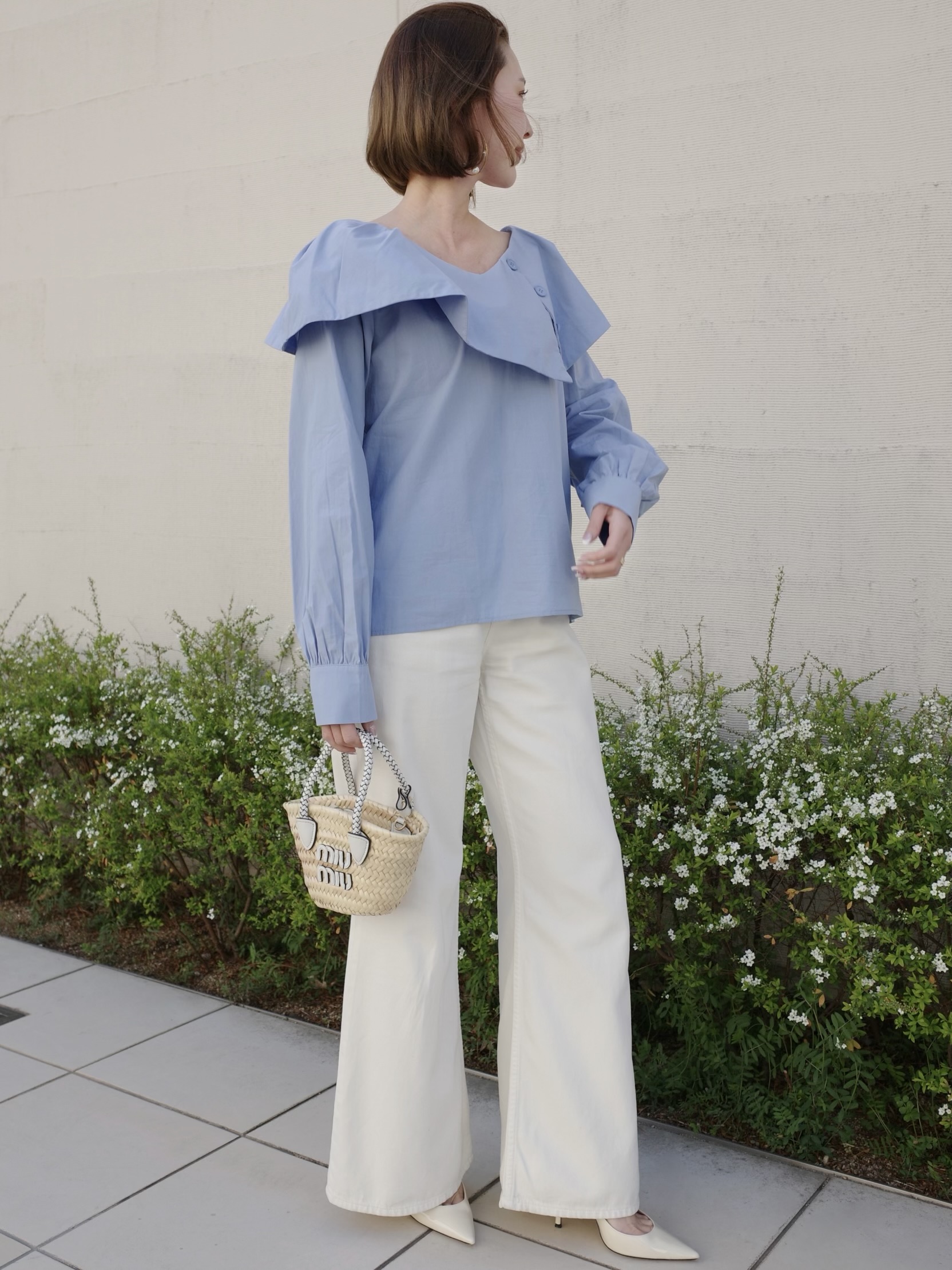 シンプルながらも1枚で着映えするブラウス。動く度軽やかに揺れる襟がポイント。スラックスやデニムなどボトムスを選ばないデザイン。程よい襟ぐりの開きでデコルテを美しく見せます。ふわっとした袖のデザインで気になる二の腕もさり気なくカバー。ホワイトと落ち着いた色味のサックスブルーの2カラー展開です。※こちらの商品を単体で1点のみご注文頂いた場合、ネコポス配送(385円)にて発送が可能です。ご希望の方はご注文時にメッセージ欄にネコポス希望とご記入をお願いします。STAFF:158cm【サイズ】(平置き採寸)着丈54cm(後ろ56cm) 身幅54cm 袖丈58cm【素材】コットン60%,レーヨン40%■クロネコ代金後払いをご利用のお客様■商品到着後に請求書(払込用紙)が到着します。14日以内にお支払いをお願いします。全国の主要なコンビニで、請求書をレジに持っていくだけでお支払いが可能です。全国の郵便局でも同じ請求書でお支払いできます。※ご請求書が圧着ハガキタイプの場合、郵便局でのお支払いはできません。※弊社の銀行口座宛にお振込頂くものでは御座いません。ご注意下さい。