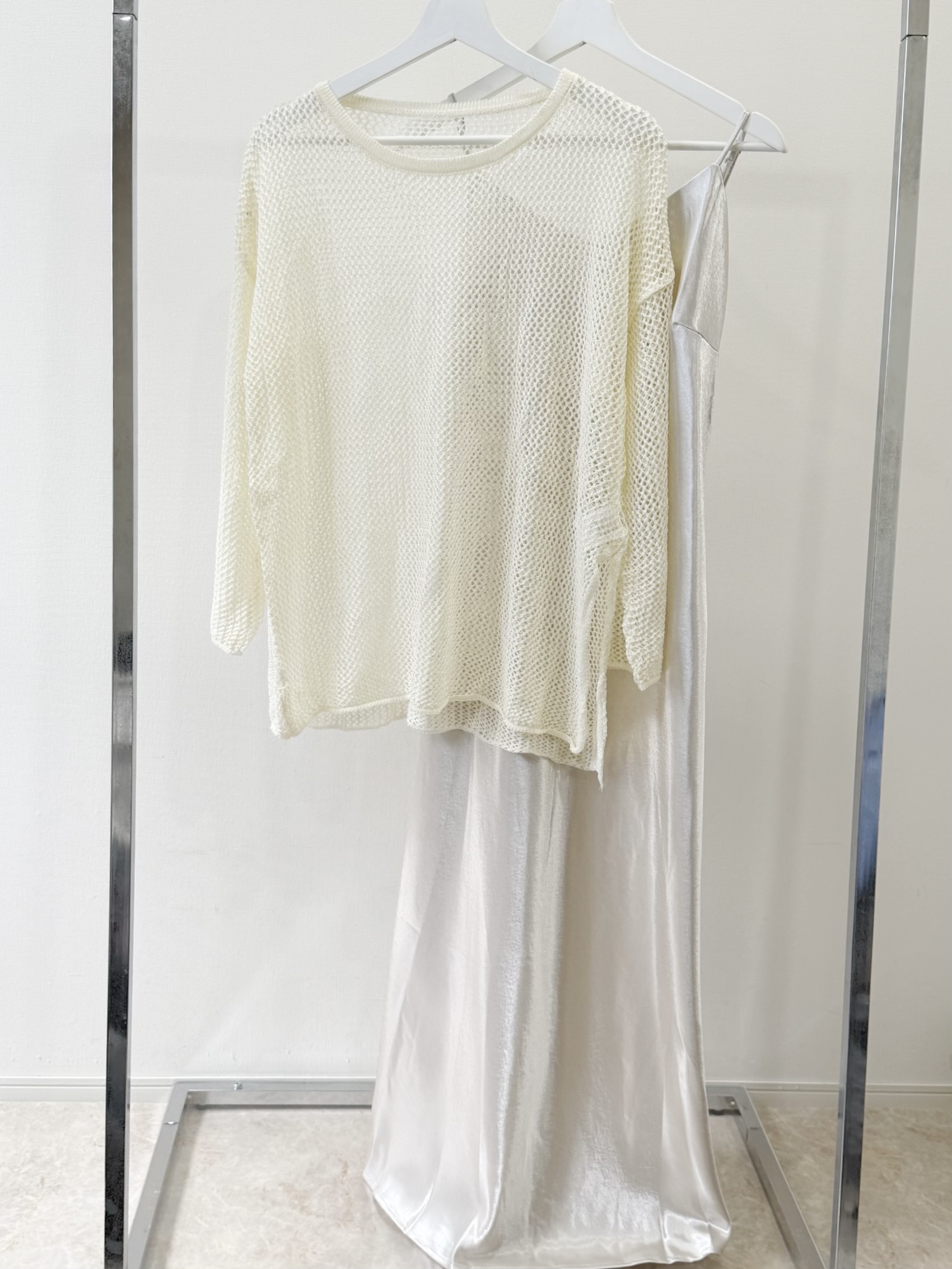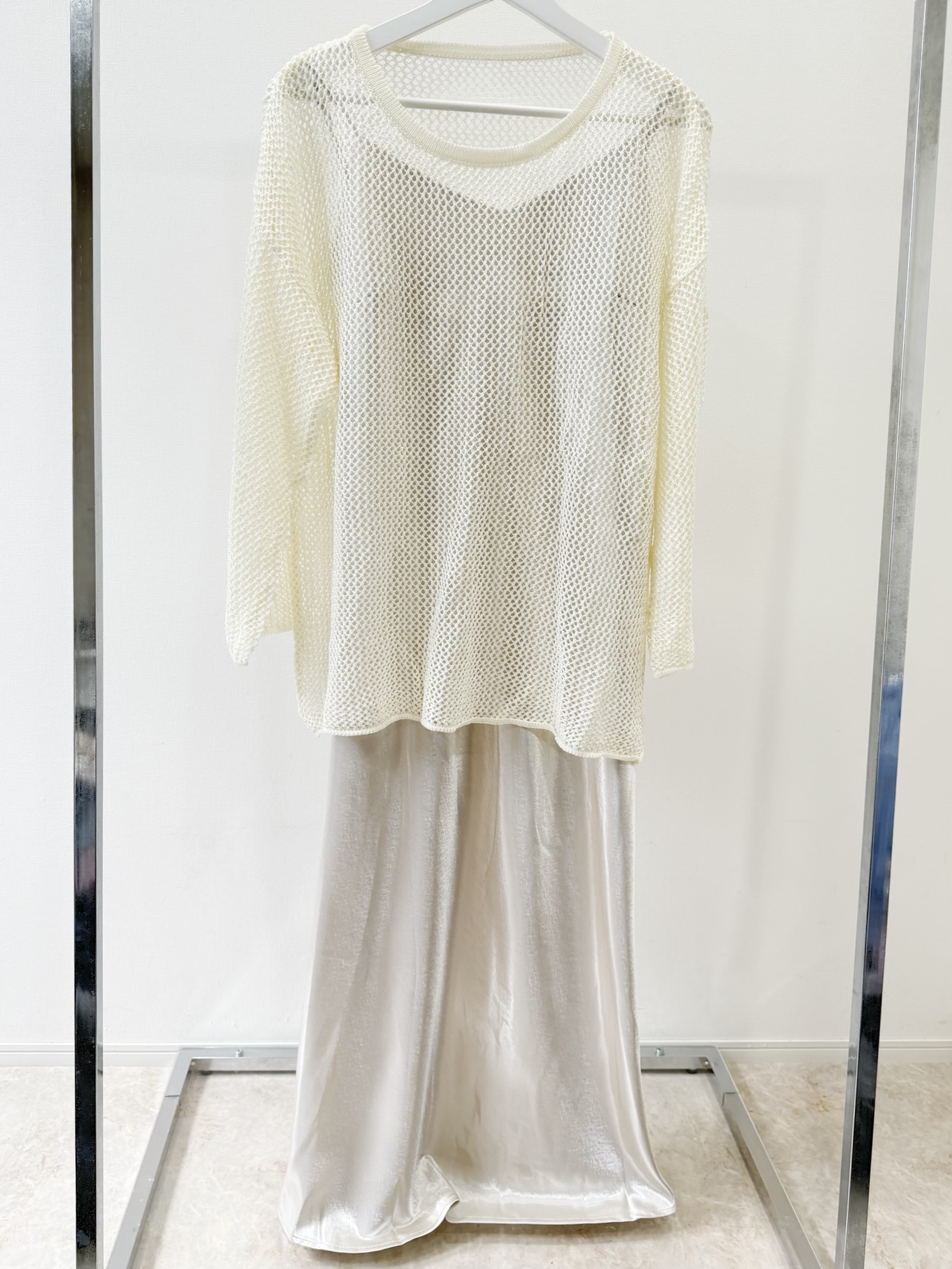メッシュトップスがセットになったリラックス感漂うサテンワンピース。