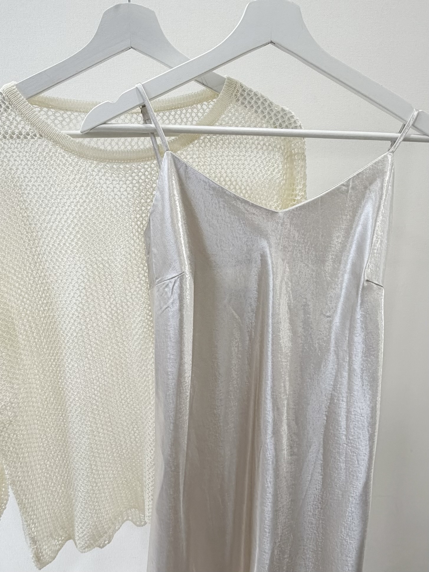 メッシュトップスがセットになったリラックス感漂うサテンワンピース。上品で柔らかな雰囲気のクリーム×シャンパンゴールドの色合わせが春夏にぴったり。動くたび揺れる光沢のあるドレープが春夏の太陽の下で映えます♡しっかりとしたサテン地で下着のラインも響きにくいのもポイント。付属のベルトでウエストマークすると更に女性らしく。身体のラインをカバーしてくれるゆるシルエットで細見えも叶えます。セットで着用するのはもちろん単体でも着用出来て着回し力も抜群。色んなスタイルを楽しめる欲張りさんにオススメの一着です。STAFF:158cm【サイズ】(平置き採寸)トップス/着丈54cm 身幅57cm 肩幅59cm 袖丈53cm ワンピース/着丈130cm(ストラップを最長にして計測/ここから短くできます) 身幅47cm【素材】ポリエステル65%,レーヨン35%■クロネコ代金後払いをご利用のお客様■商品到着後に請求書(払込用紙)が到着します。14日以内にお支払いをお願いします。全国の主要なコンビニで、請求書をレジに持っていくだけでお支払いが可能です。全国の郵便局でも同じ請求書でお支払いできます。※ご請求書が圧着ハガキタイプの場合、郵便局でのお支払いはできません。※弊社の銀行口座宛にお振込頂くものでは御座いません。ご注意下さい。