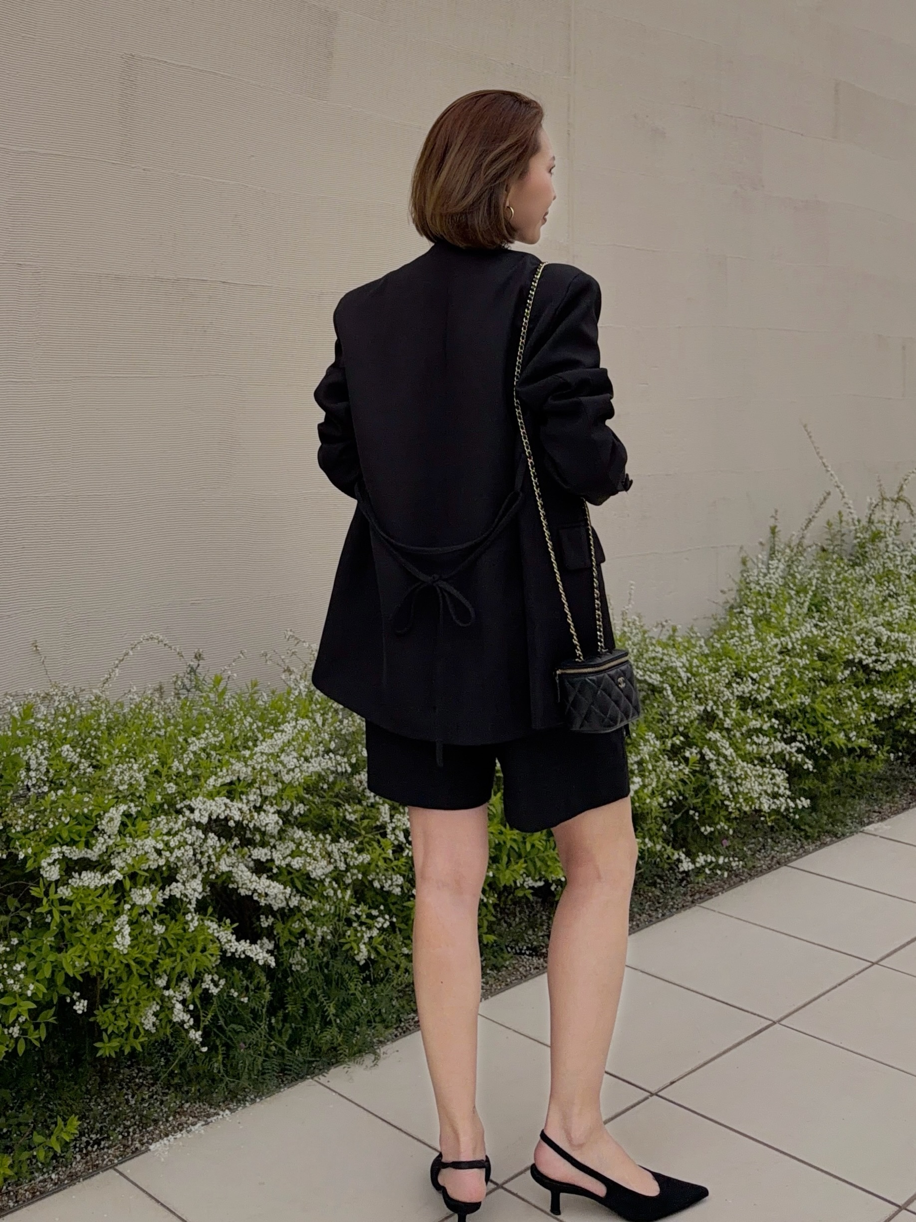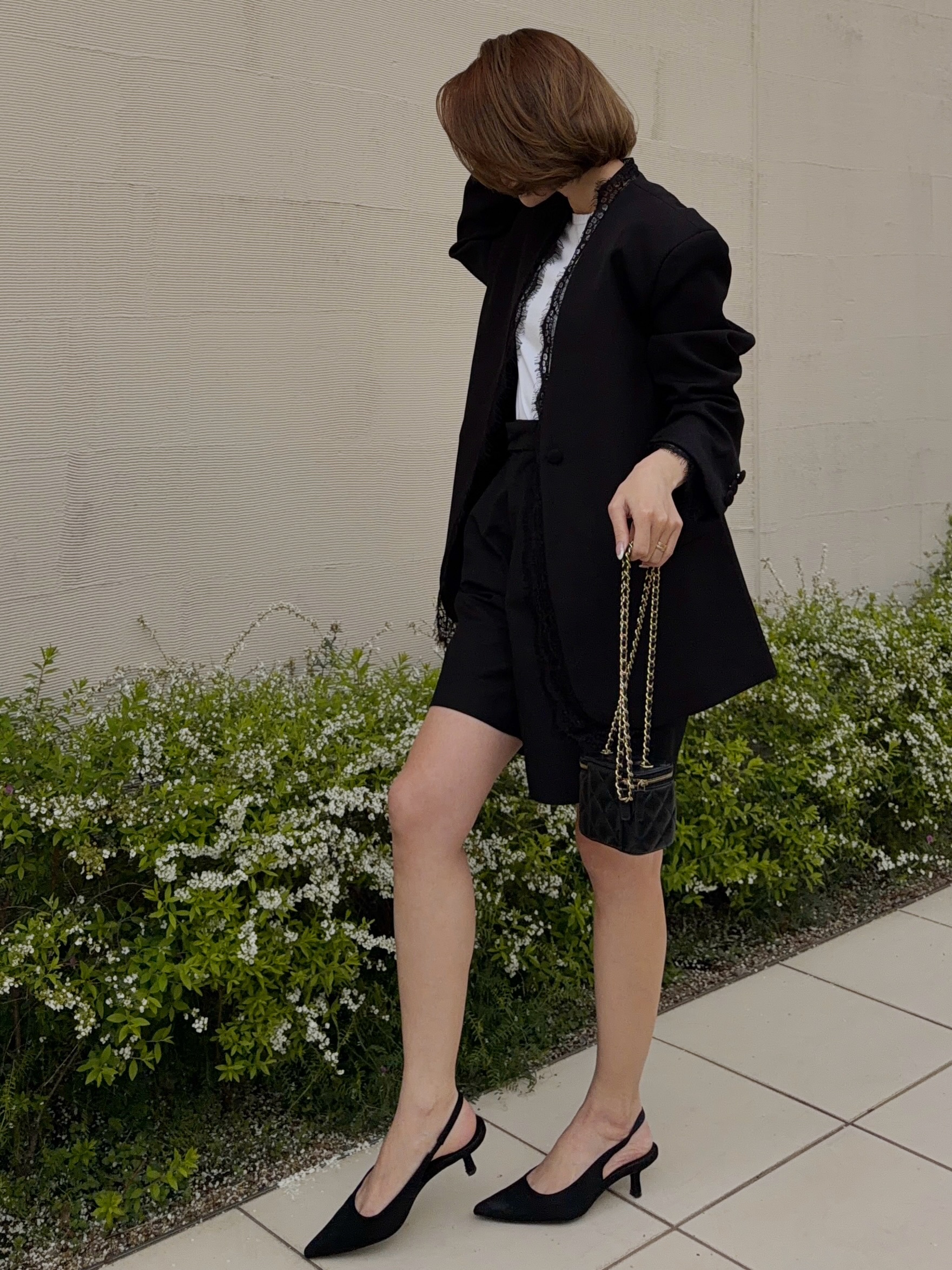 クールでマニッシュな印象のジャケットスタイルも女性らしい雰囲気に。