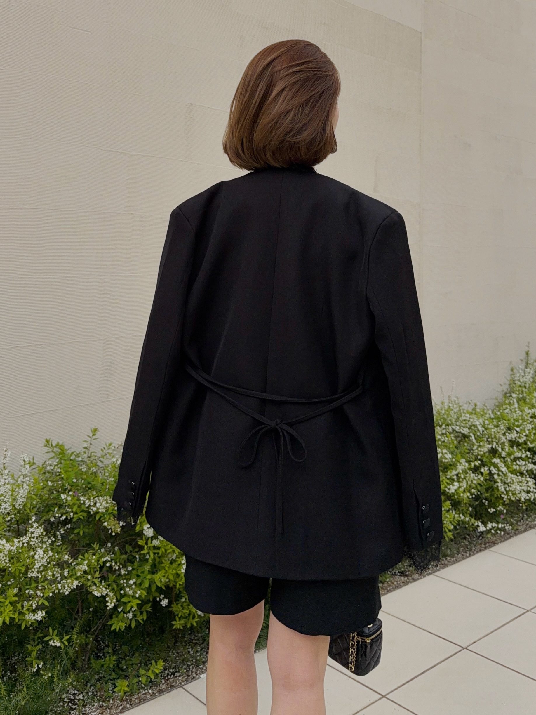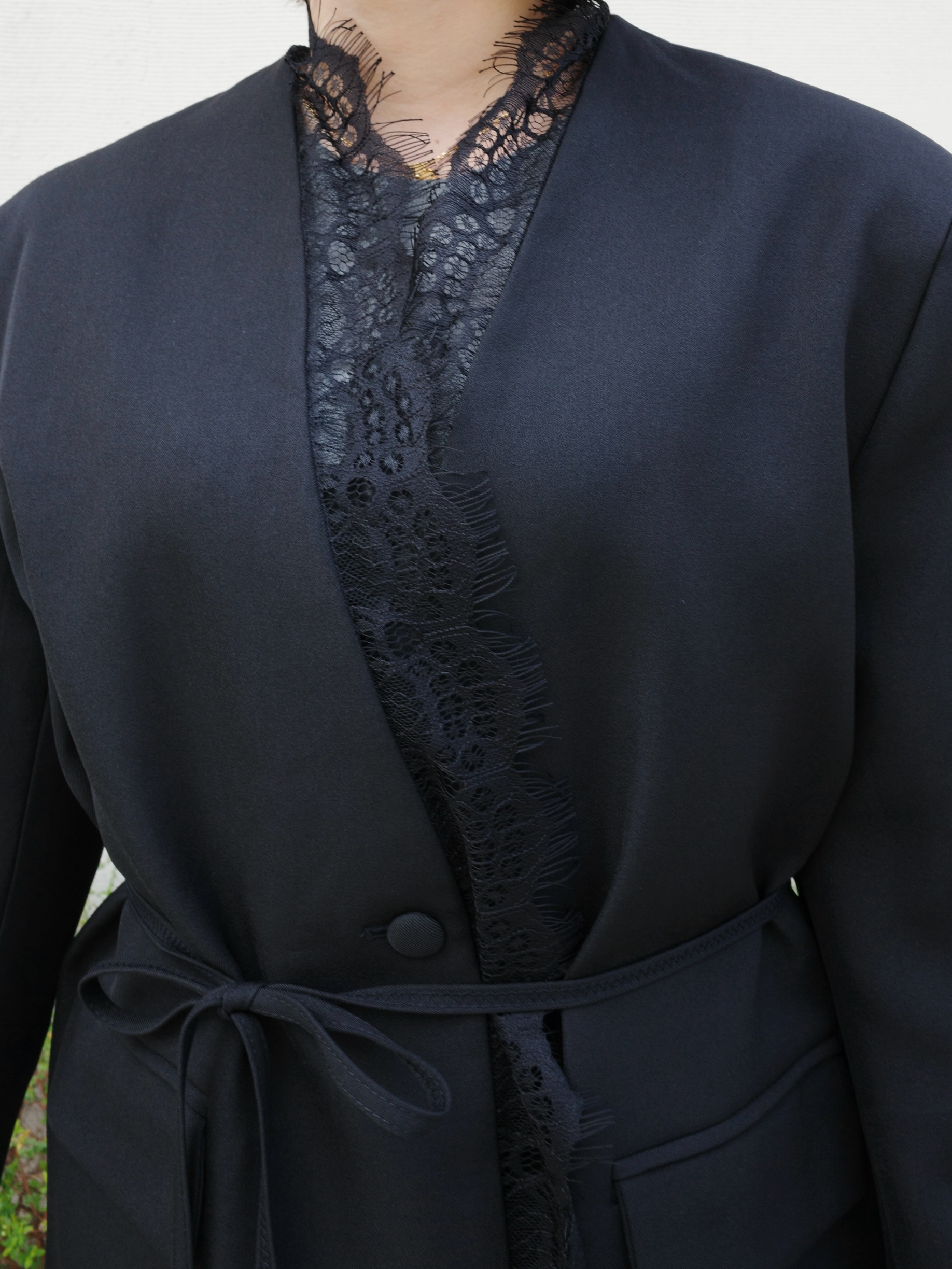 【ご好評につき再入荷♡】レース使いがフェミニンな雰囲気を演出するきれい目ジャケット。クールでマニッシュな印象のジャケットスタイルも女性らしい雰囲気に。ブラックとアイボリーの2カラー展開です。しっかりとした素材で高級感もたっぷり。取り外し可能なリボンを結んで着用しても、フロントを開けてラフに着ても素敵な一着です。シンプルなスタイリングに羽織るだけで着映えします。オケージョンシーンにもおすすめです。STAFF:158cm【サイズ】(平置き採寸)着丈72cm 肩幅46cm 身幅58cm 袖丈58cm(レース含む64cm)【素材】ポリエステル100%■クロネコ代金後払いをご利用のお客様■商品到着後に請求書(払込用紙)が到着します。14日以内にお支払いをお願いします。全国の主要なコンビニで、請求書をレジに持っていくだけでお支払いが可能です。全国の郵便局でも同じ請求書でお支払いできます。※ご請求書が圧着ハガキタイプの場合、郵便局でのお支払いはできません。※弊社の銀行口座宛にお振込頂くものでは御座いません。ご注意下さい。