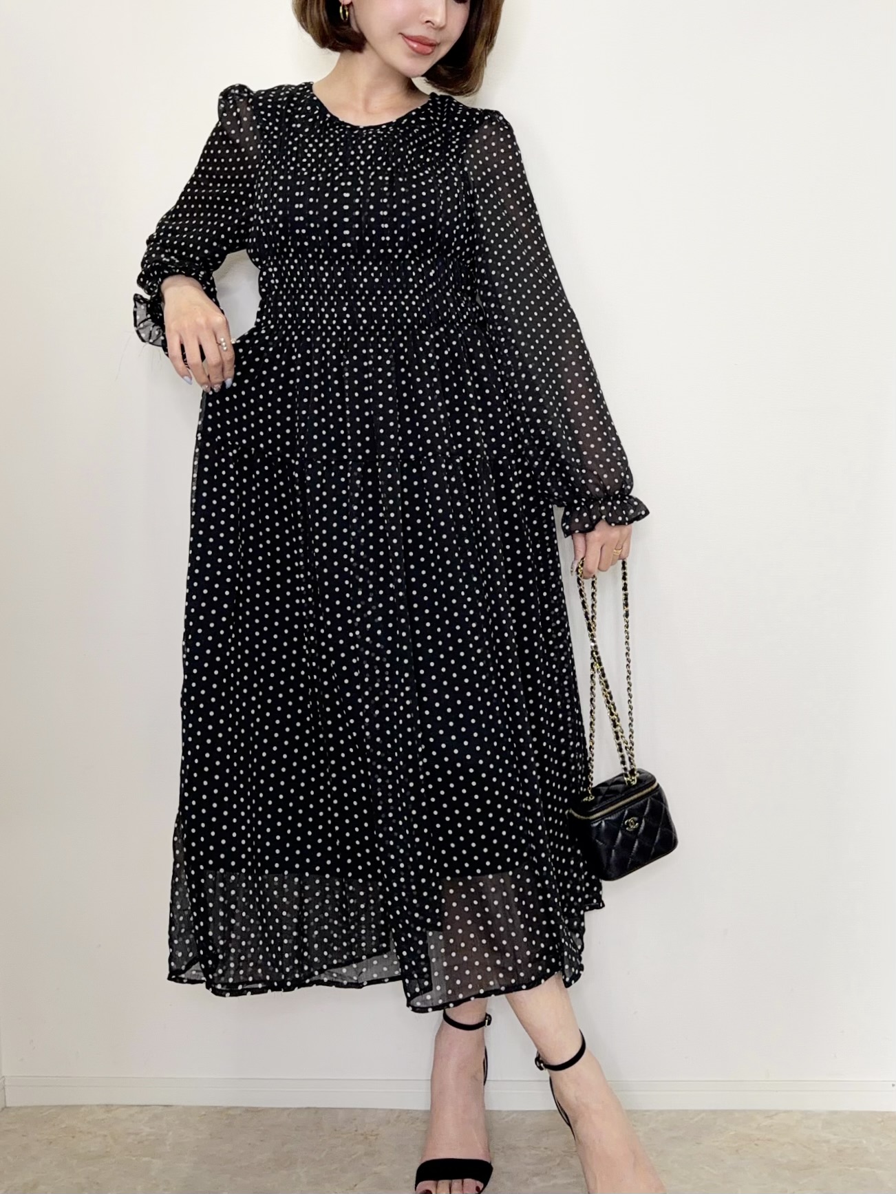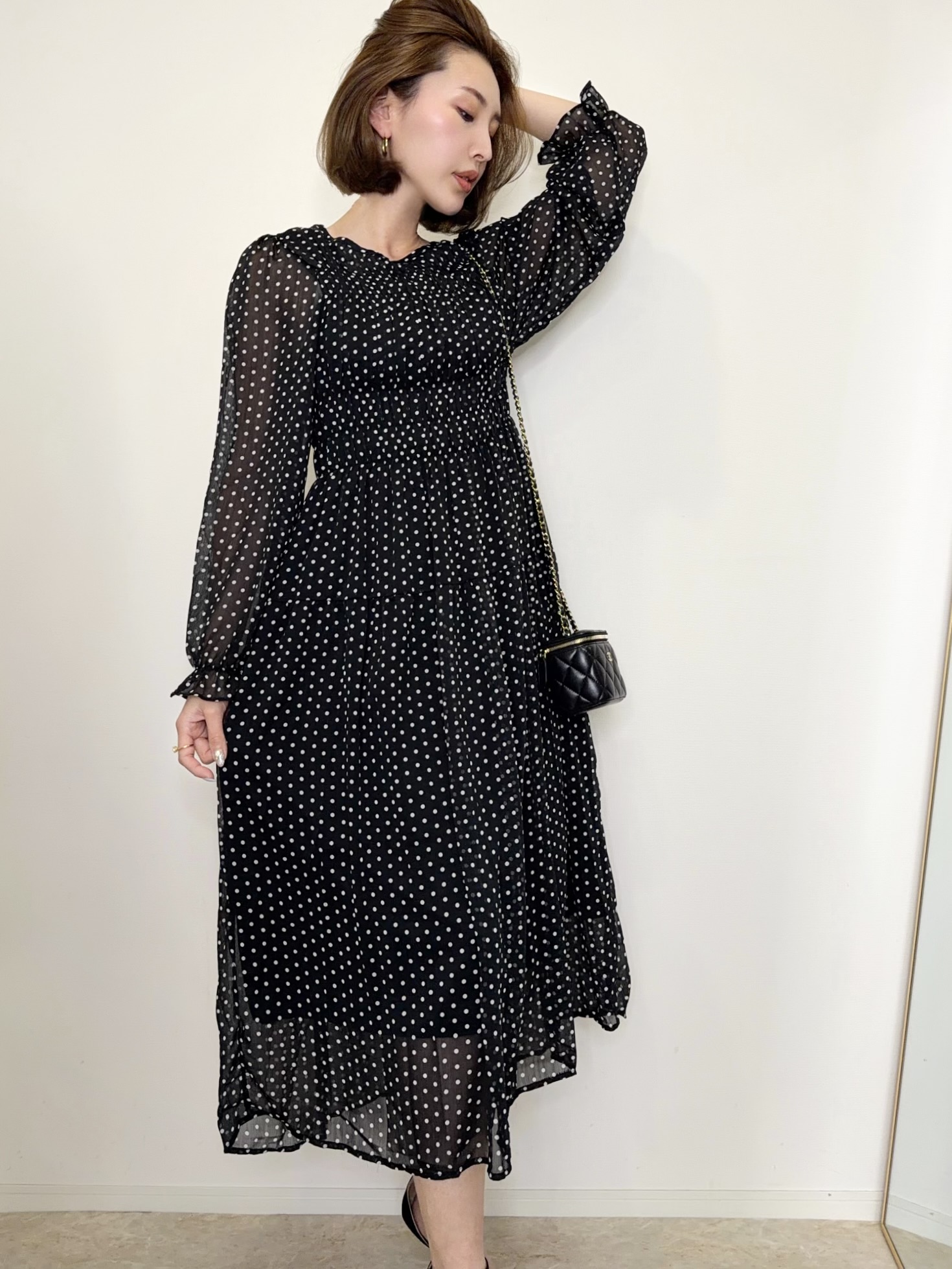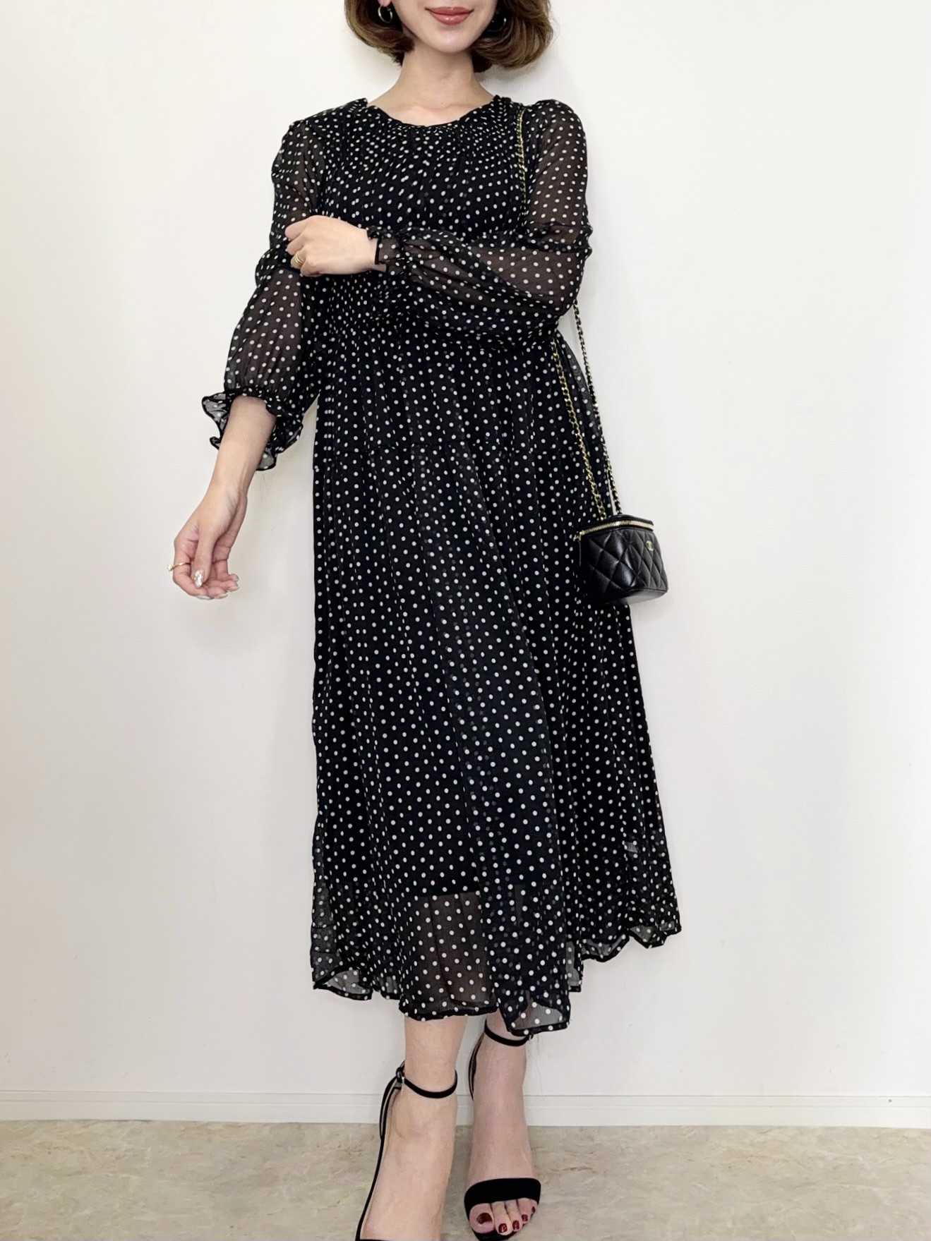 クラシカルで上品な雰囲気のドット柄ワンピース。