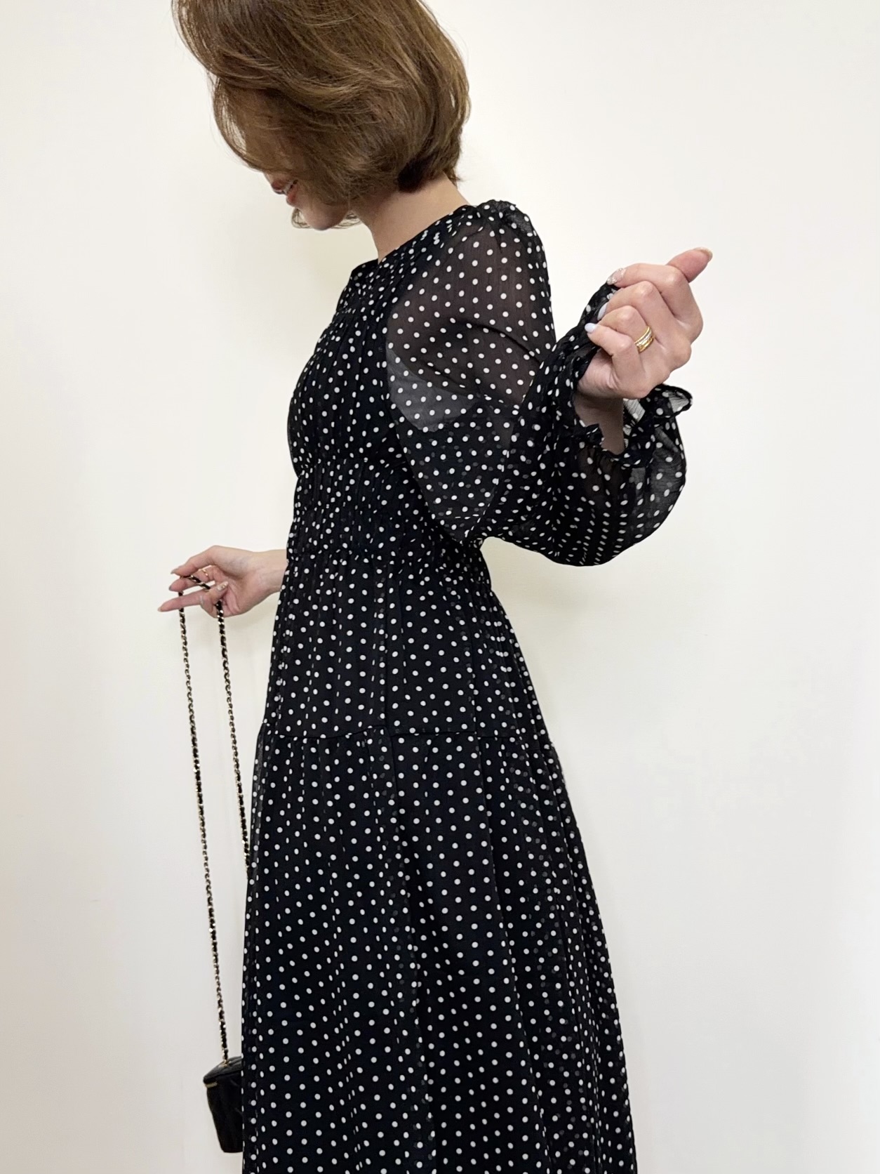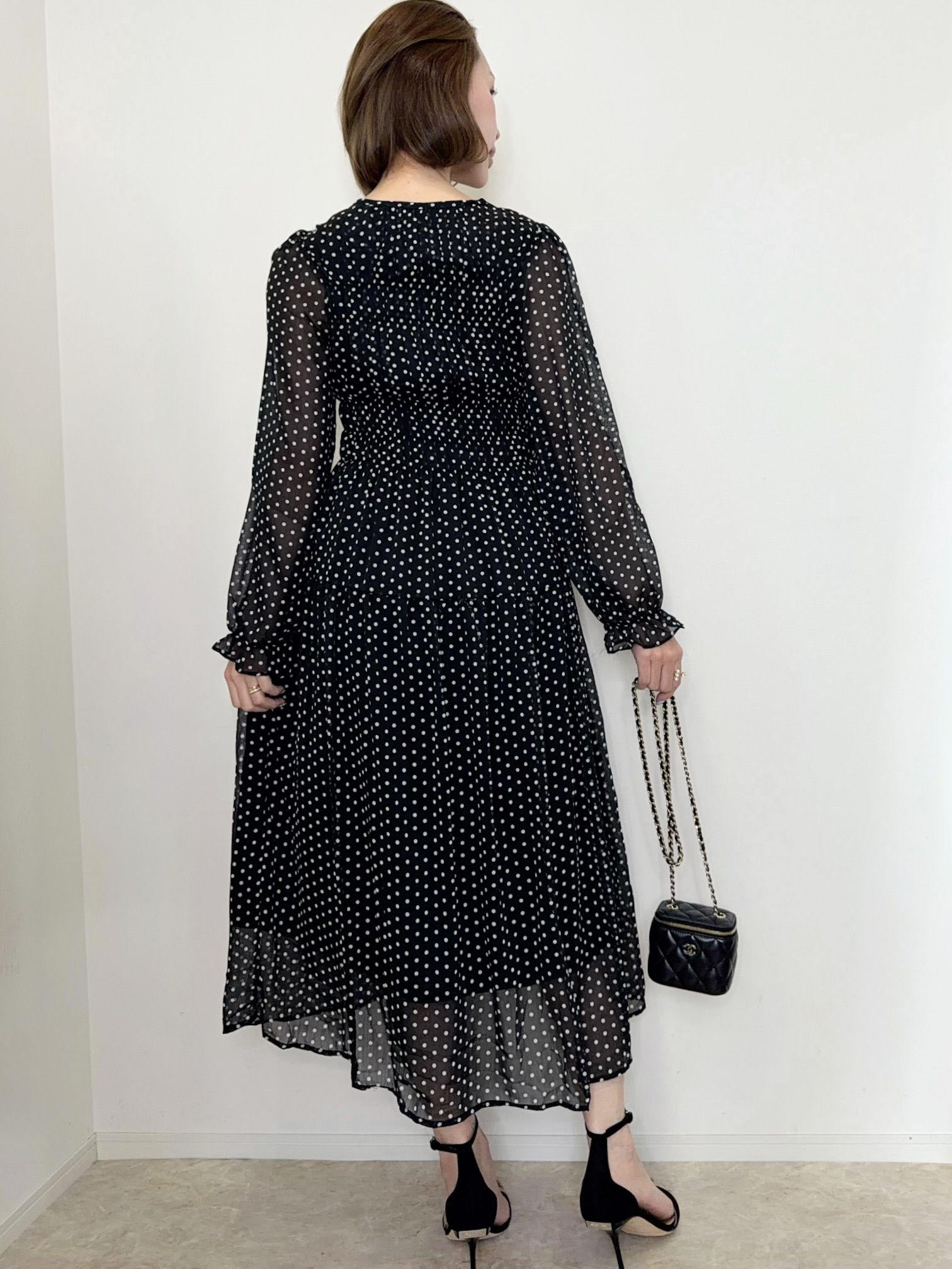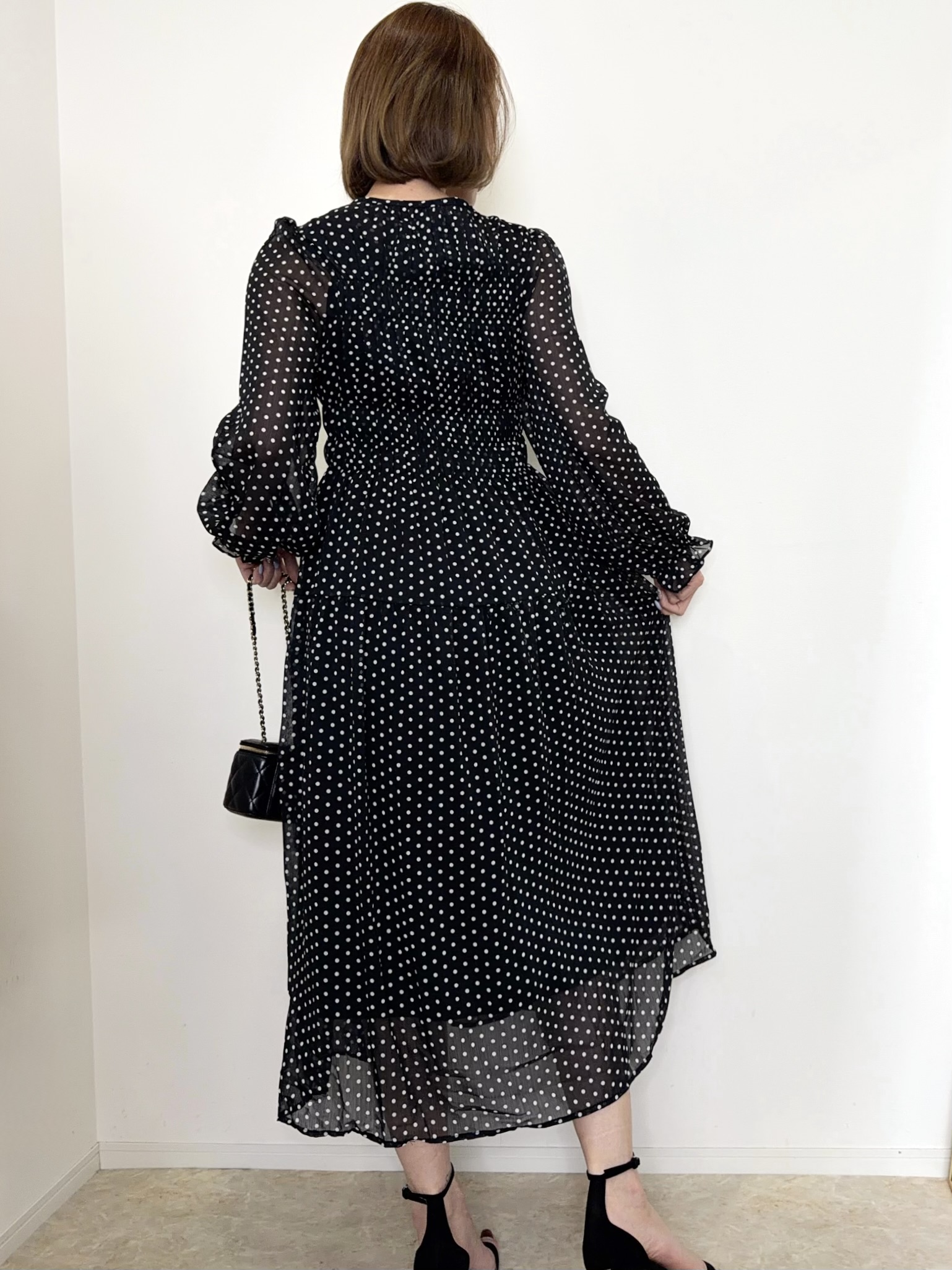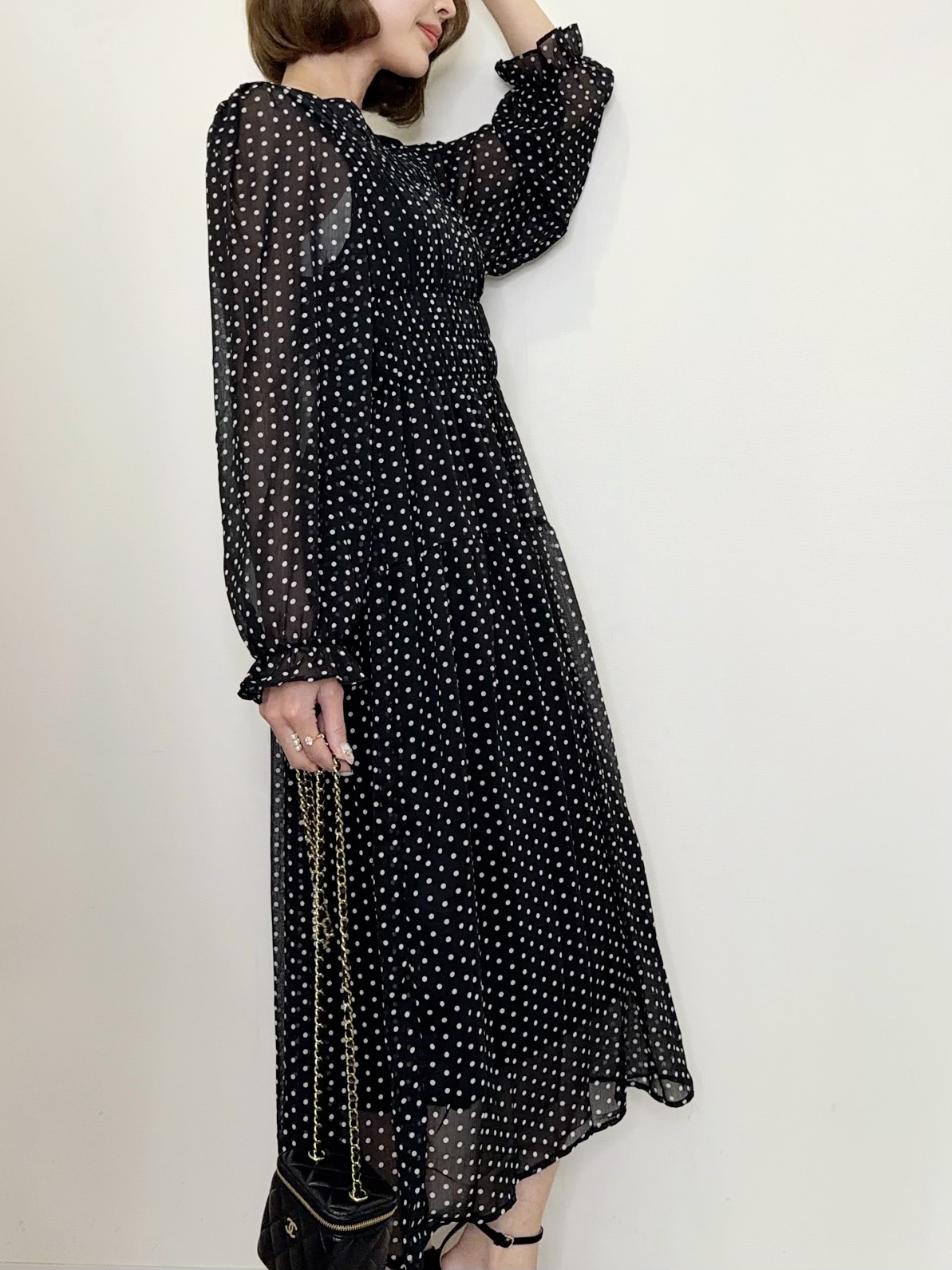 クラシカルで上品な雰囲気のドット柄ワンピース。
