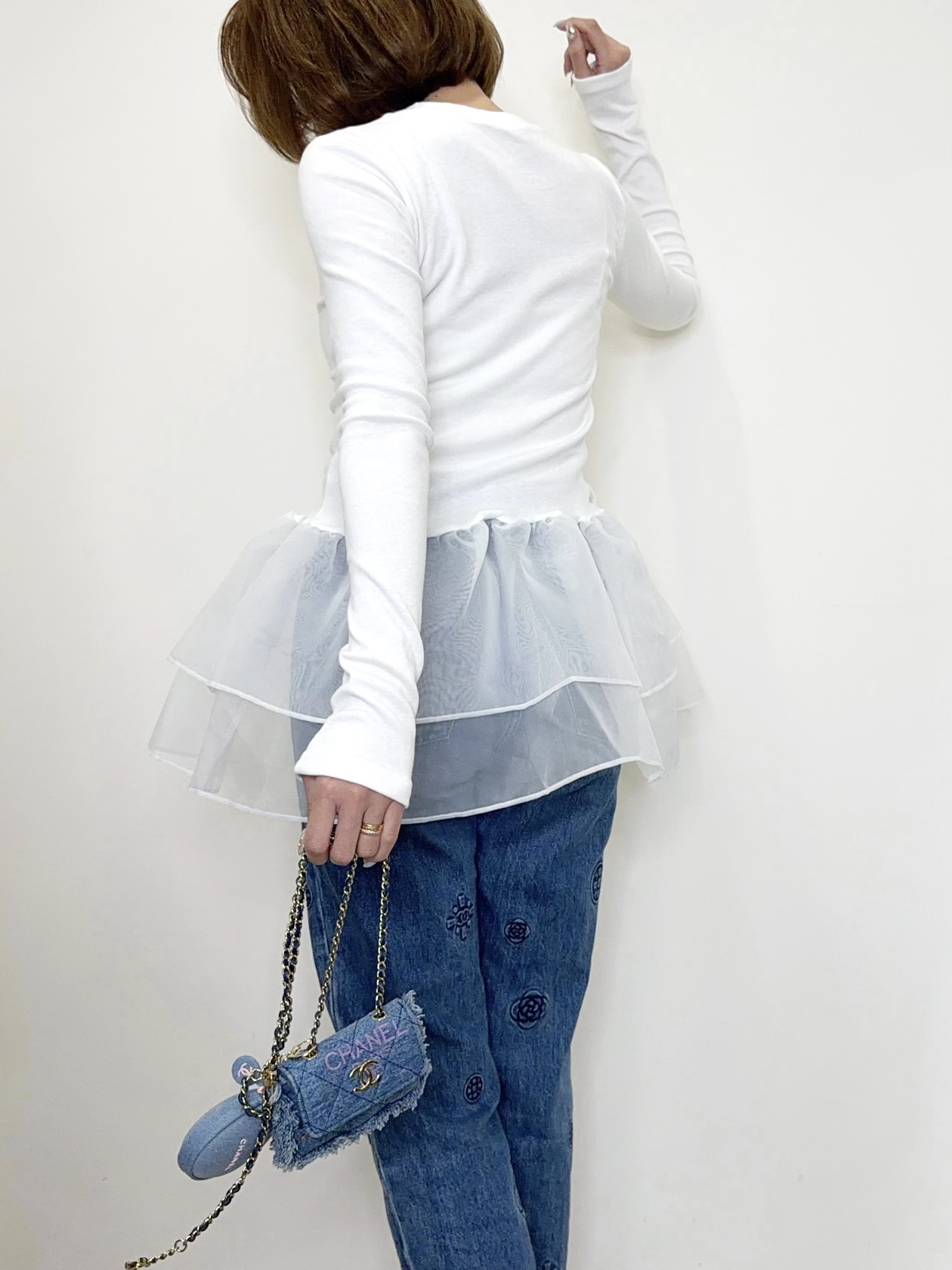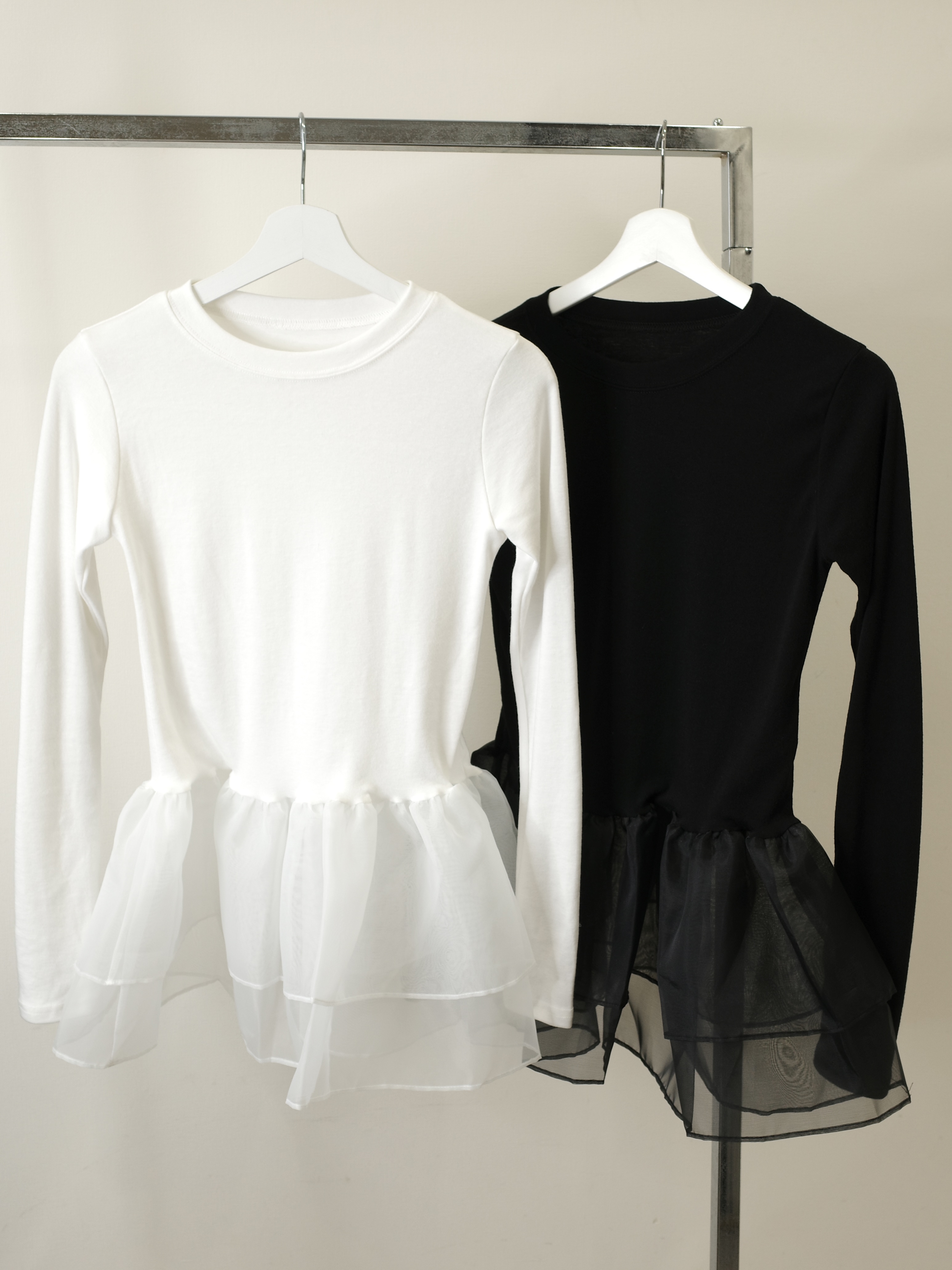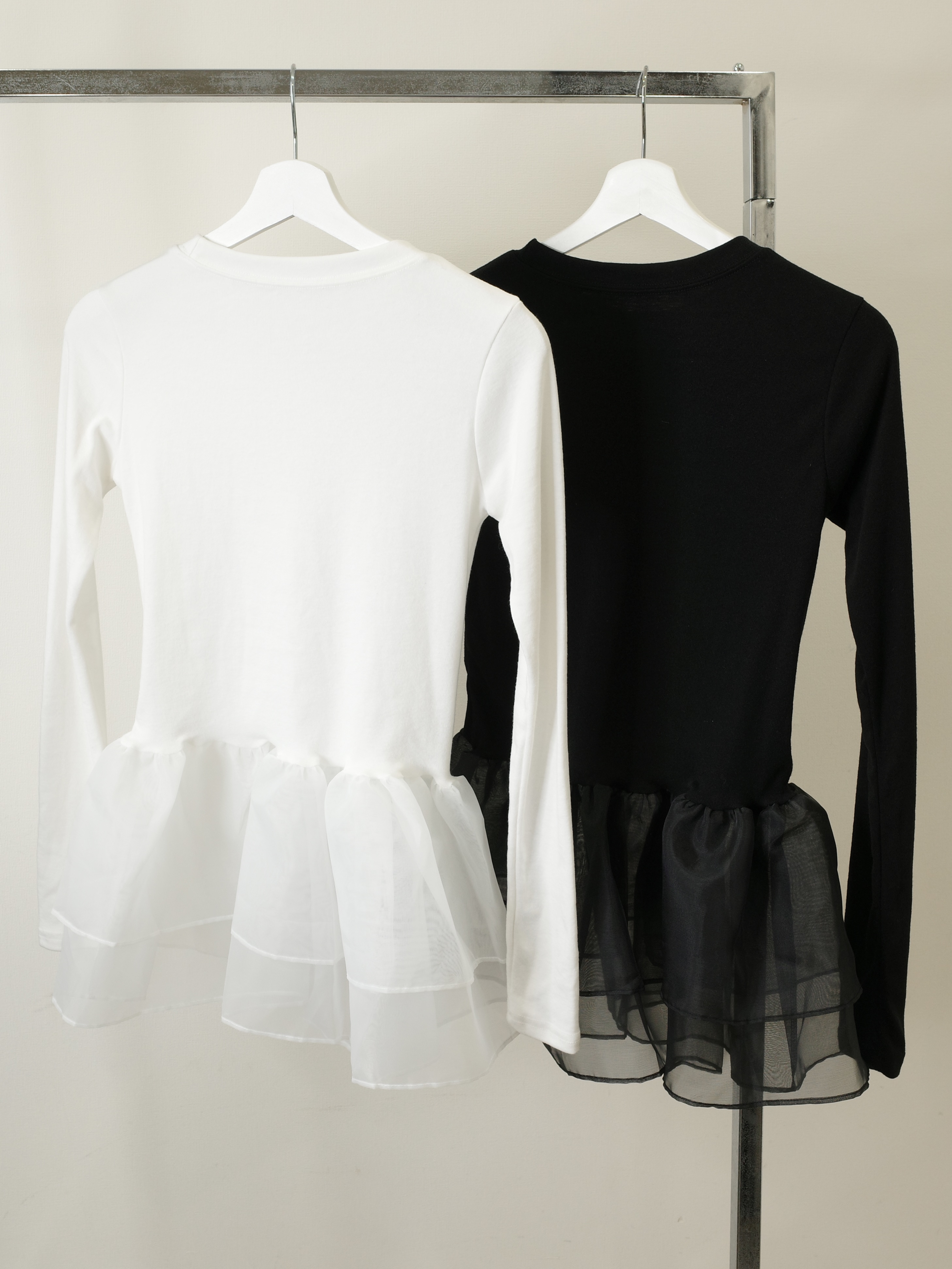 オーガンジーの立体的なフリルが目を引くトップス。